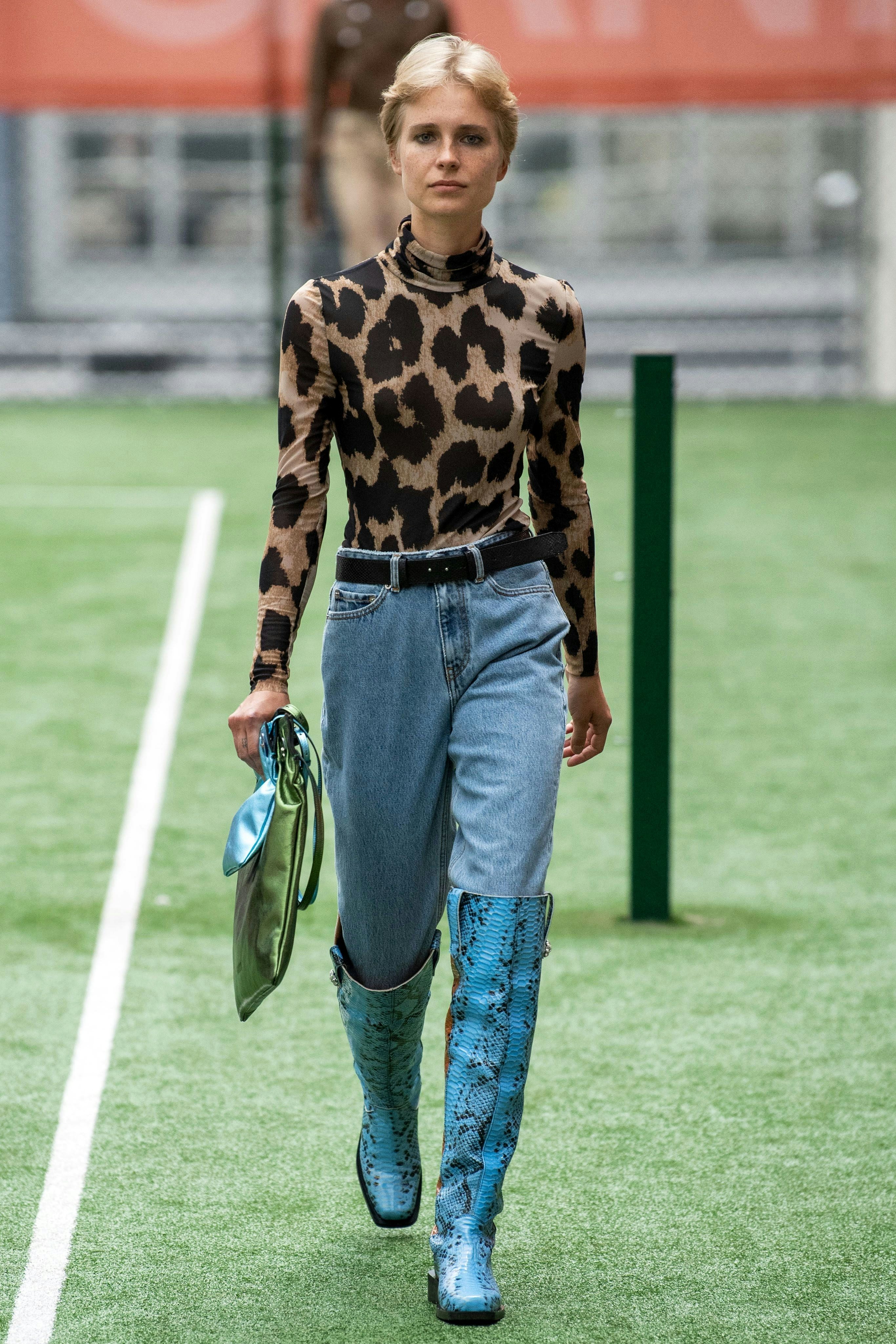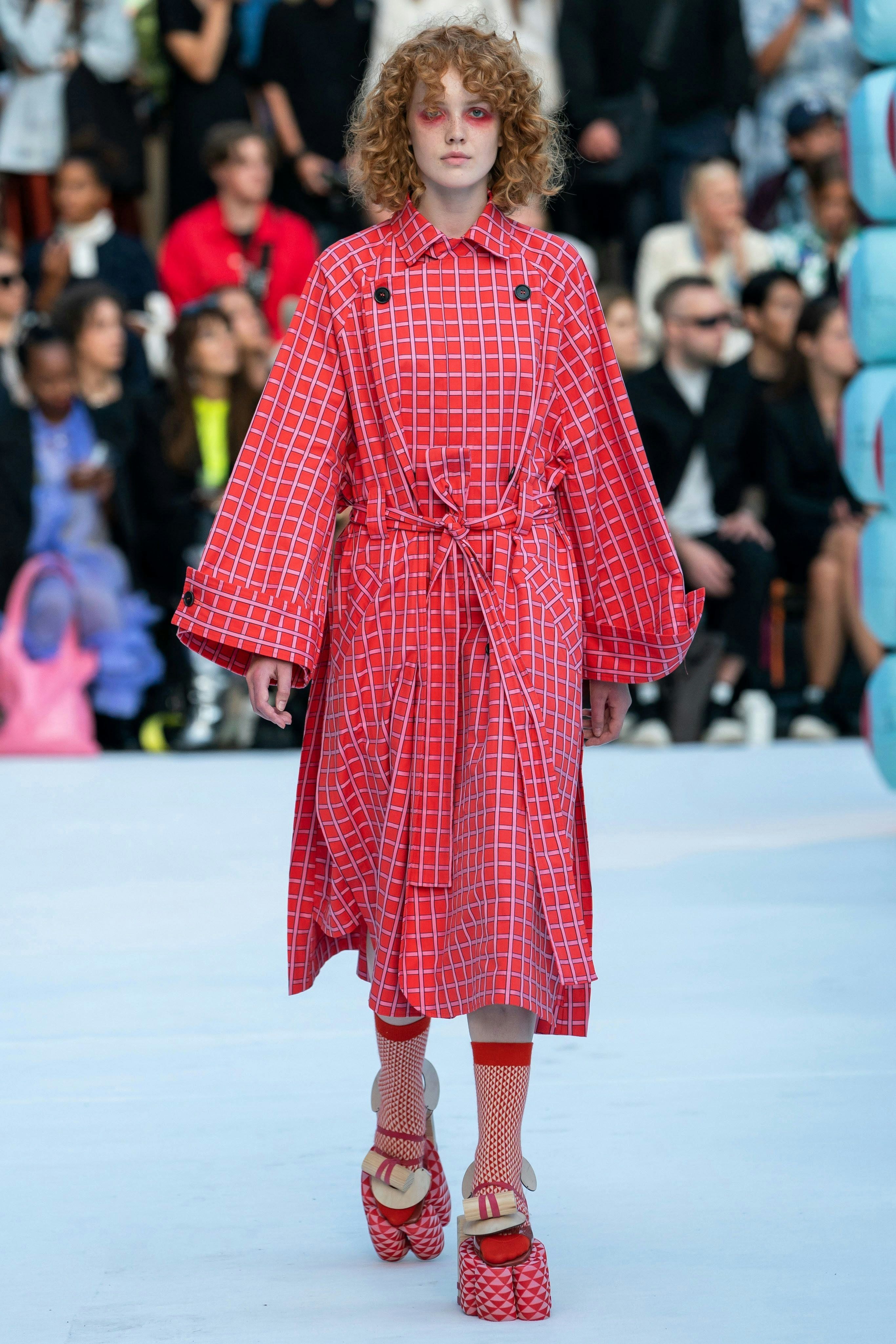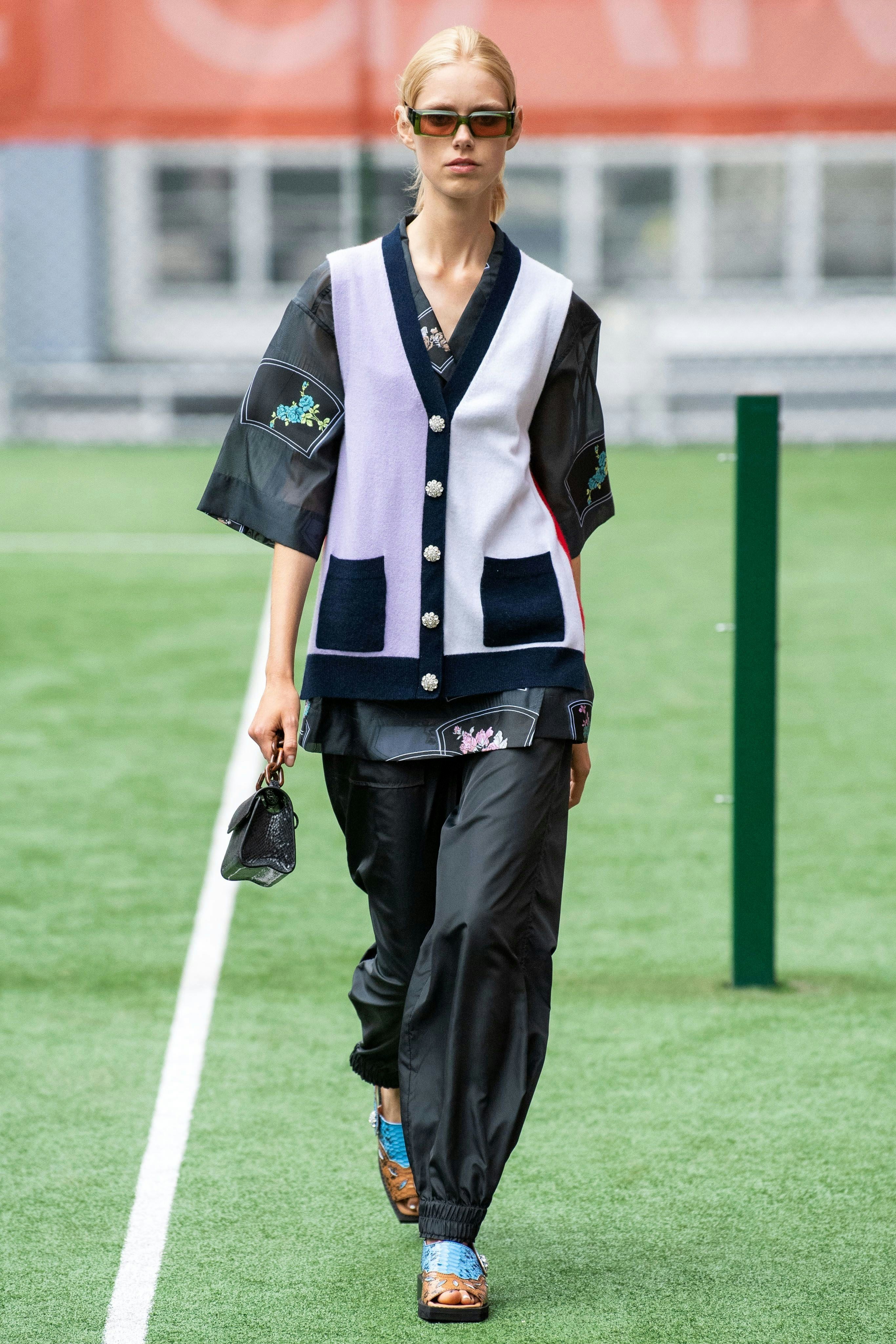 The word on everybody’s lips: Ganni. Ich bin erstaunt, wie viele Einflüsse sich in dieser Kollektion erkennen lassen. Das pastellgrüne glänzende Kleid weckt bei mir direkt Flashbacks von Pradas legendärer SS96-Show voller Ugly-made-chic-Teile. Das drapierte Gegenstück in Lila verarbeitet Omas gut erhaltene Gardine und kombiniert sie mit Perlen und blauen Cowboy-Boots aus Schlangenleder. Das plus der Kunstrasen, auf dem die Show stattfand: Eine GmbH-Vision, für die ich 100 % hier bin. Auch Look Nummer 3, eine Mischung aus Nylon-Clubwear, Strandschuhen und Strickliesel, finde ich außerordentlich ästhetisch. Remix-Kultur at its finest.