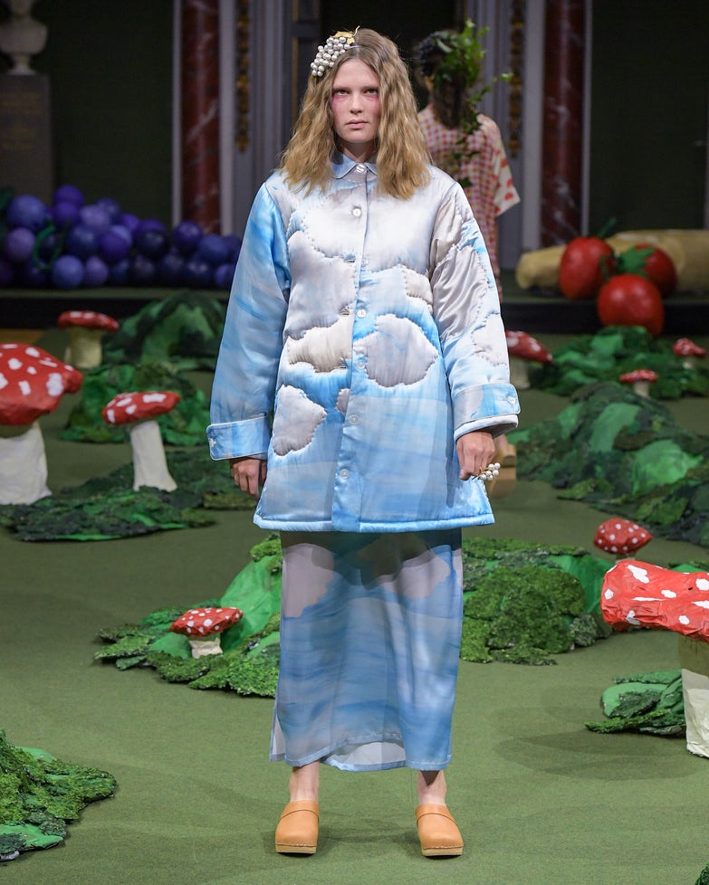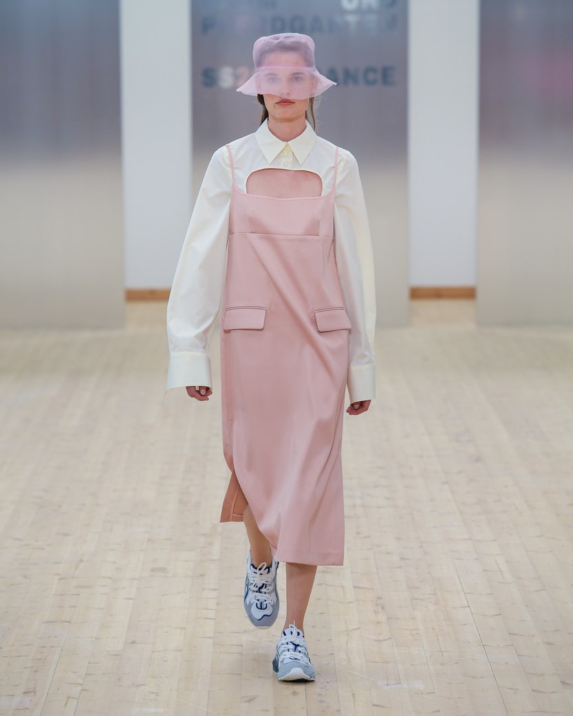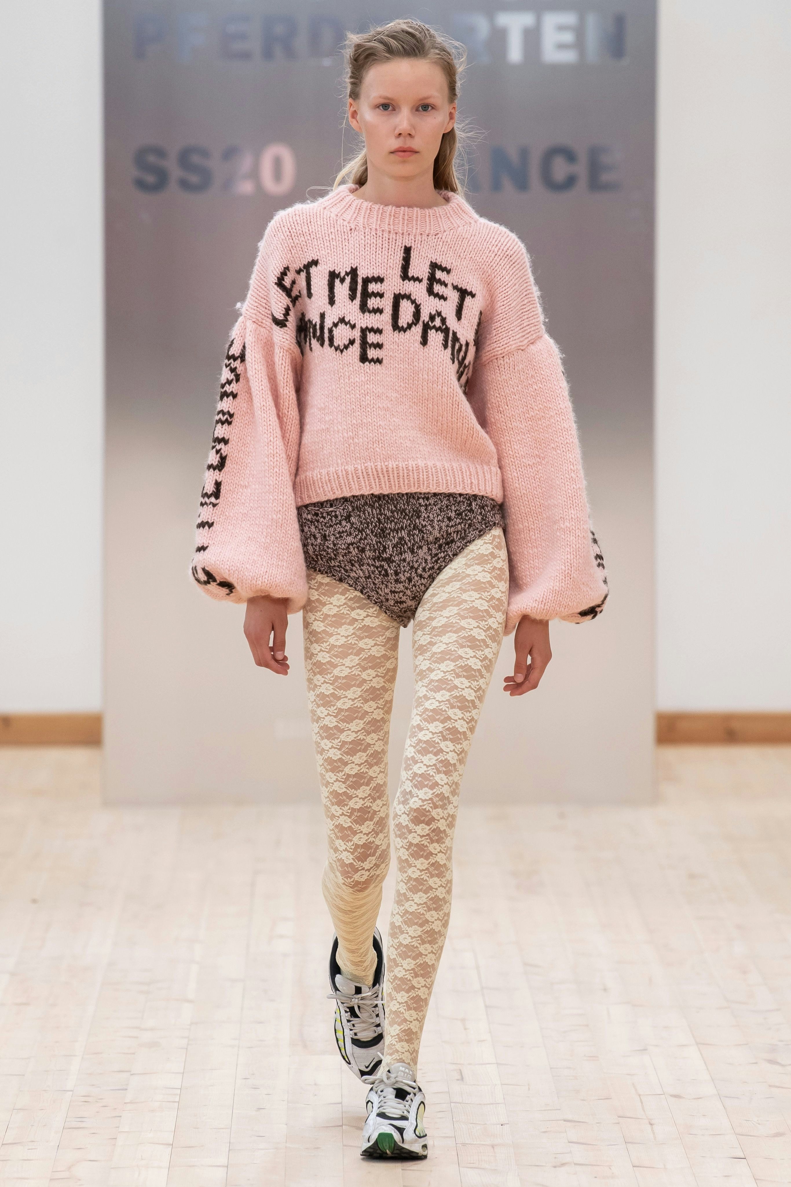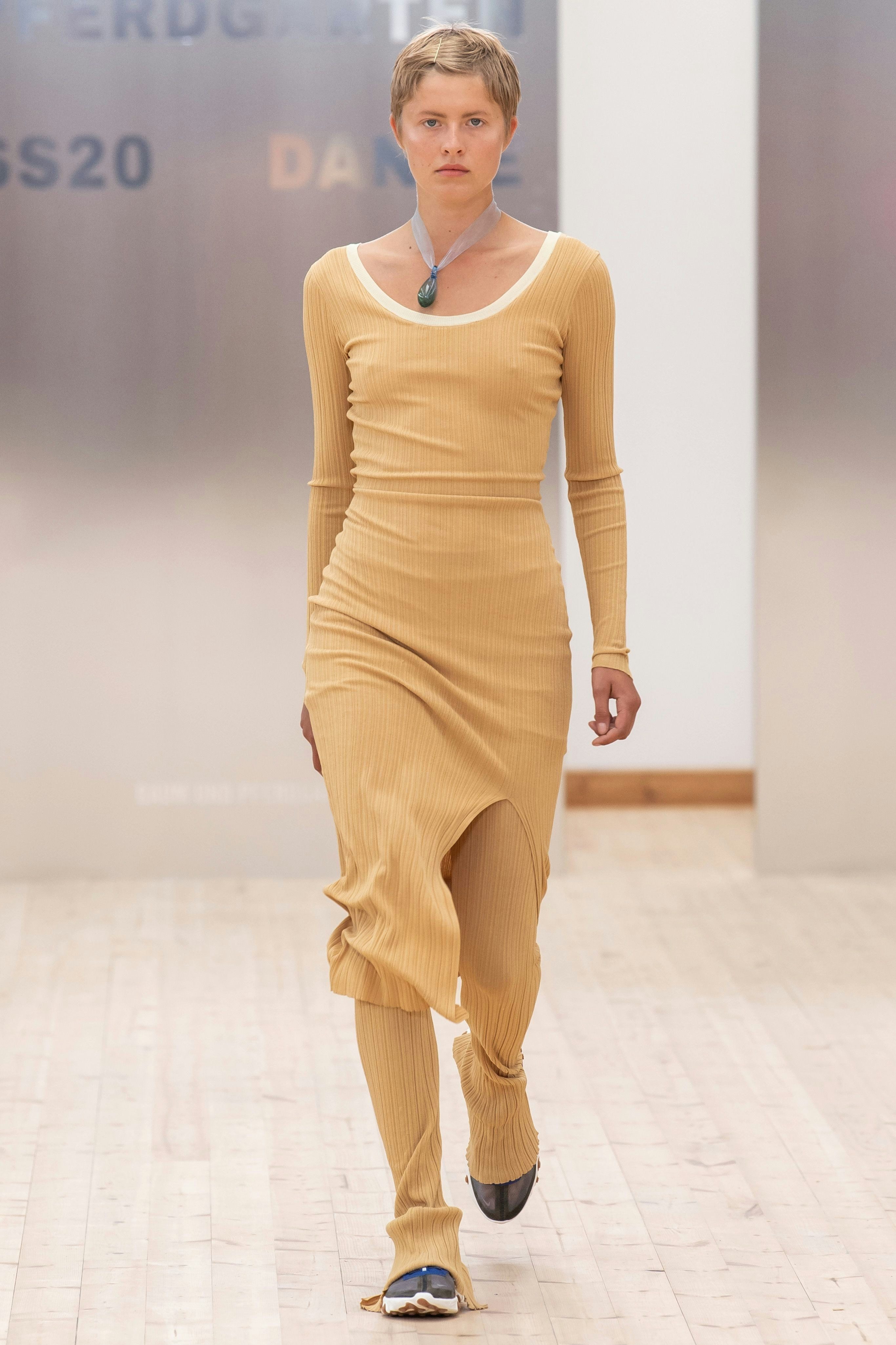 First of all: Kann man sein Label besser und gleichzeitig dänisch-niedlicher nennen? Leider nein. Baum und Pferdgartens Kollektion besticht ebenfalls durch einen aufregenden Mix, den ich so noch nicht gesehen habe. Viele der Oversized Anzüge erinnern mich an Virgil Ablohs letzte Vuitton-Kollektion, milde Farben mit großzügigen aber präzisen Schnitten. Die markante dänische Note kommt dann in Looks wie dem gelben Jerseytraum mit Ayurveda-Kette durch, der für mich die dänische Mutter mit Sektenaffinität repräsentiert. Und über Look zwei müssen wir wohl gar nicht groß sprechen. Pulli und Unterhose aus Strick, dazu eine Spitzenstrumpfhose und Sneakers – Was kann das noch toppen? Sollte ich das nächste Mal ein winterliches dänisches Outdoor-Festival besuchen, werde ich vermutlich etwas Ähnliches tragen.