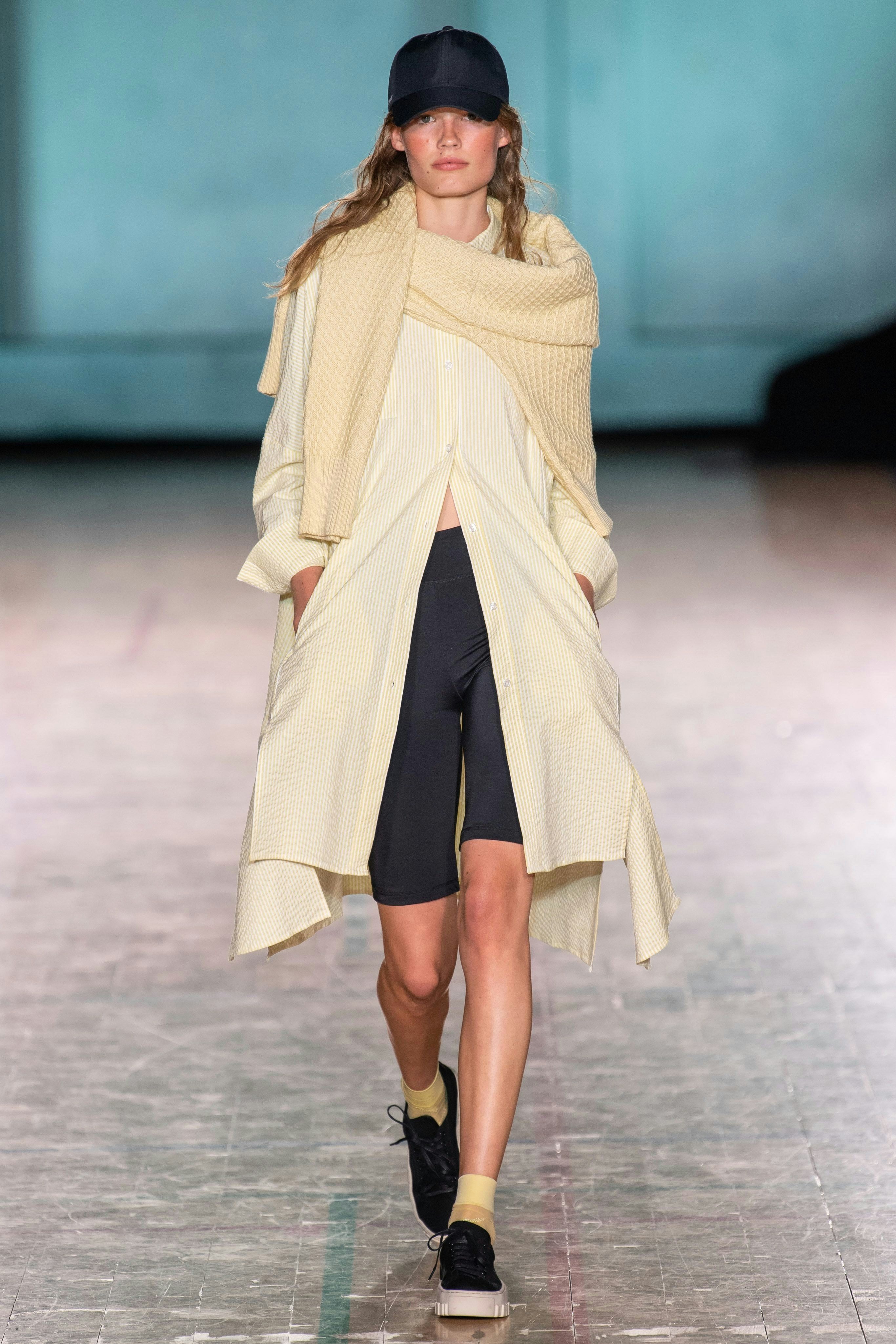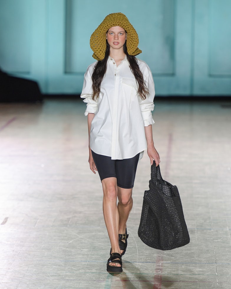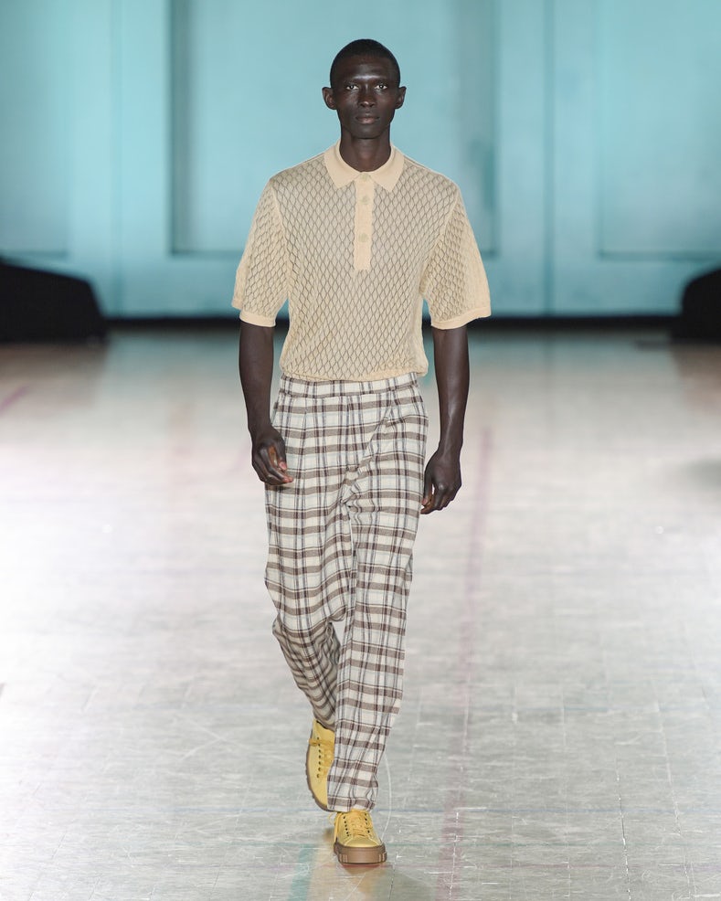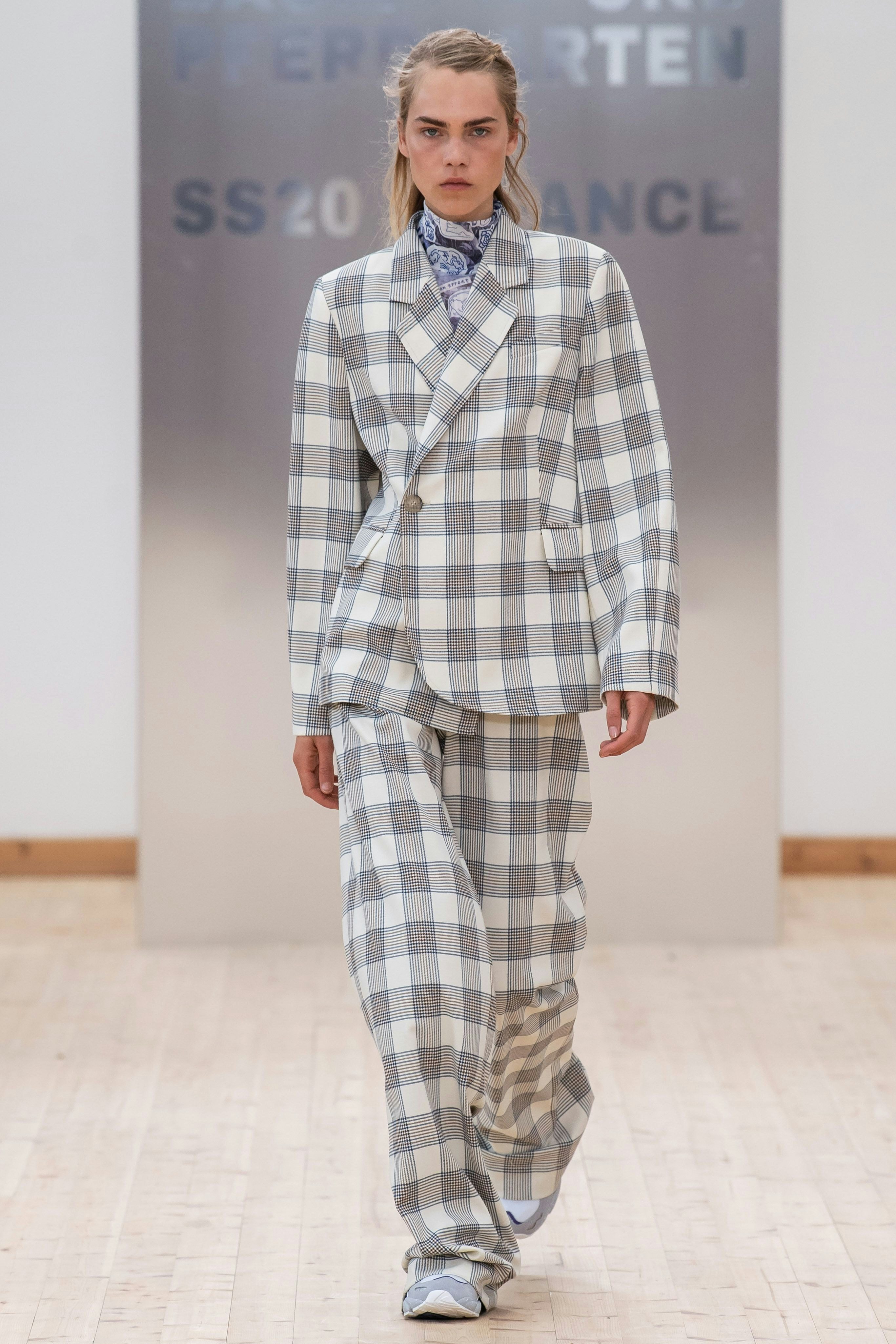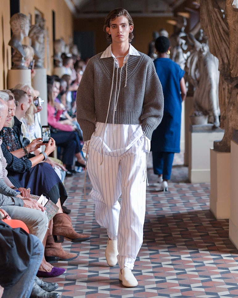 First of all: Kann man sein Label besser und gleichzeitig dänisch-niedlicher nennen? Leider nein. Baum und Pferdgartens Kollektion besticht ebenfalls durch einen aufregenden Mix, den ich so noch nicht gesehen habe. Viele der Oversized Anzüge erinnern mich an Virgil Ablohs letzte Vuitton-Kollektion, milde Farben mit großzügigen aber präzisen Schnitten. Die markante dänische Note kommt dann in Looks wie dem gelben Jerseytraum mit Ayurveda-Kette durch, der für mich die dänische Mutter mit Sektenaffinität repräsentiert. Und über Look zwei müssen wir wohl gar nicht groß sprechen. Pulli und Unterhose aus Strick, dazu eine Spitzenstrumpfhose und Sneakers – Was kann das noch toppen? Sollte ich das nächste Mal ein winterliches dänisches Outdoor-Festival besuchen, werde ich vermutlich etwas Ähnliches tragen.