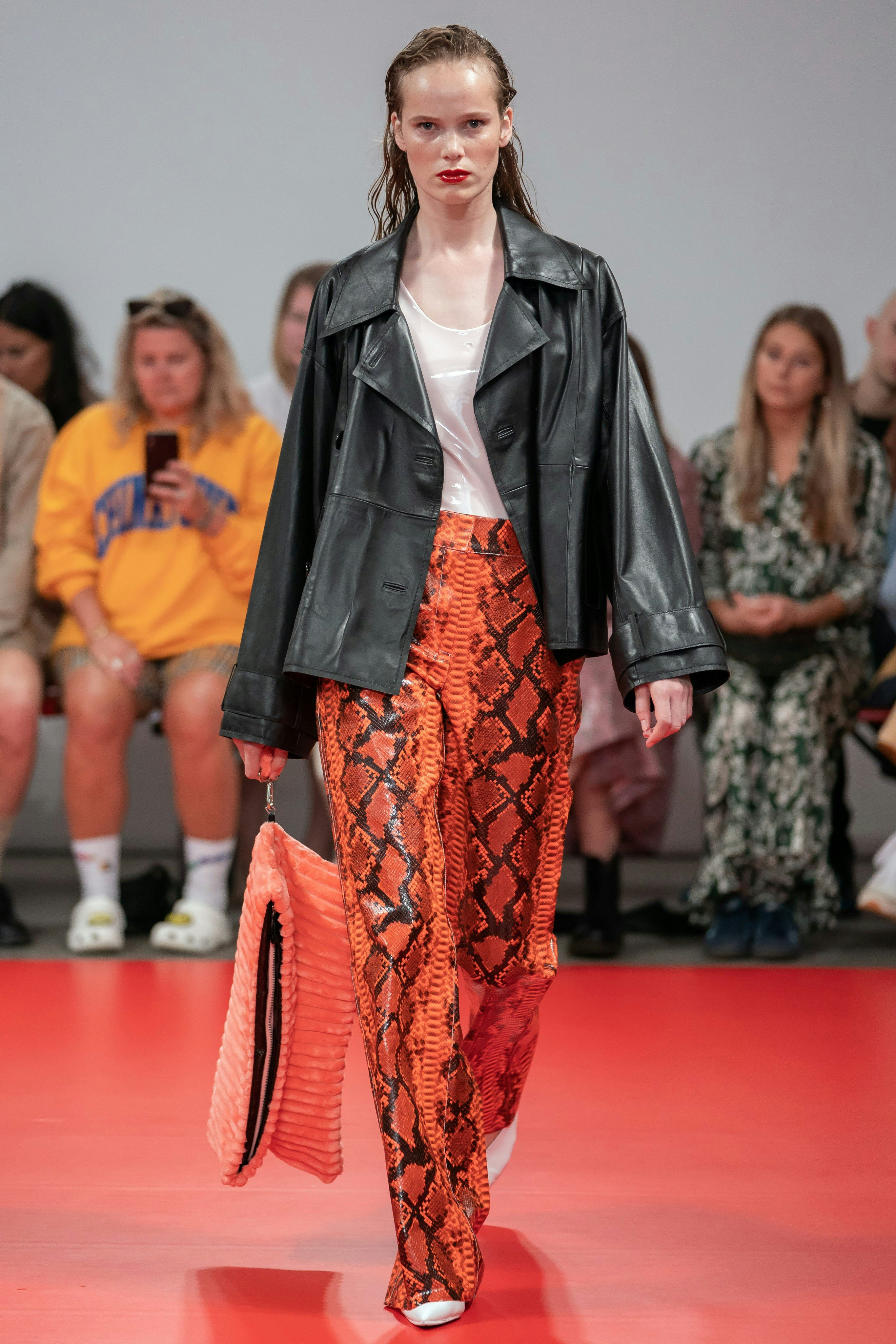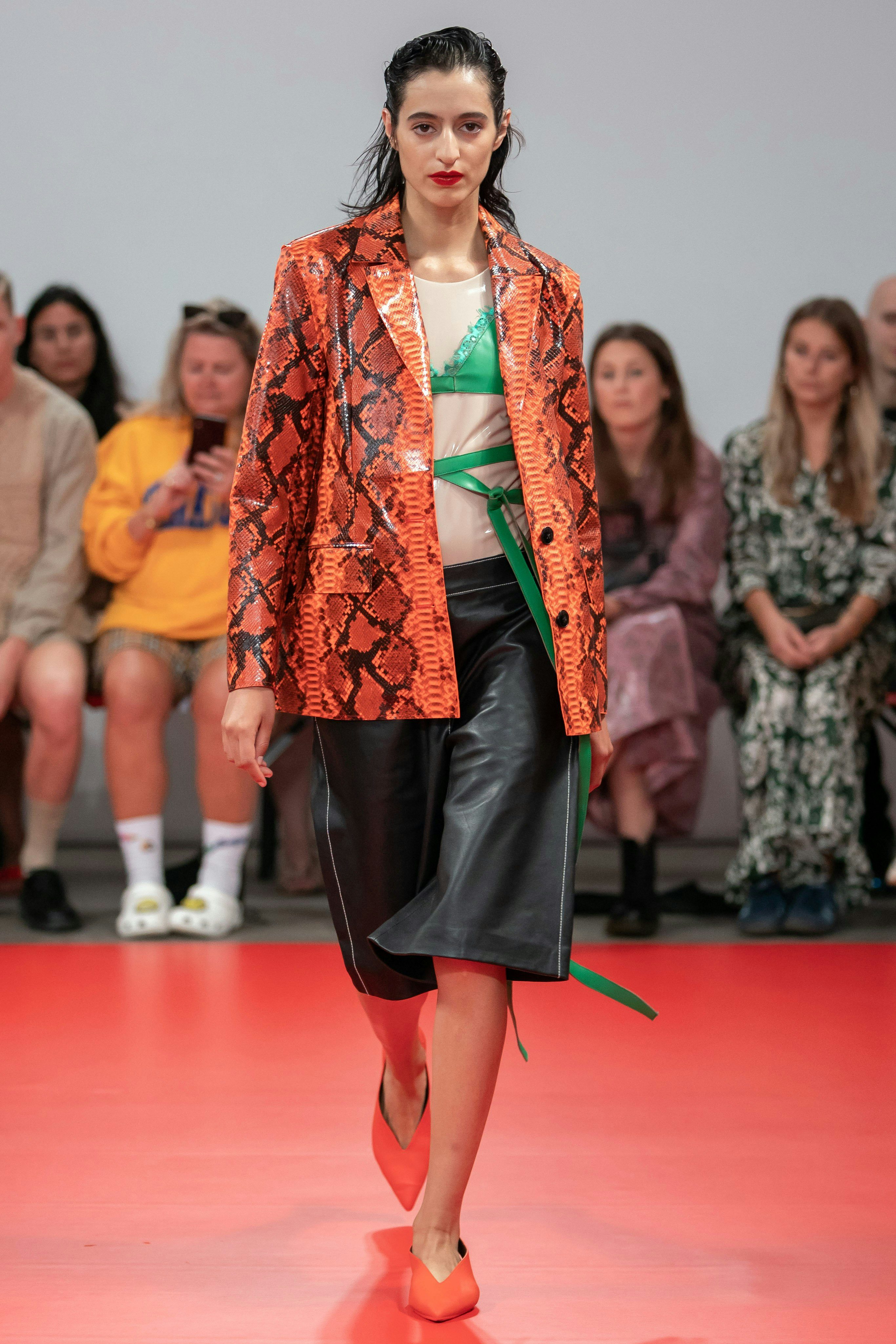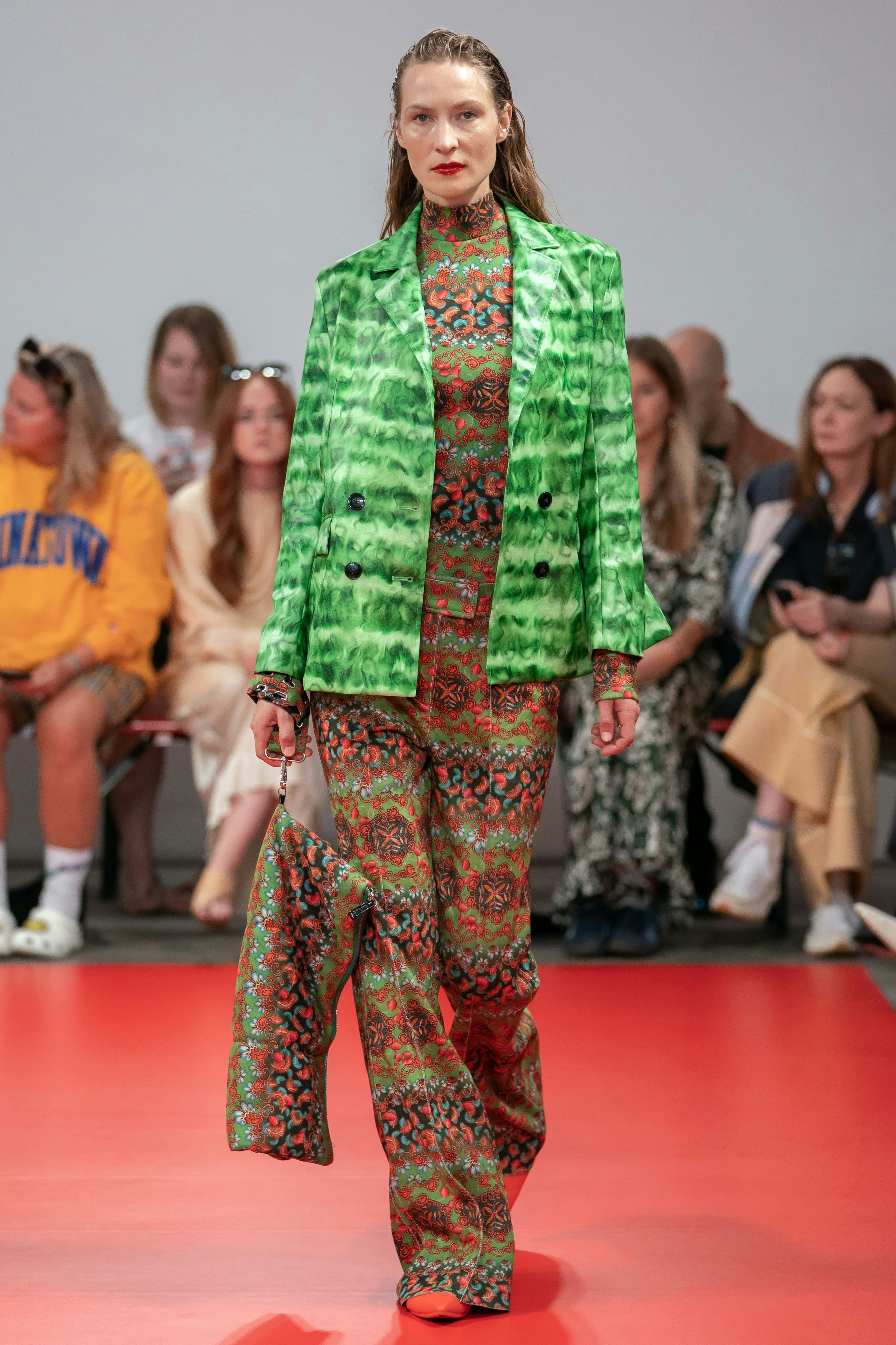 Wie Etro, nur in schön, erlebe ich Stand diese Saison. Gleich der erste Look der Show, eine 80er-Jahre-Zuhälterin auf dem Weg zum Business-Lunch, überzeugt mich. Schlangenleder scheint eh eins der großen Themen in Kopenhagen zu sein und I don’t mind (solange es kein echtes Schlangenleder ist). Die anderen beiden Looks zeigen deutlich, wie wilde Muster angenehm kombiniert werden können, ohne Schwindel zu verursachen. Und auch der grüne Blazer mit Wellen-Batik: Endlich eine 70er-Jahre-Referenz, die ich ertragen kann. Der gesamte Runway wirkt bei Stand wie ein strukturierter Acid-Trip ohne alberne brennende Himmelskörper. Ich befürworte dies.