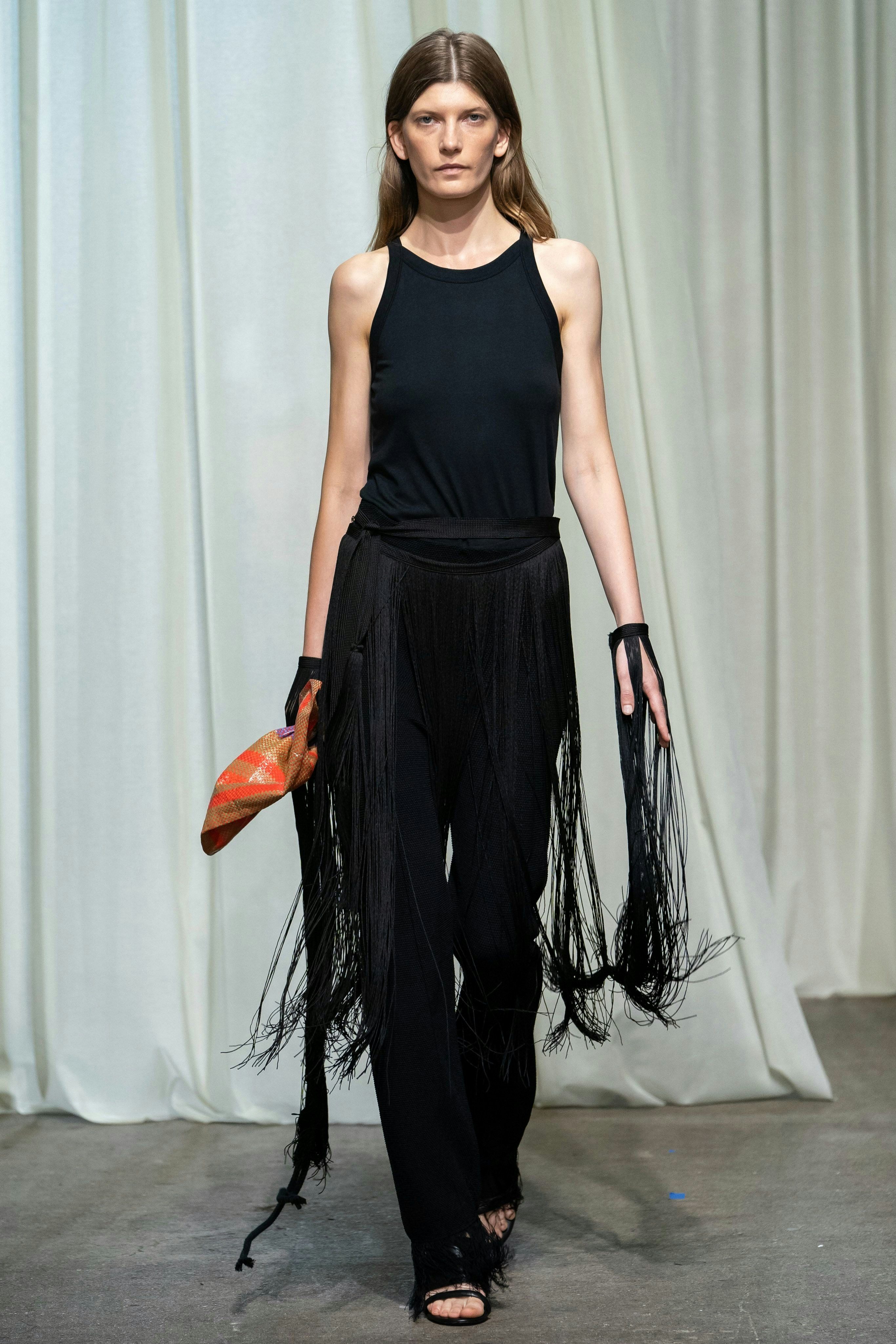 Bin ich froh, dass Rodebjer sein Comeback auf dem Runway zeigte, denn genau dort sehen die fransigen Entwürfe, die Carin Rodebjer für den nächsten Sommer präsentierte, gut aus. In Bewegung! Haare brauchen Volumne, Fransen brauchen Bewegung. Und nicht viel Farbe! Bitte einmal die drei Entwürfe nach Hause zu mir liefern, dann bin ich nicht nur glücklich, sondern putze auch noch die Bordsteine in Berlin mit dem überlangen Flimm de la Flimm.