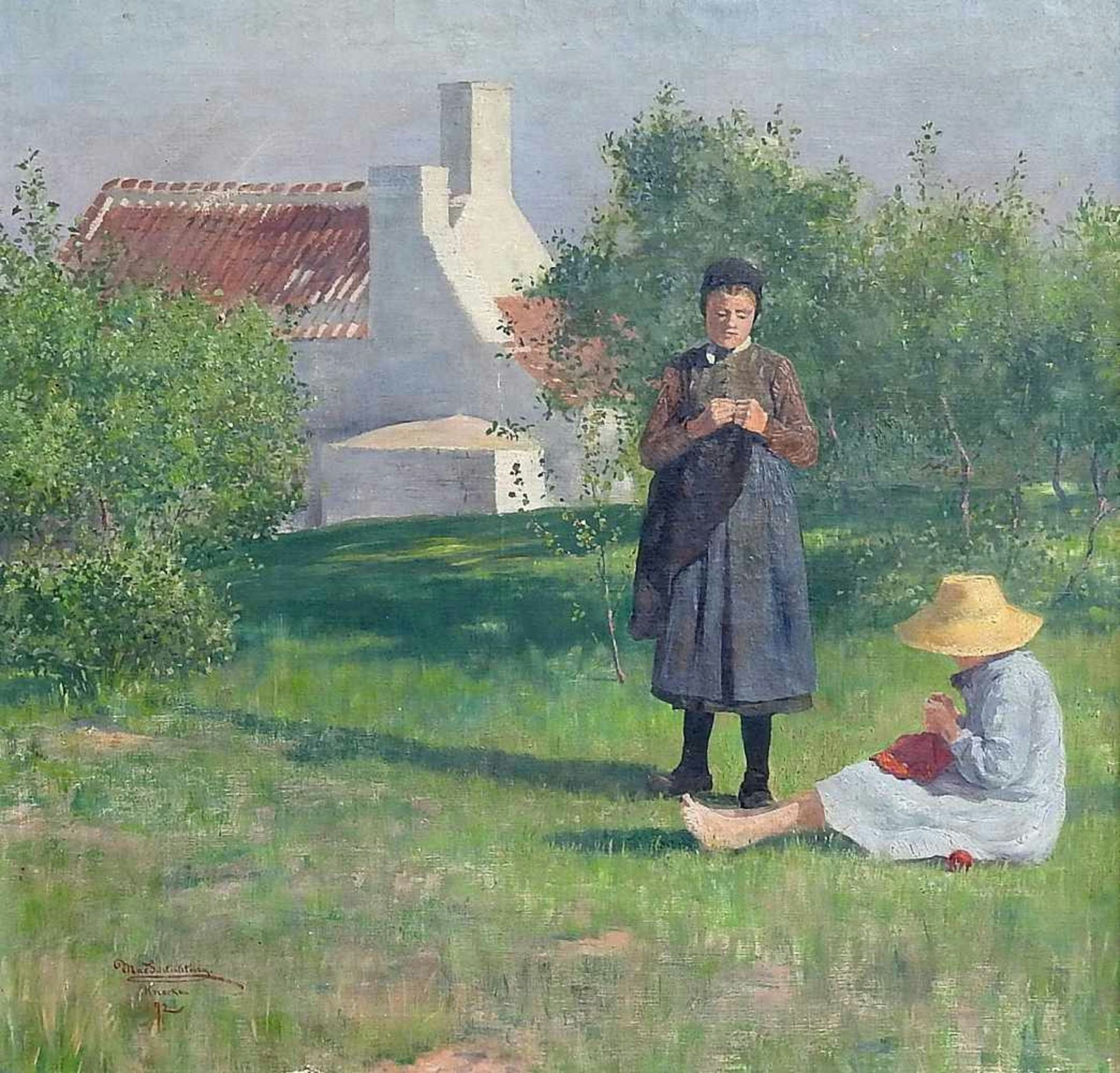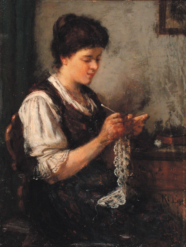 v.l.n.r. „Häkelnde Mädchen in Knokke“, Belgien, 1892 von Max Schlichting © Privatsammlung, Gemeinfrei, via Wikimedia Commons, „Mädchen beim Häkeln einer Bordüre“ von Rudolf Epp © selbst fotografiert, Bild-PD-alt via Wikipedia, Queen Victoria crocheting, 1889. © Reproduced by gracious permission of Her Majesty, Queen Elizabeth II