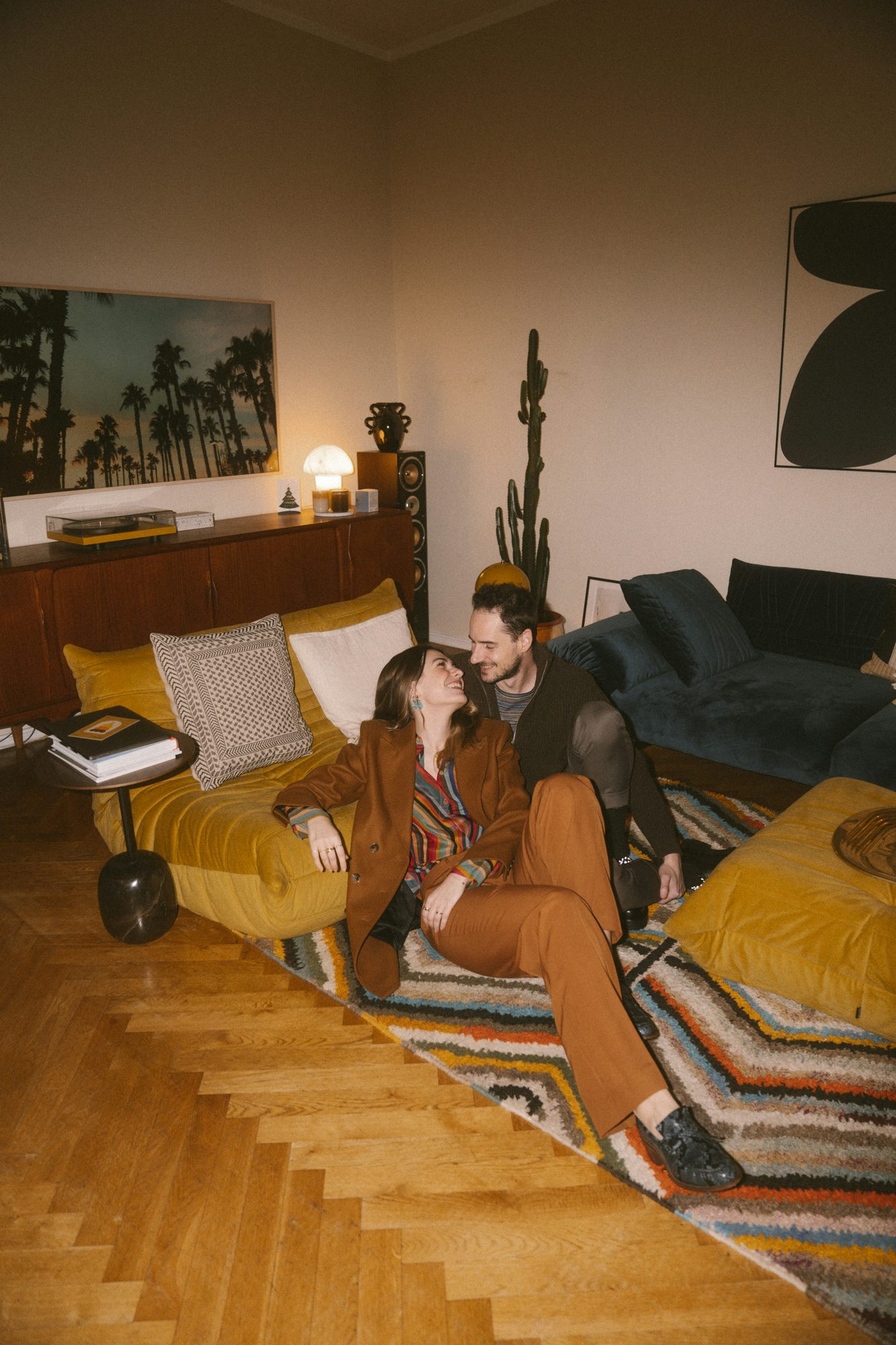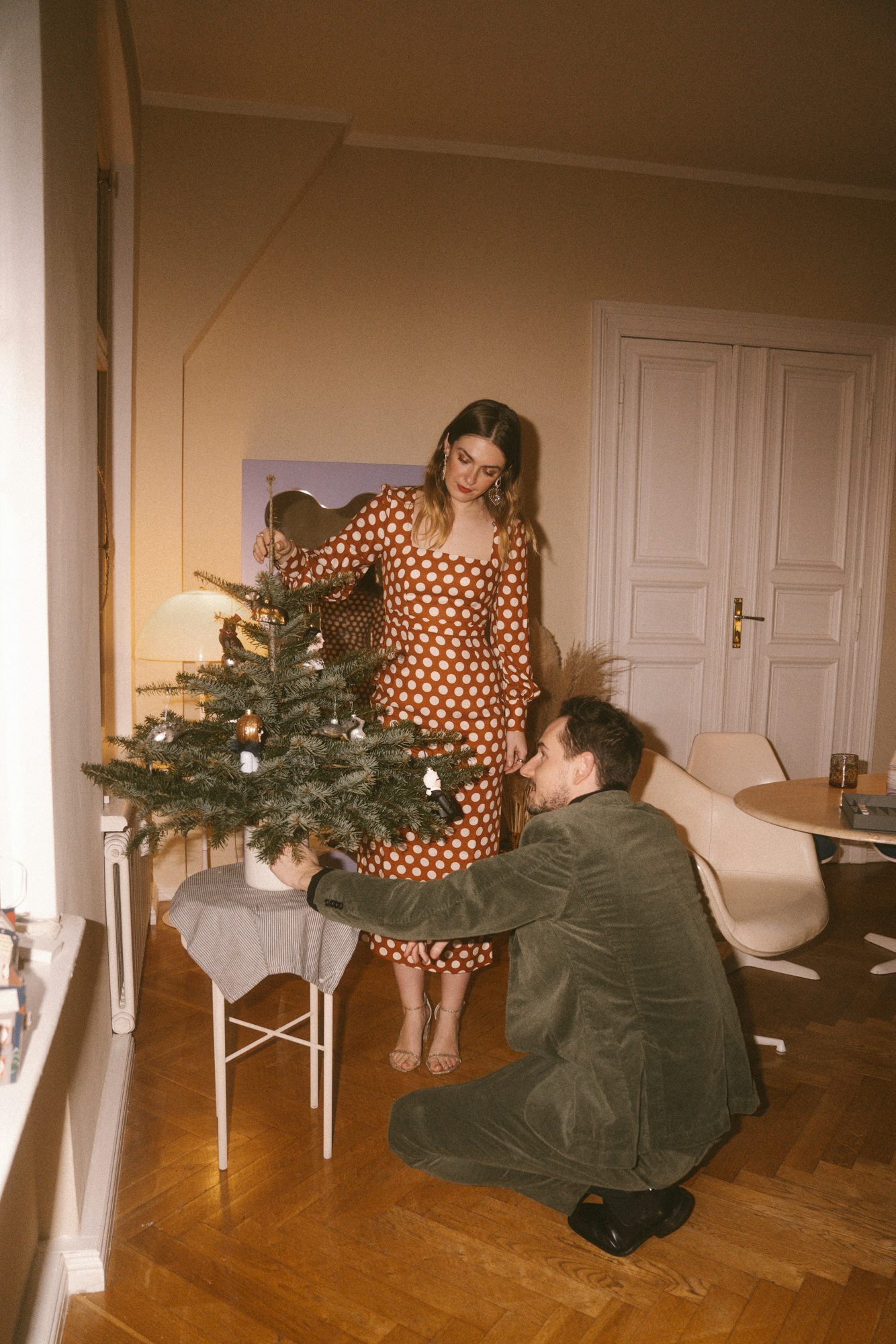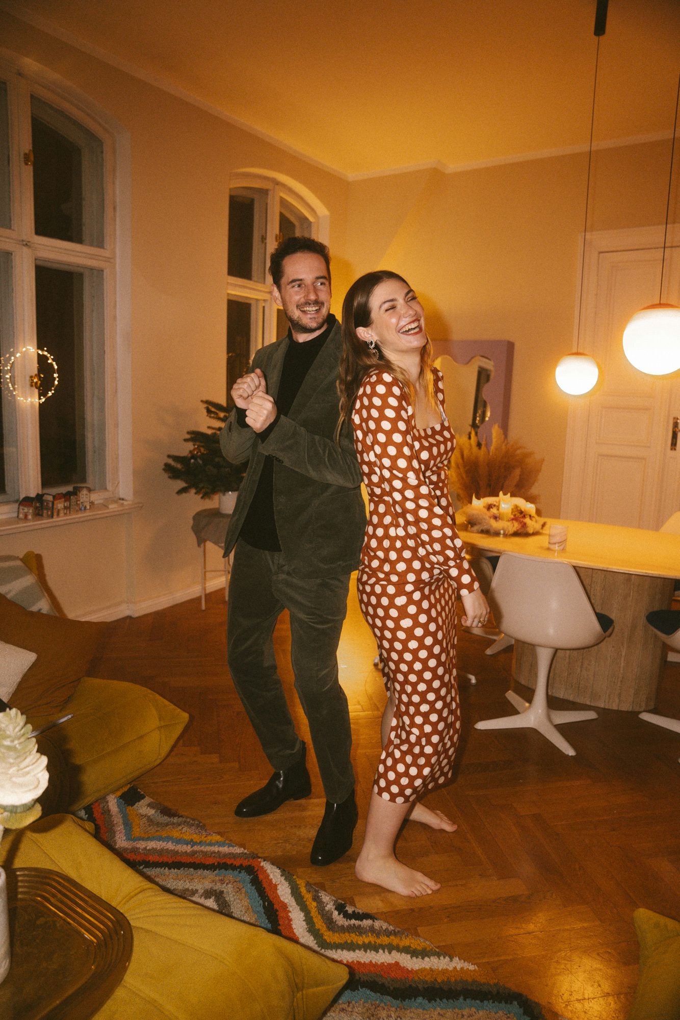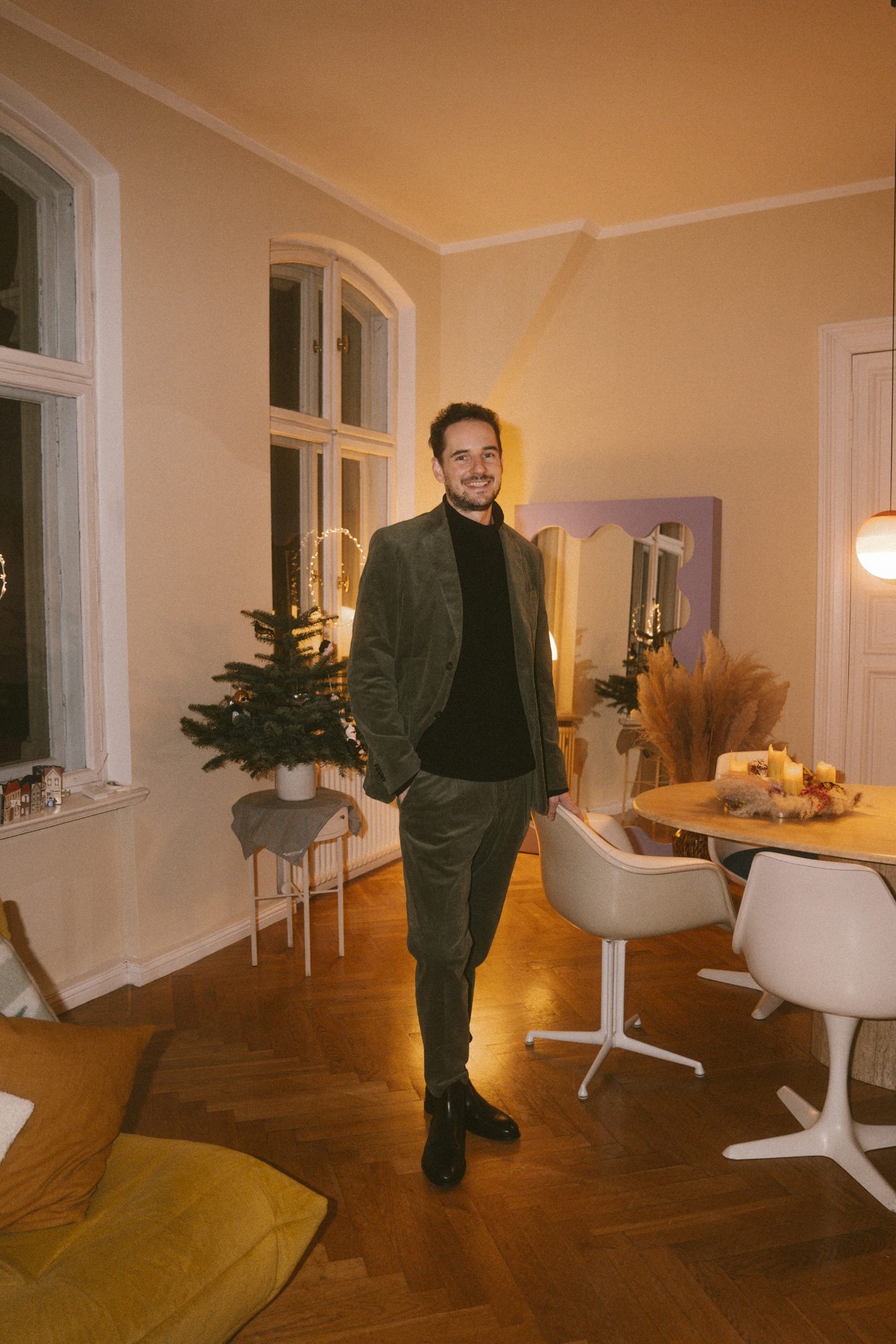 Und auch outfittechnisch haben wir beschlossen, dass dieses Jahr alles anders wird und jeglichen Samt, Weihnachtsmotive, Zopfstrick und Pailletten verbannt. Stattdessen gibt es Wohlfühllooks von Zalando Designer für die Feiertage und ein eleganteres Outfit für den Heiligabend selbst. An den Festtagen sehen wir die engste Familie in Berlin – und spielen stundenlang Phase 10, Lukas in einem casual Strickpullover von Closed und Filippa-K-Hose (mit Gummizug!) und ich in einem Seventies-Ensemble von meiner Lieblingsdesignerin Alexa Chung. In dem Hemd von Paul Smith muss man mich auf unserem Teppich erstmal finden!