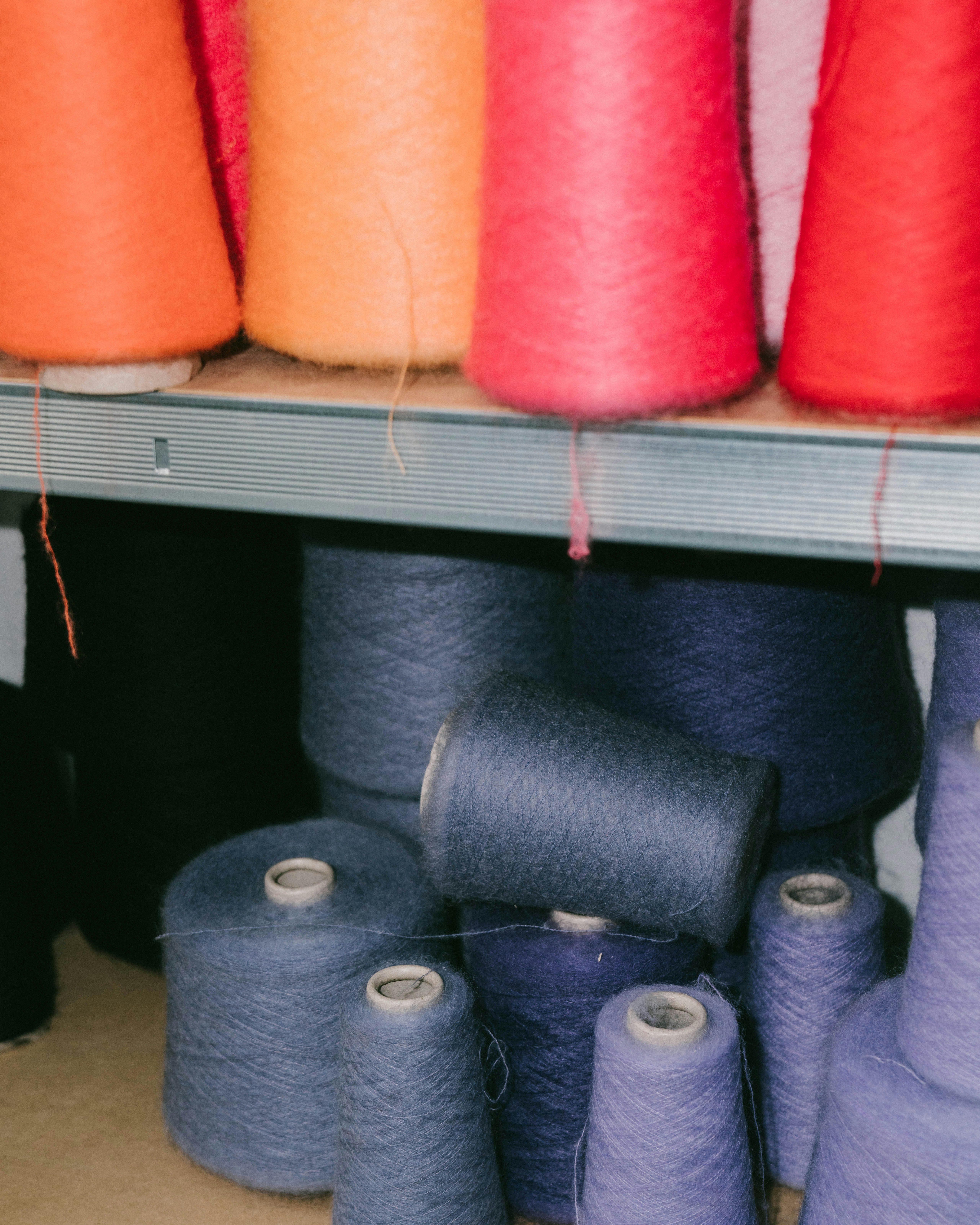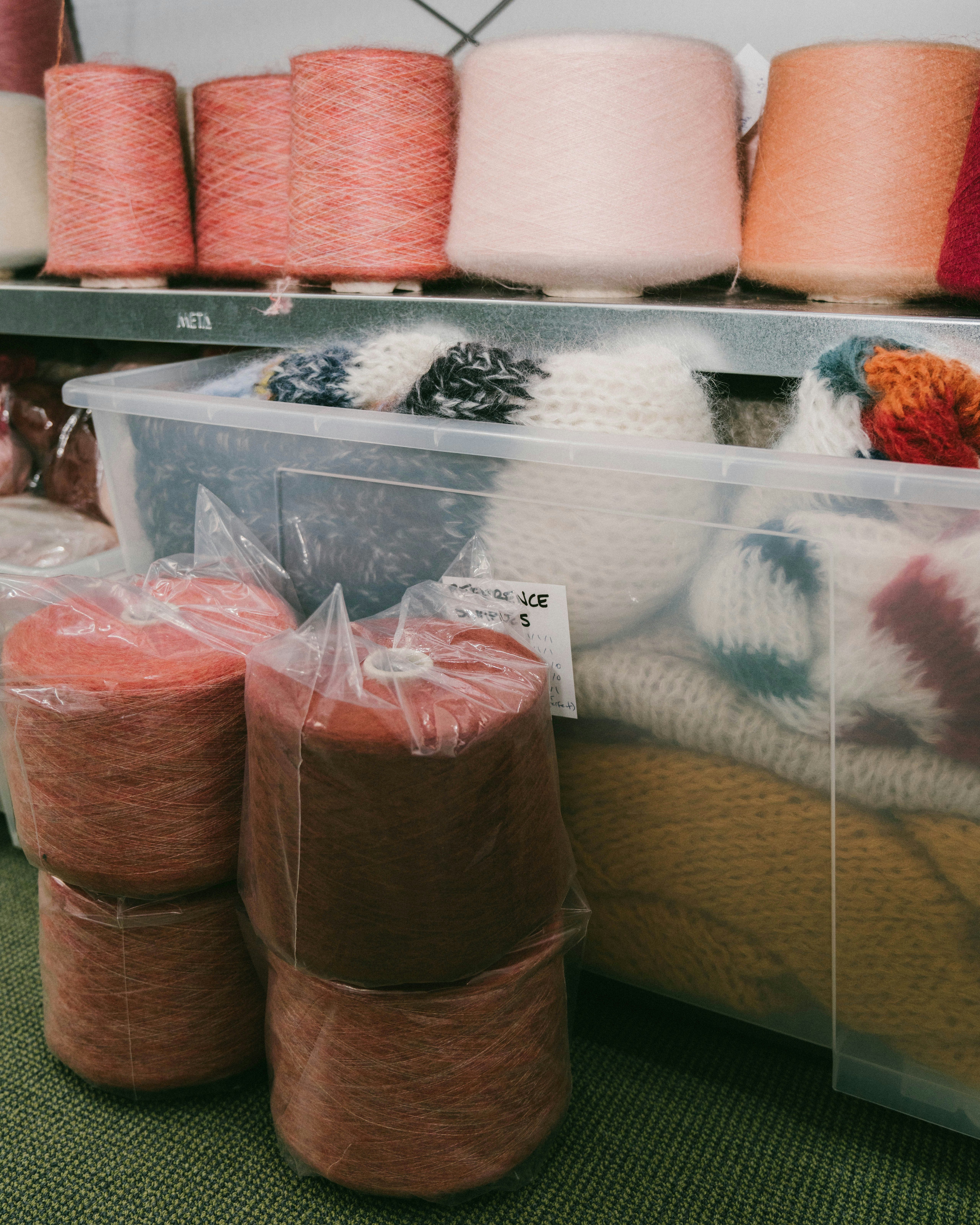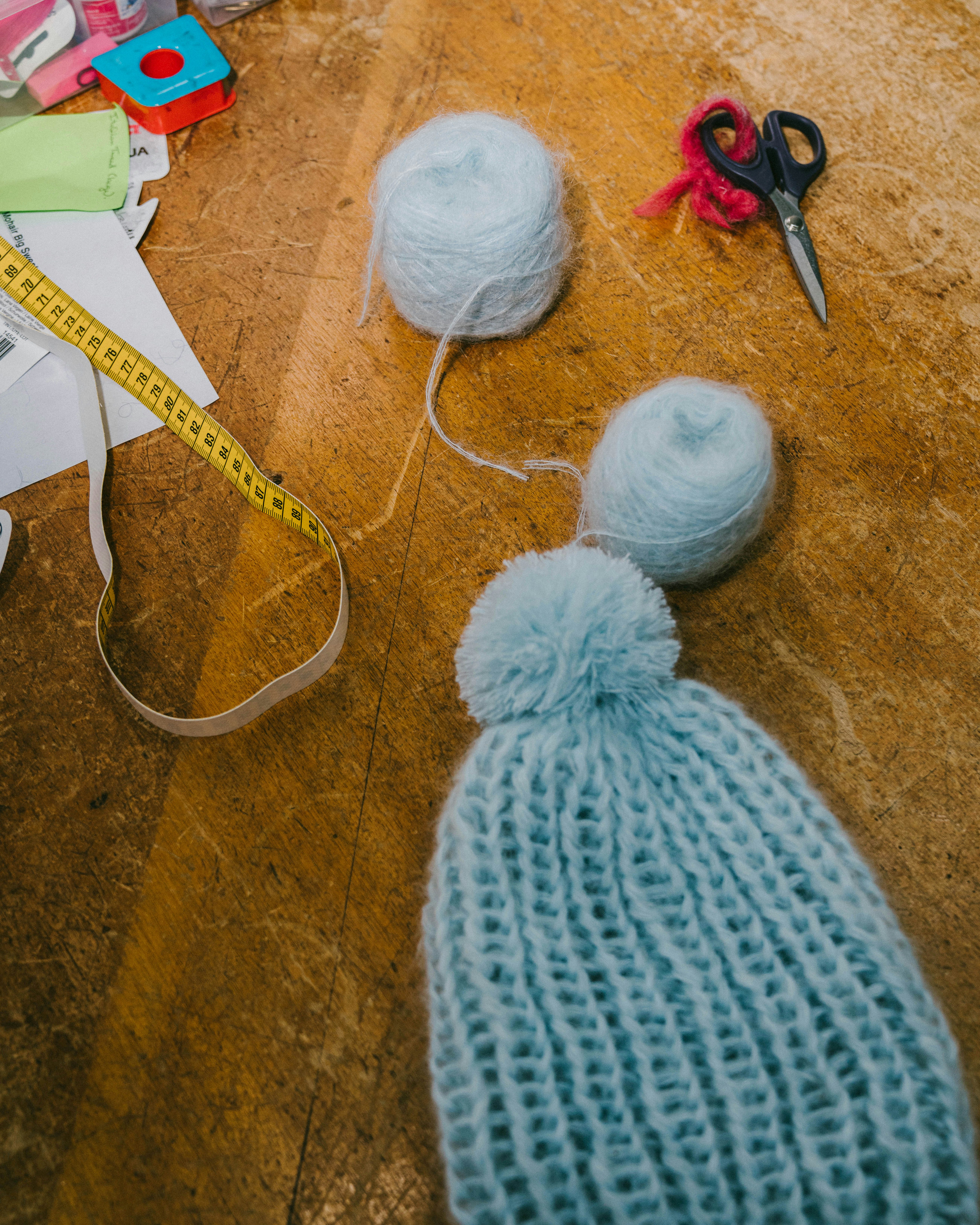 Neben mir sind es sechs Festangestellte, im Grunde aber auch fest Freie. Wir haben auch immer mal wieder Praktikant*innen, heute ist es hier relativ ruhig. Dazu gehören aber noch mehr Freie: Grafik, Fotograf*innen, Styling, Strickerinnen und die Produktion ist außer Haus. Wir haben hier eine kleine Werkstatt, die für die ganzen Rückläufe aus den Produktionen und den Qualitätscheck verantwortlich ist, aber manchmal auch verändern, finishen und bei der Produktentwicklung helfen.