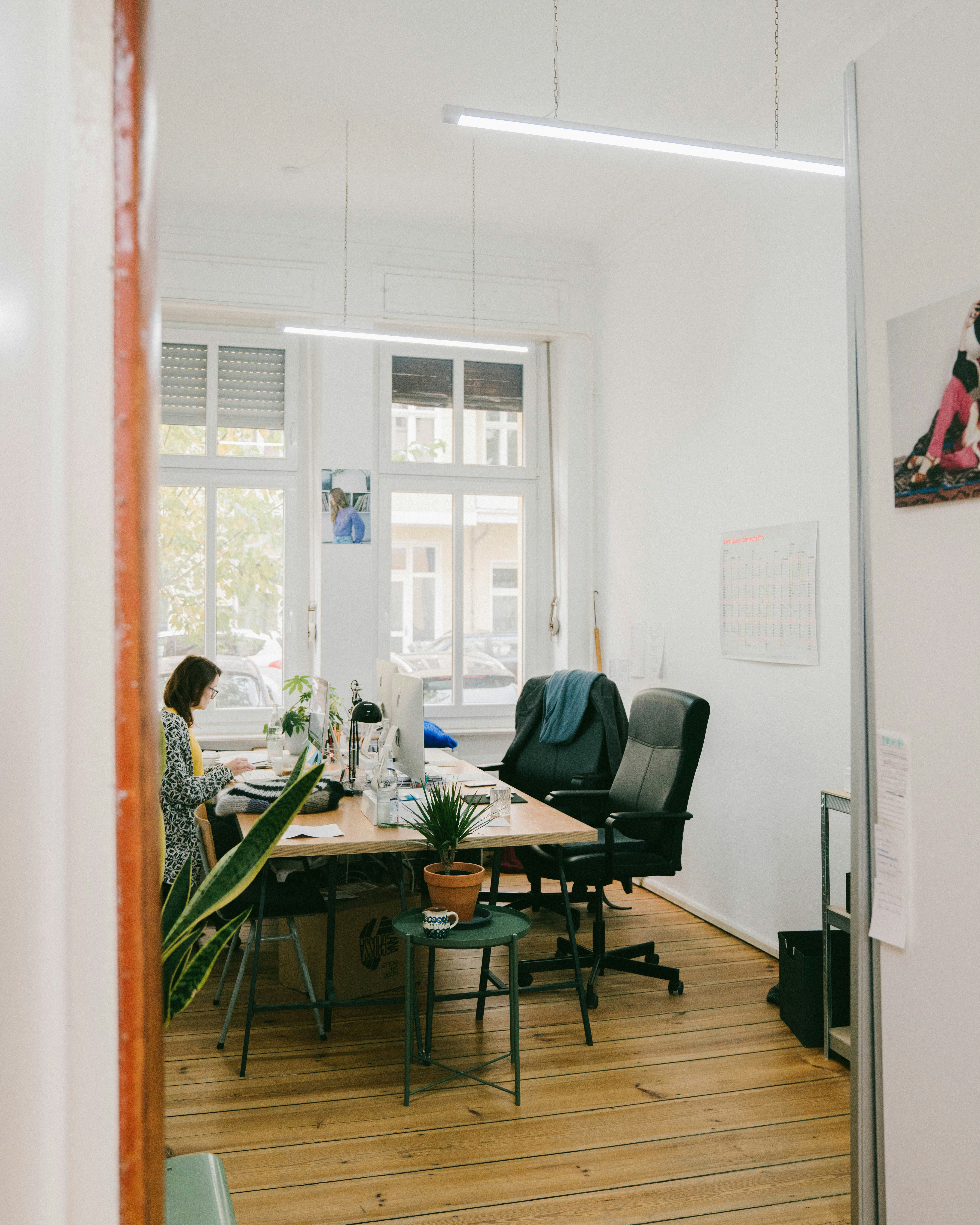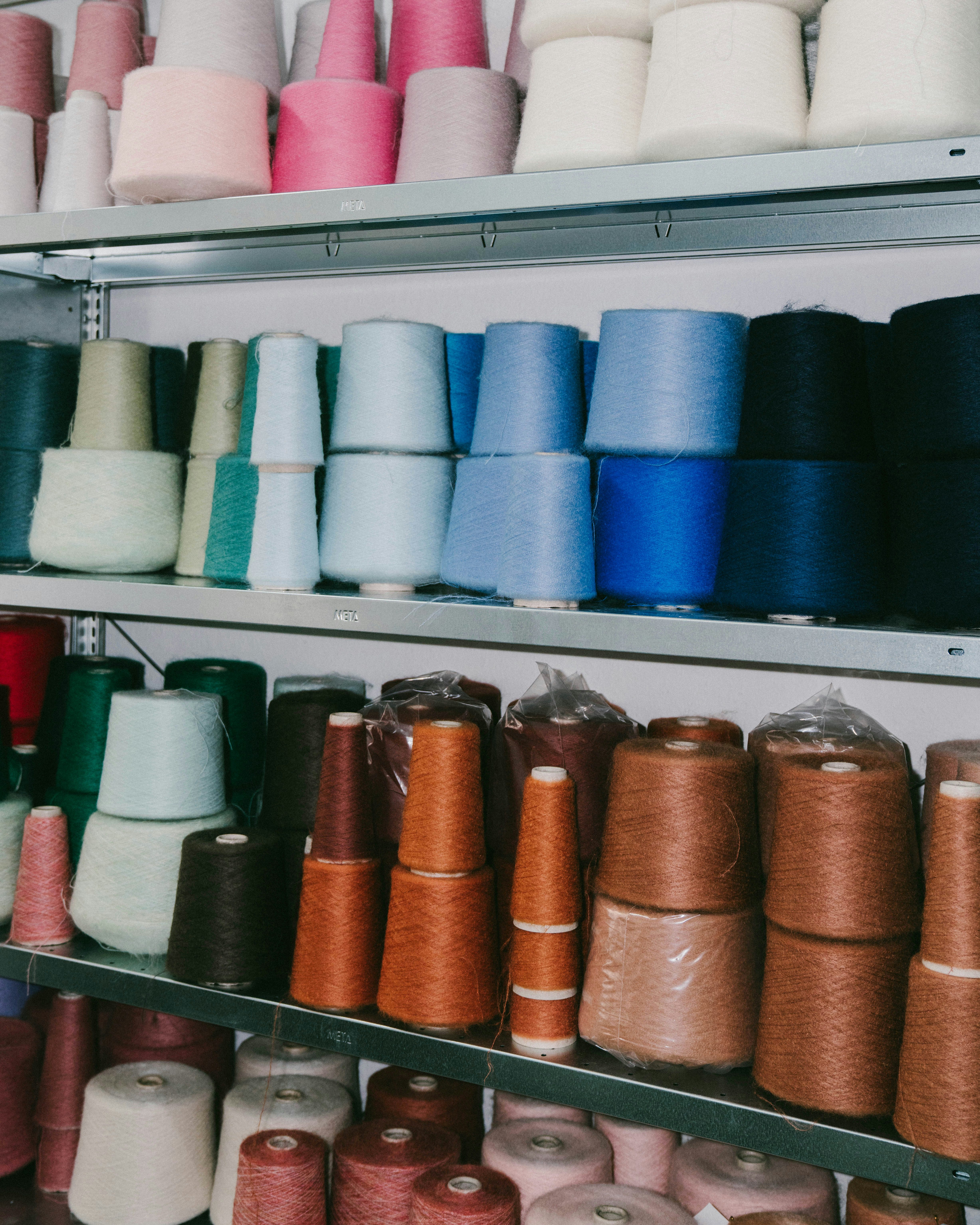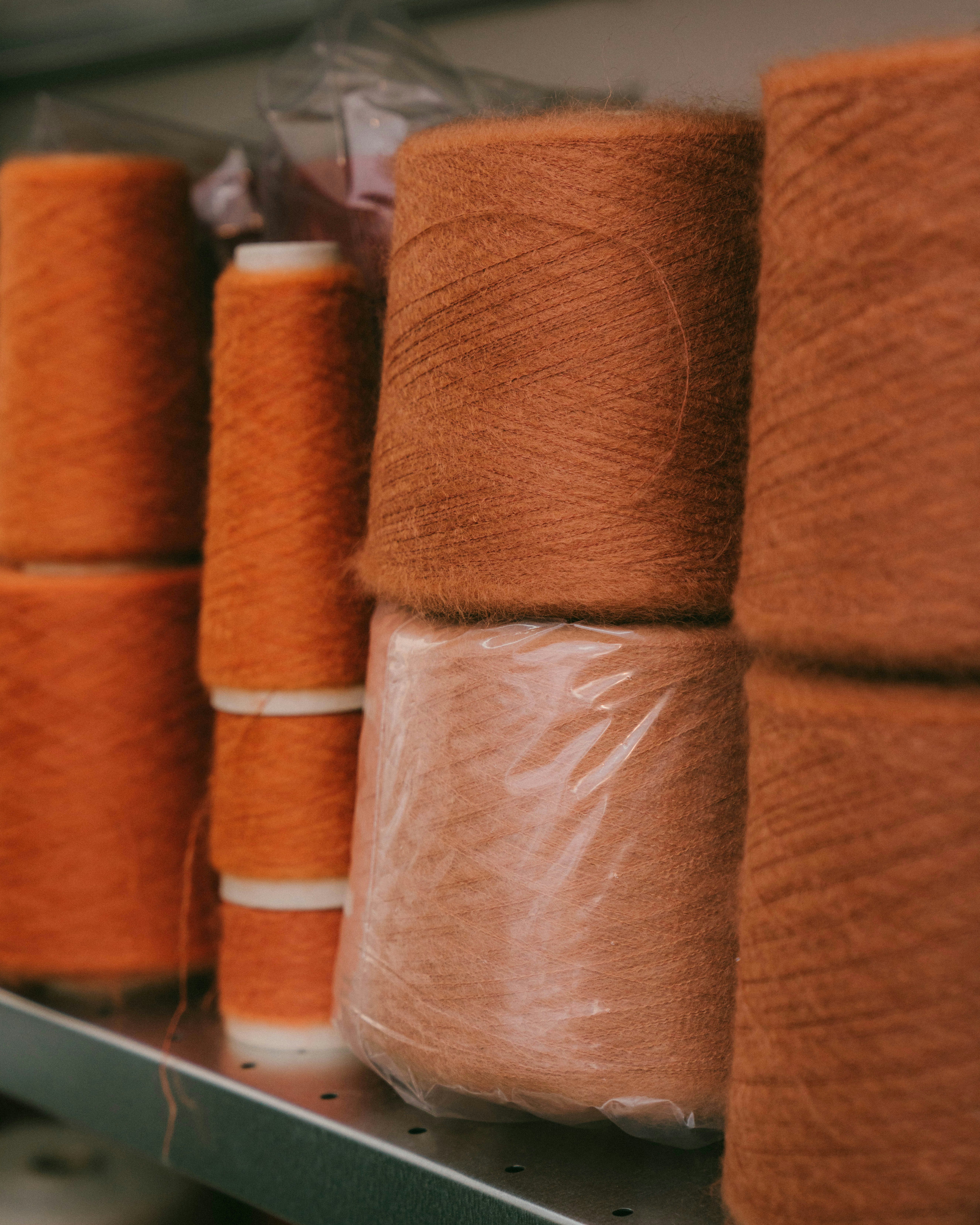 Neben mir sind es sechs Festangestellte, im Grunde aber auch fest Freie. Wir haben auch immer mal wieder Praktikant*innen, heute ist es hier relativ ruhig. Dazu gehören aber noch mehr Freie: Grafik, Fotograf*innen, Styling, Strickerinnen und die Produktion ist außer Haus. Wir haben hier eine kleine Werkstatt, die für die ganzen Rückläufe aus den Produktionen und den Qualitätscheck verantwortlich ist, aber manchmal auch verändern, finishen und bei der Produktentwicklung helfen.