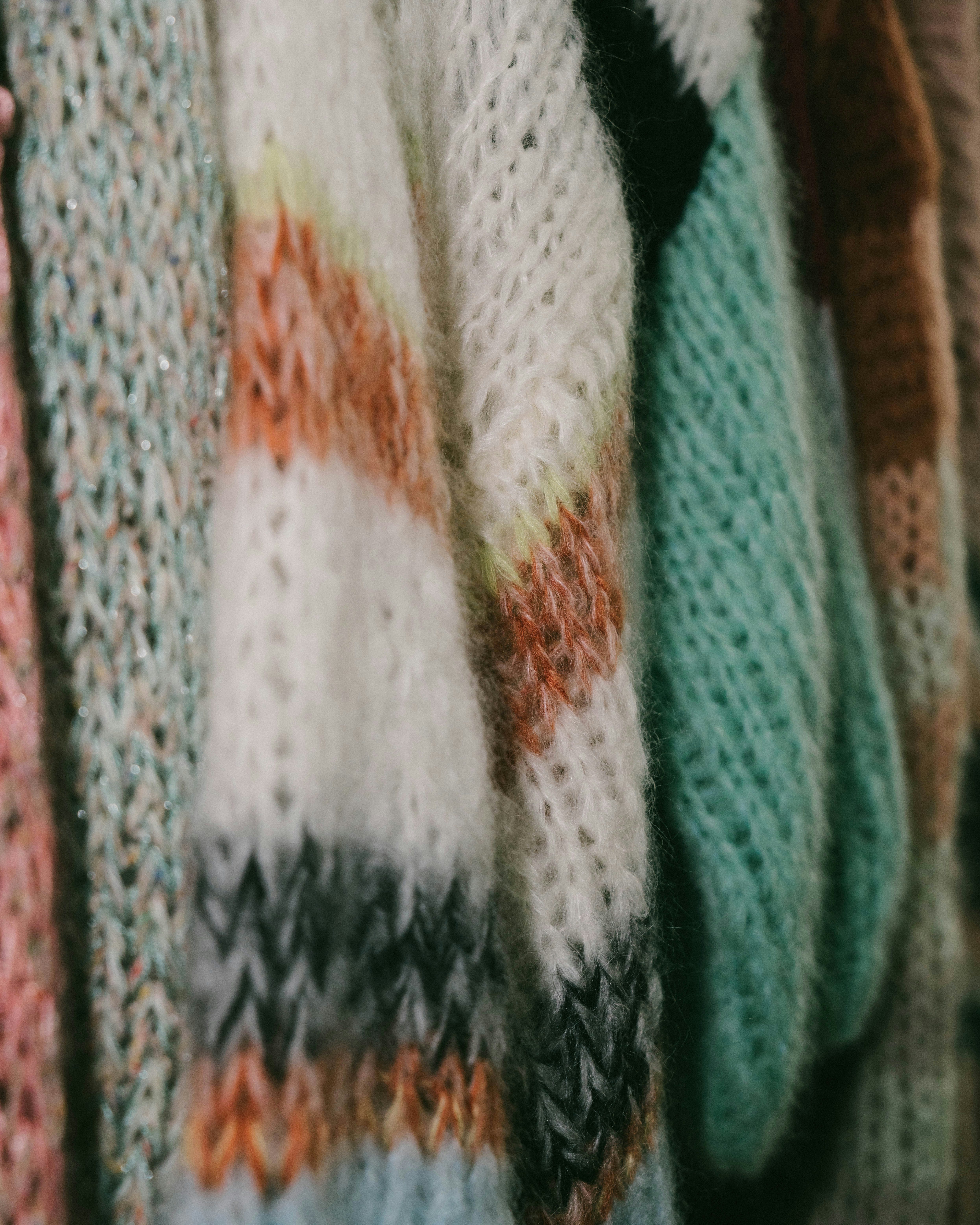 Naja, es stand schon immer mal zur Debatte. Ich weiß, dass mich vor einiger Zeit schon mal mein japanischer Agent gefragt hat, weil das immer noch eine Besonderheit wäre in dieser Farbsprache zu zeigen, dass es das in Cashmere gibt. Mittlerweile gibt es sehr sehr viel Cashmere, aber nicht im Handstrick oder in diesem groben Strickbild und vor allem nicht so farbenfroh. Cashmere – und wir wissen jetzt nach dem Sourcen auch warum – ist einfach ein richtiges Invest, wenn man mit vielen Farben mustern will. Dann hat man einfach einen riesigen Betrag im Regal stehen und braucht von jeder Farbe ja nur wenig für ein Stück. Es ist toll, mit so einem Material zu arbeiten. Ich liebe allerdings auch Alpaka und eine Zeitlang hatte ich Cashmere wieder von mir geschoben, weil der Cashmere-Markt einfach so inflationär und überlaufen war von diesen ganzen günstigen Anbietern.