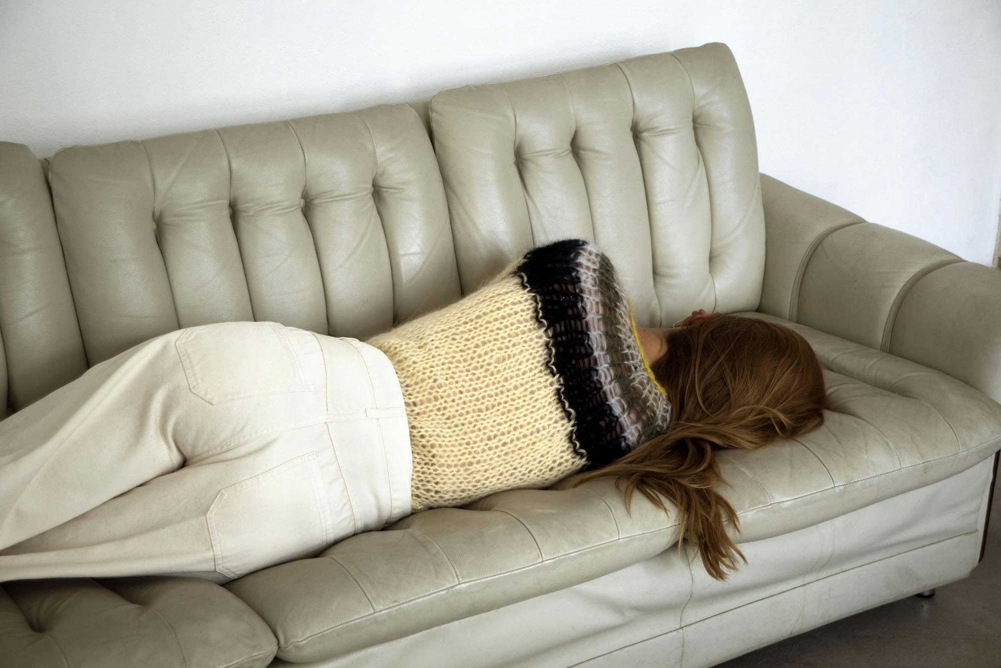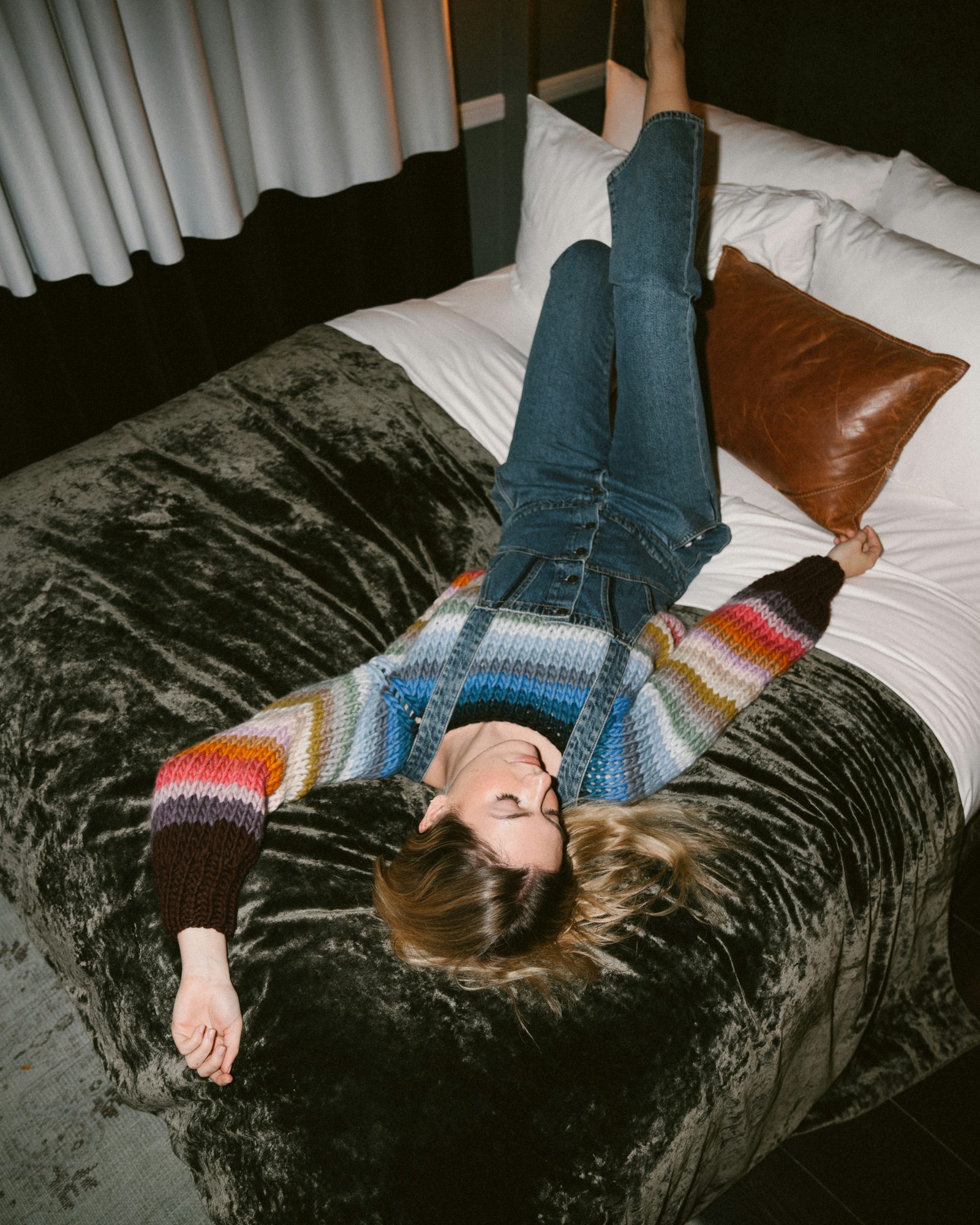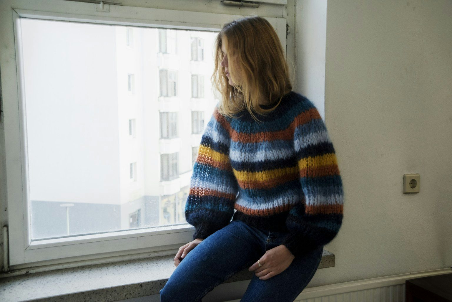 Oh, das kommt sehr darauf an. Unser typischer Style ist ja der Loose Knit, ein leichtes, feines Garn, auch mal mehrfädig, was mit einer großen Nadel gestrickt wird. Da brauche ich dann so 4–5 Stunden ohne Finishing. Aber das kommt natürlich auch immer darauf an, wie viele Fadenwechsel man hat, wie bunt der Pullover ist und welches Muster er hat. Wenn ich gerade ein neues Modell entwickle, dann sitze ich ja auch da und denke: Hm, was nehme ich jetzt als Nächstes? Es ist nicht immer gut, vorher alles zu planen, ich schaue auch, wonach ich intuitiv greife.