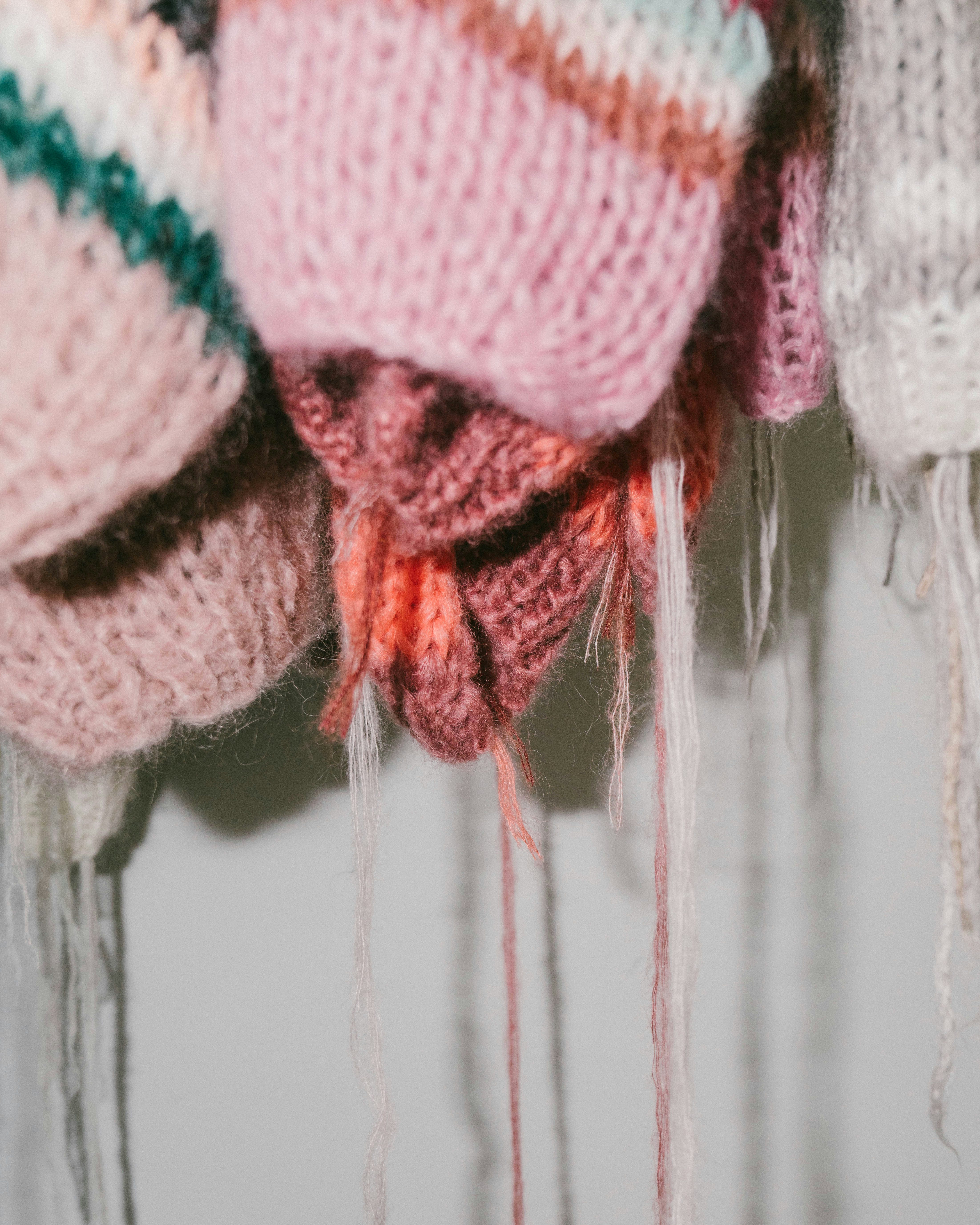 Das ist schwer zu sagen. Gerade ist mit der Kollektionsvorbereitung eine intensive Zeit, da ist es wieder mehr. Wenn ich selbst stricke und die textile Fläche gestalte, kommen dabei tatsächlich andere Ergebnisse heraus, als wenn man alles digital anlegt. Ich versuche aber mehr und mehr davon wegzukommen, ganze Styles zu stricken, weil das mit meinen anderen Aufgaben nicht mehr kompatibel ist. Diese unterschiedlichen Geschwindigkeiten, das Business und die Kommunikation sind so schnell, aber das Stricken ist so unfassbar langsam, dass ich es auch einfach manchmal nicht mehr aushalte, zwischen diesen zwei Zuständen zu wechseln. Privat stricke ich es allerdings kaum noch.