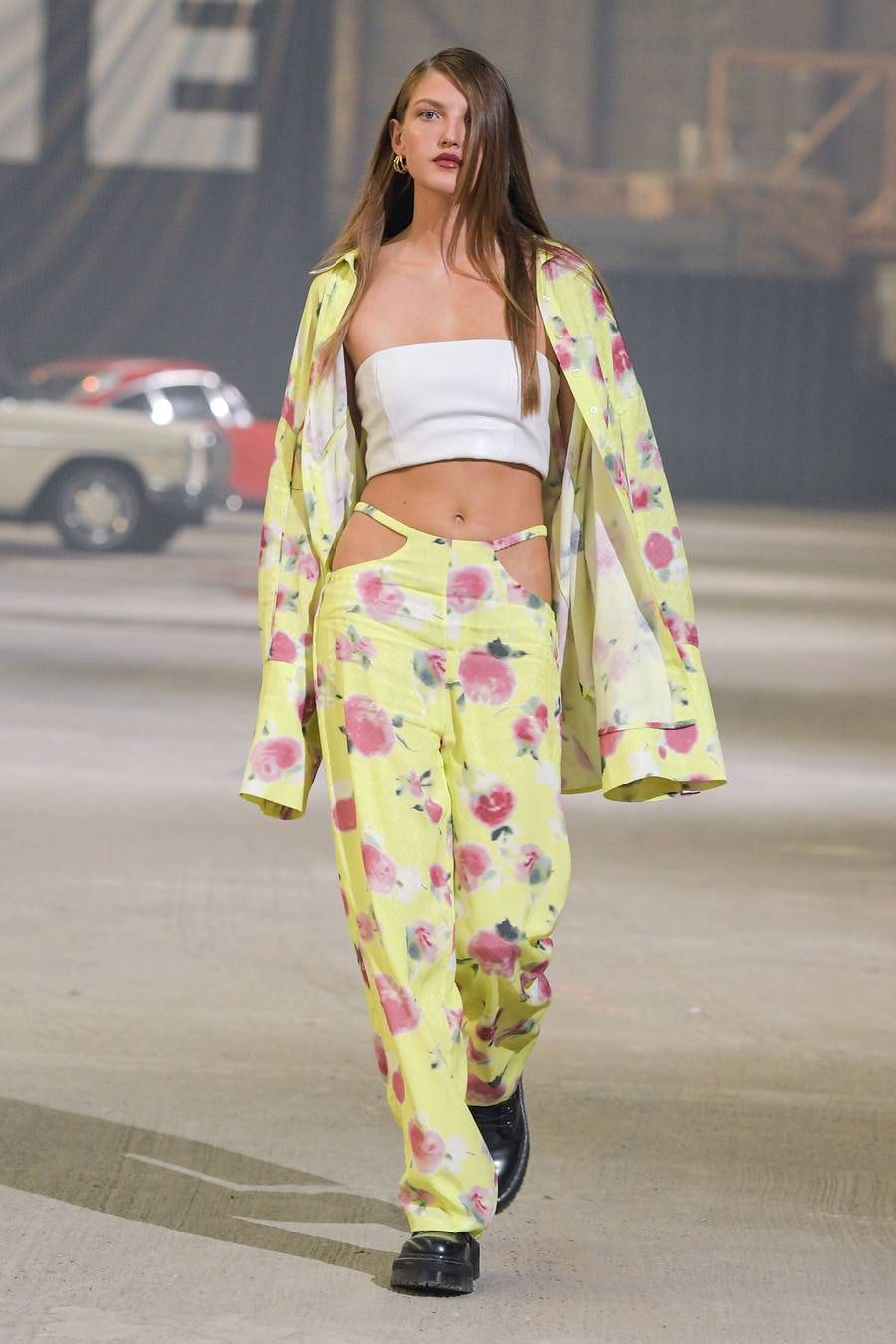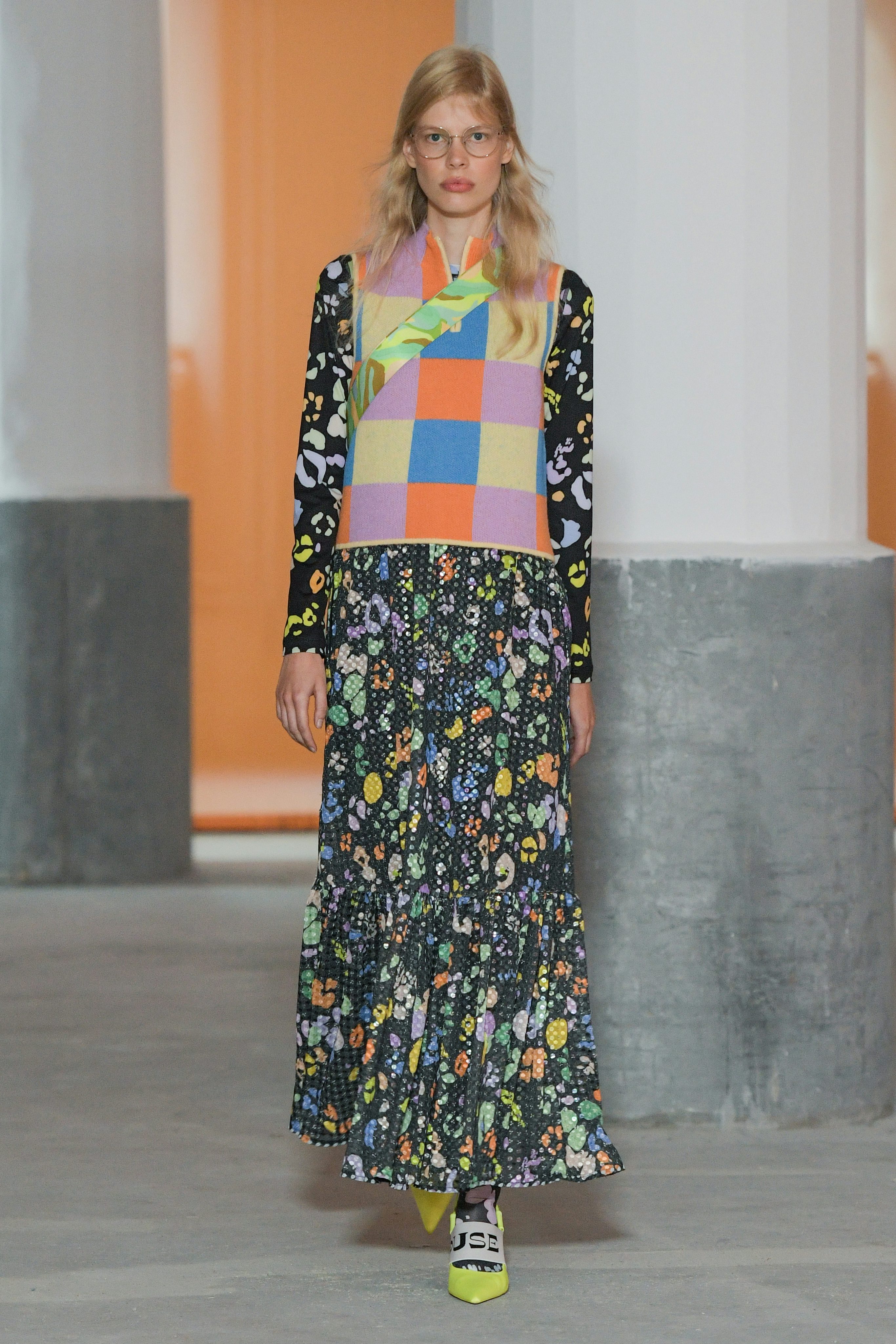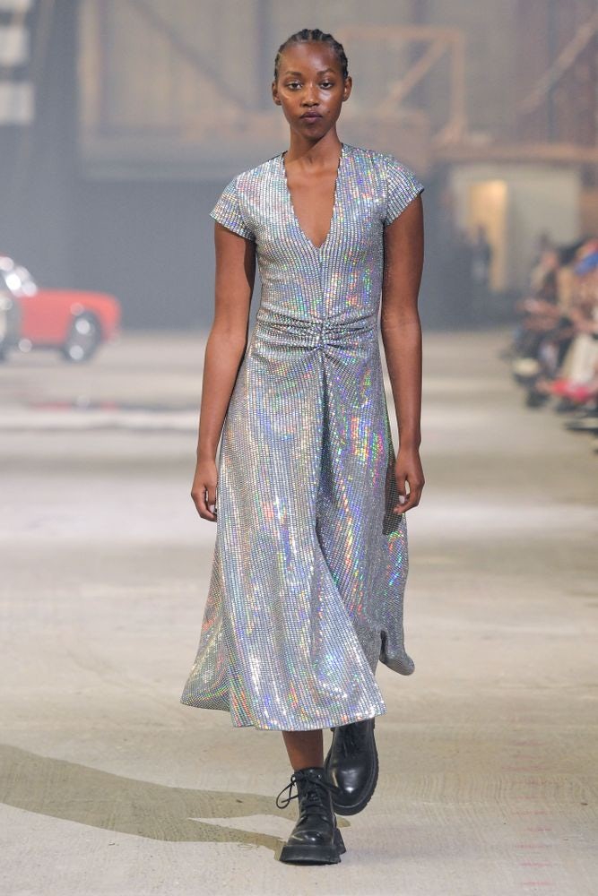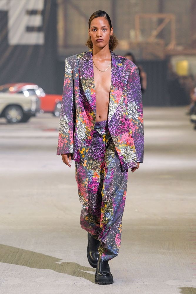 Mit dem Setting, einer Oldtimer-Show in einer riesigen Halle, landeten sie zudem mit einer der aufregendsten Locations der Saison einen Hit. Sie wurden viel von den 90er-Jahren und „Der Nanny“ aka Fran Fine inspiriert, was sich in jeder Menge Pailletten, Body-Con-Kleidern und psychedelischen Prints auf Suits und Dresses zeigte.
