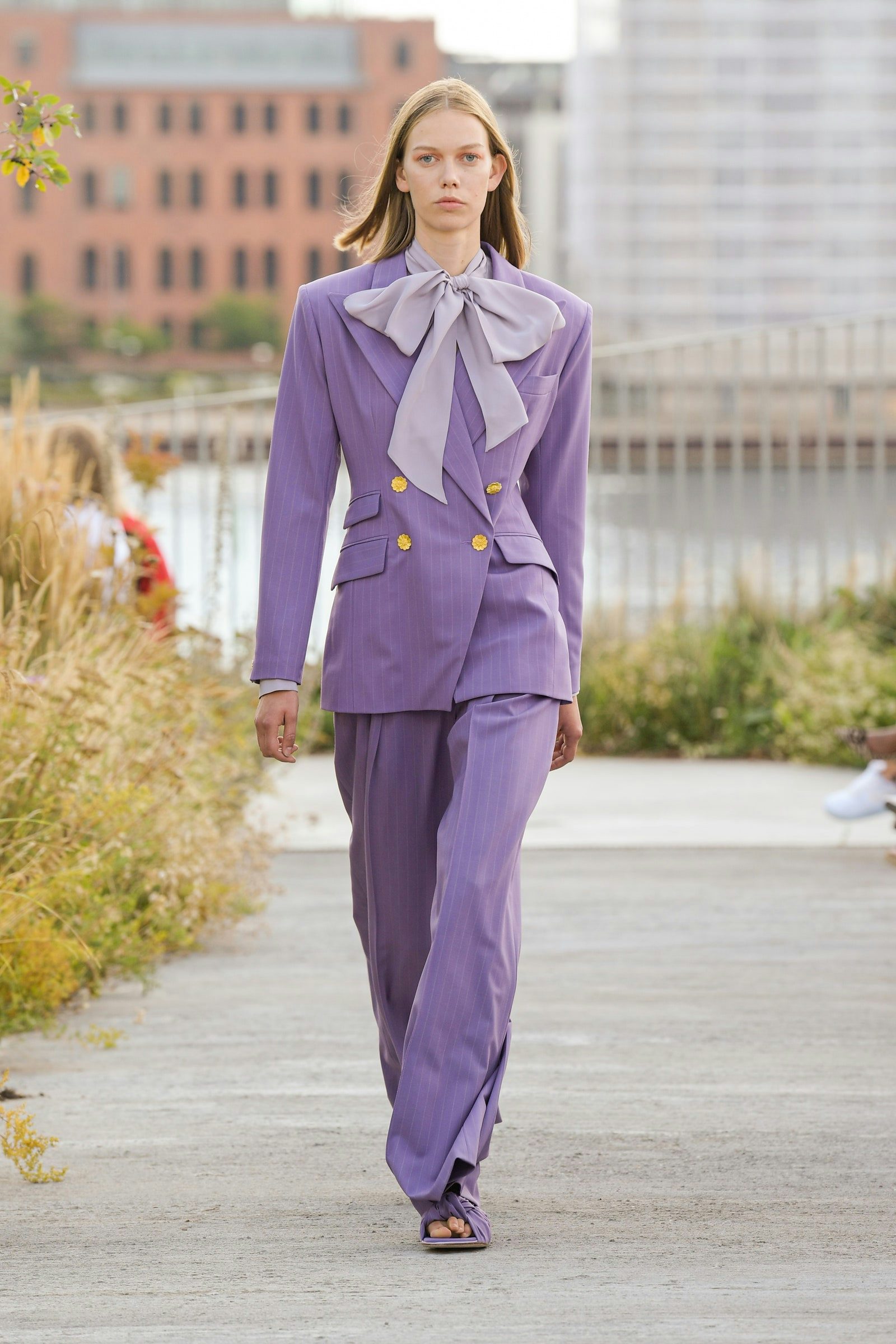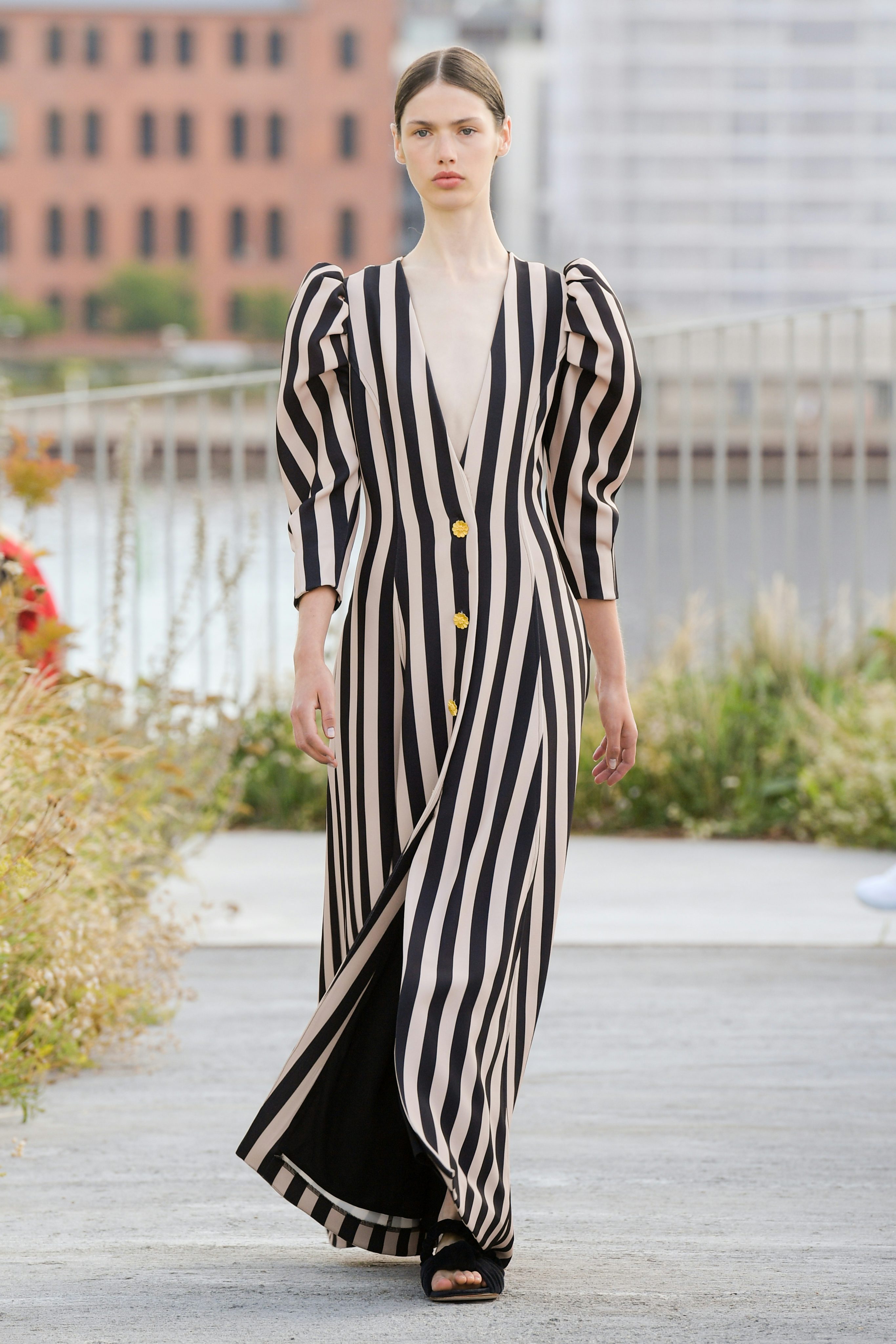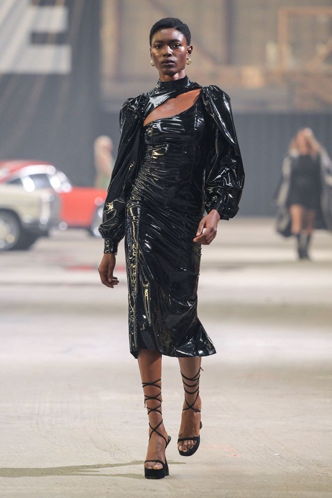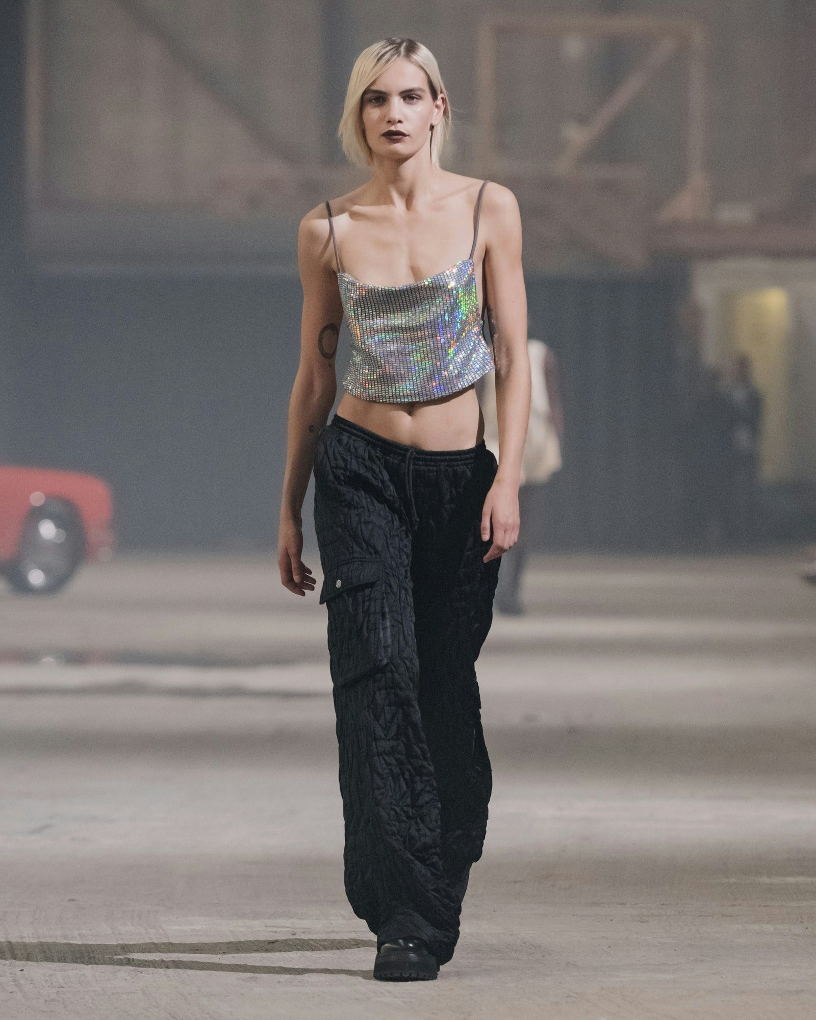 Mit dem Setting, einer Oldtimer-Show in einer riesigen Halle, landeten sie zudem mit einer der aufregendsten Locations der Saison einen Hit. Sie wurden viel von den 90er-Jahren und „Der Nanny“ aka Fran Fine inspiriert, was sich in jeder Menge Pailletten, Body-Con-Kleidern und psychedelischen Prints auf Suits und Dresses zeigte.