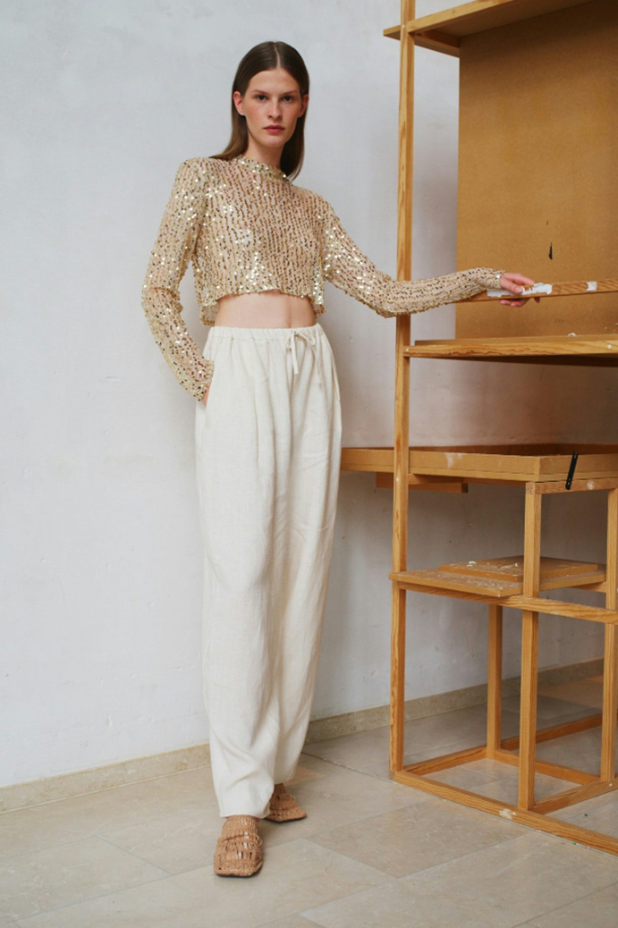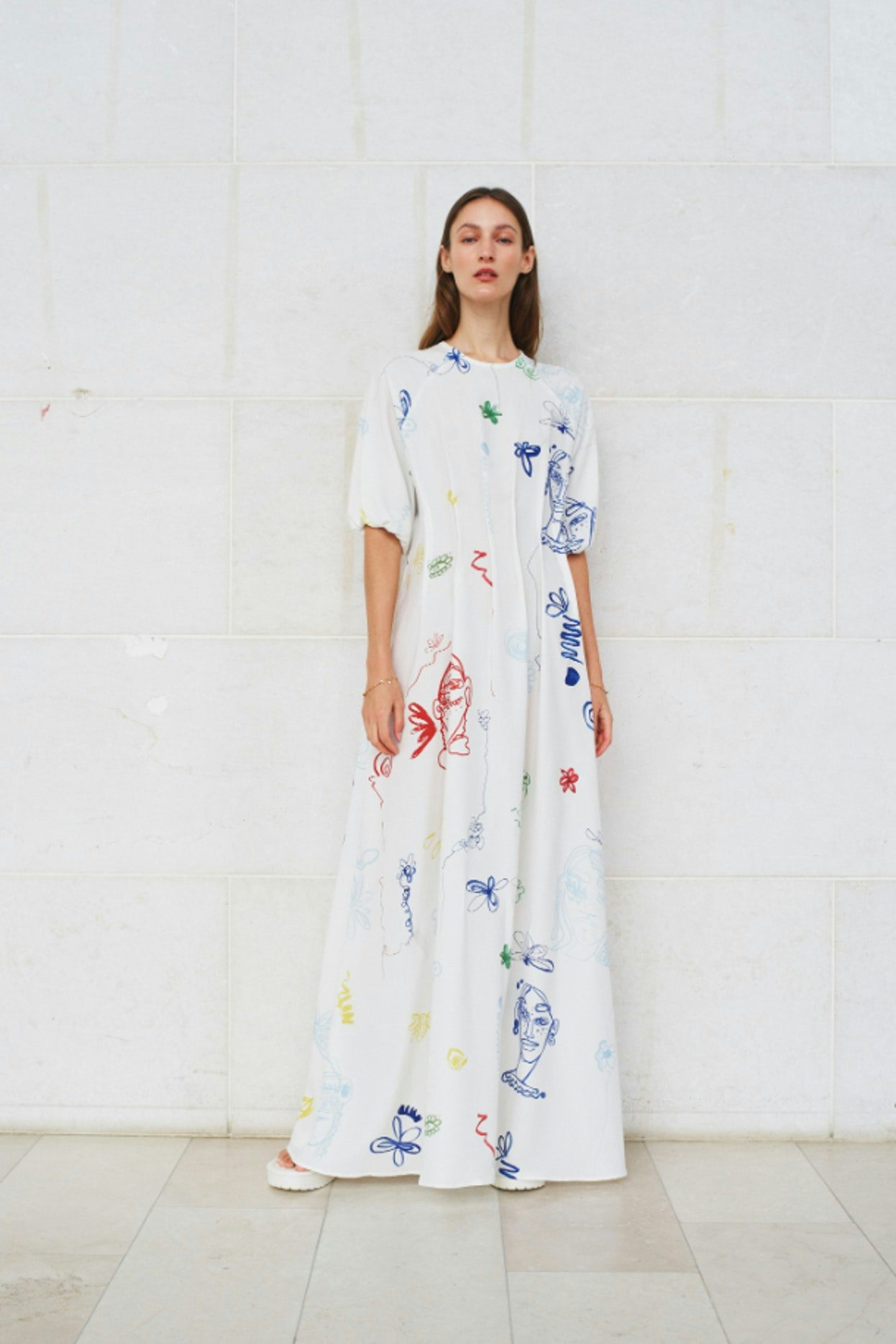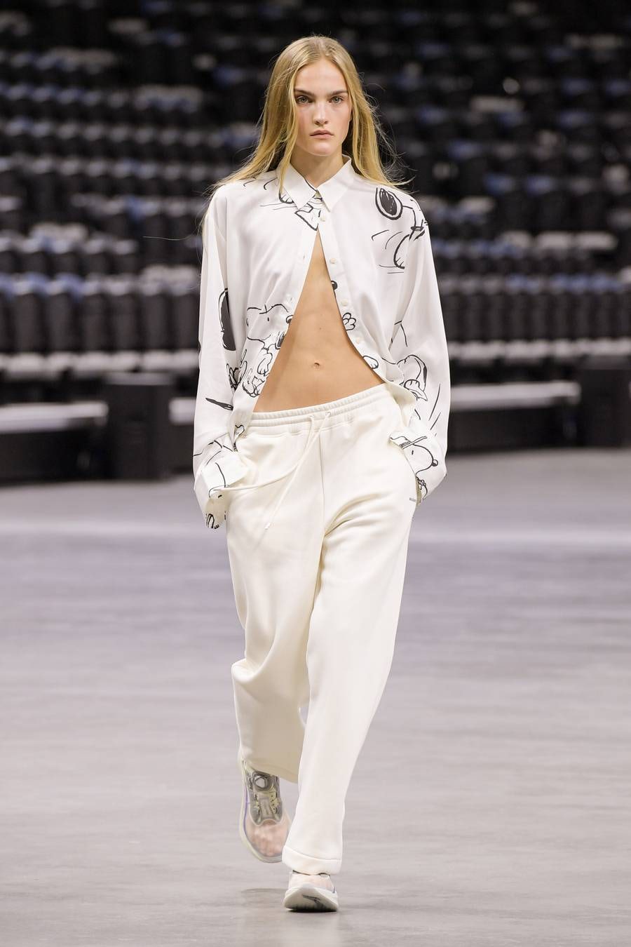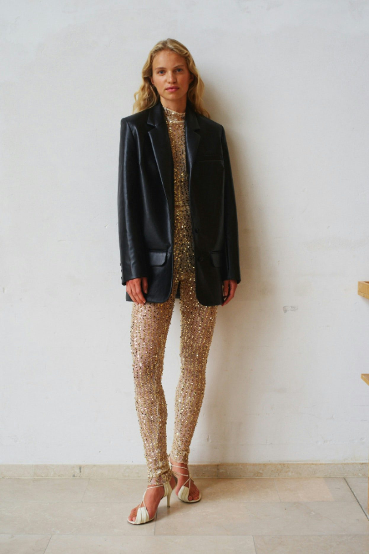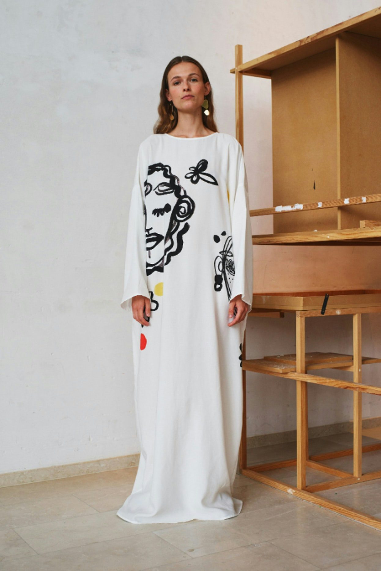 Mit dabei waren wahre Malaikaraiss-Klassiker wie taillierte Anzüge in zarten Creme- und Weißtönen, aber auch Maxikleider mit Zeichnungen von Künstlerin Anna Zimmermann, mit der die Designerin schon limitierte Kunsteditionen vertreibt. Ergänzend dazu kamen Pailletten-Looks, die noch nie so cool und underdressed gewirkt haben wie in der Kombination mit Lederblazer und Trackpants.