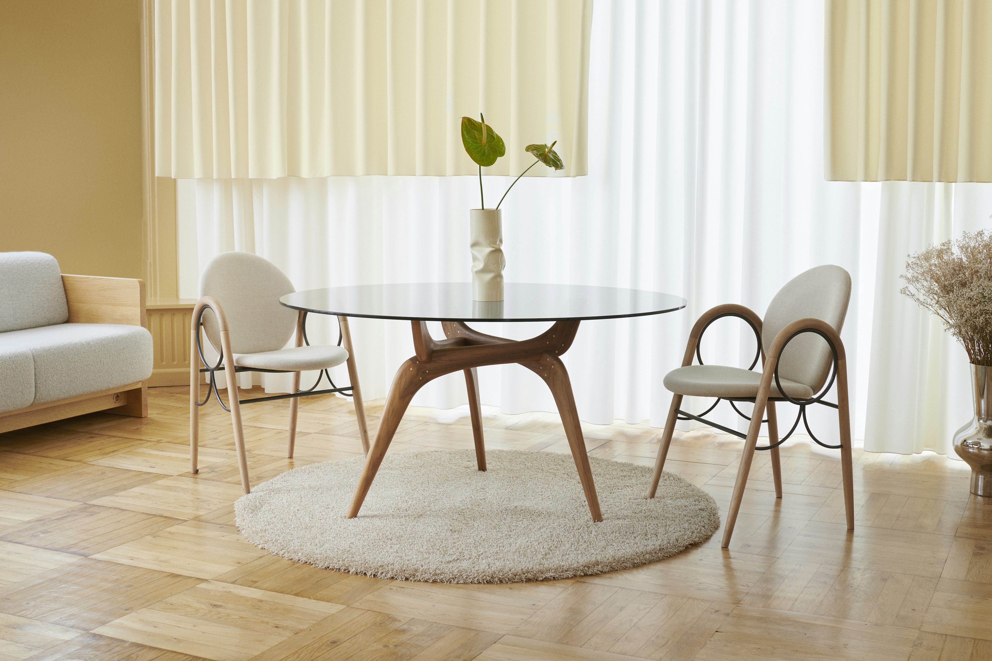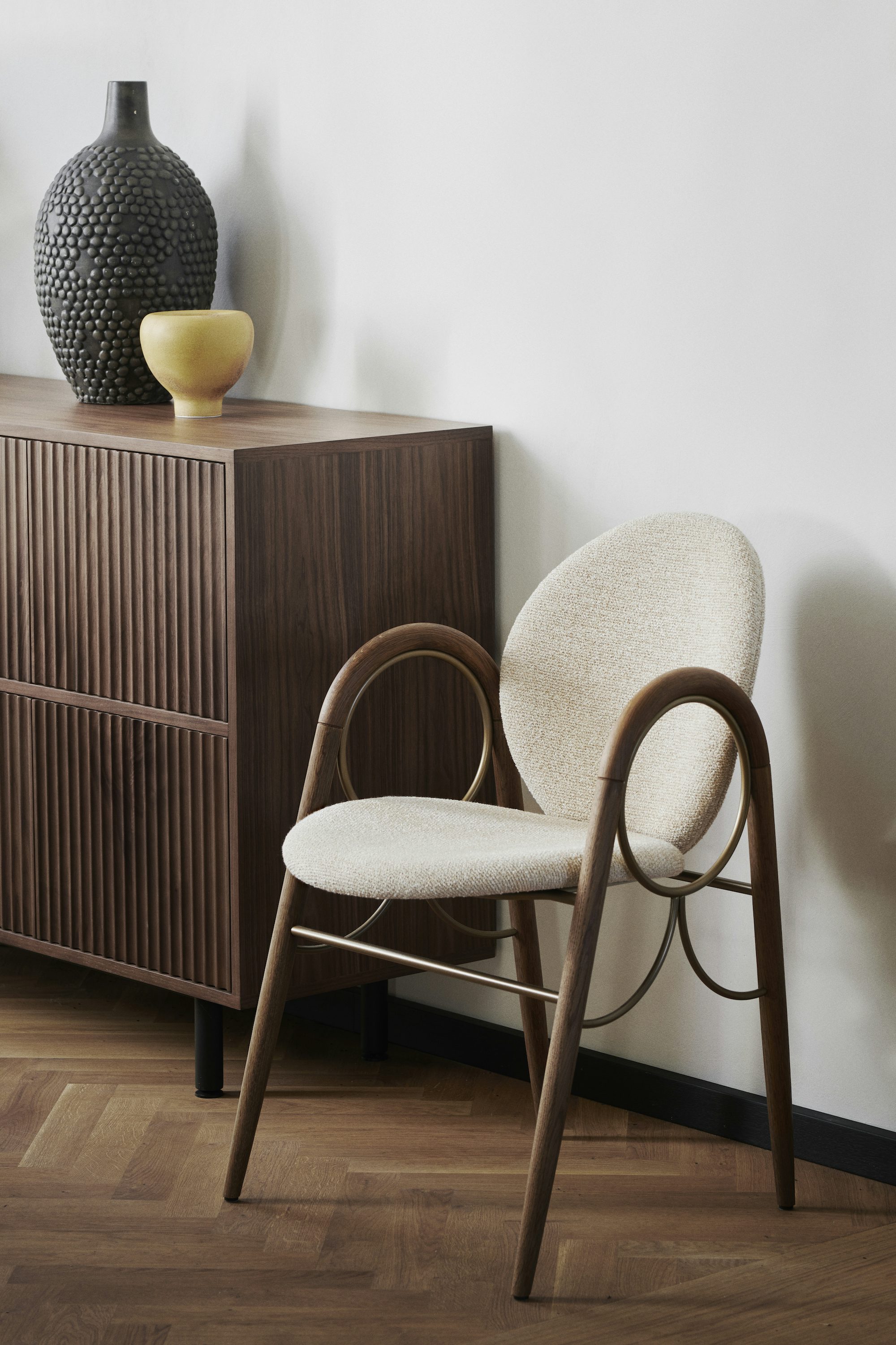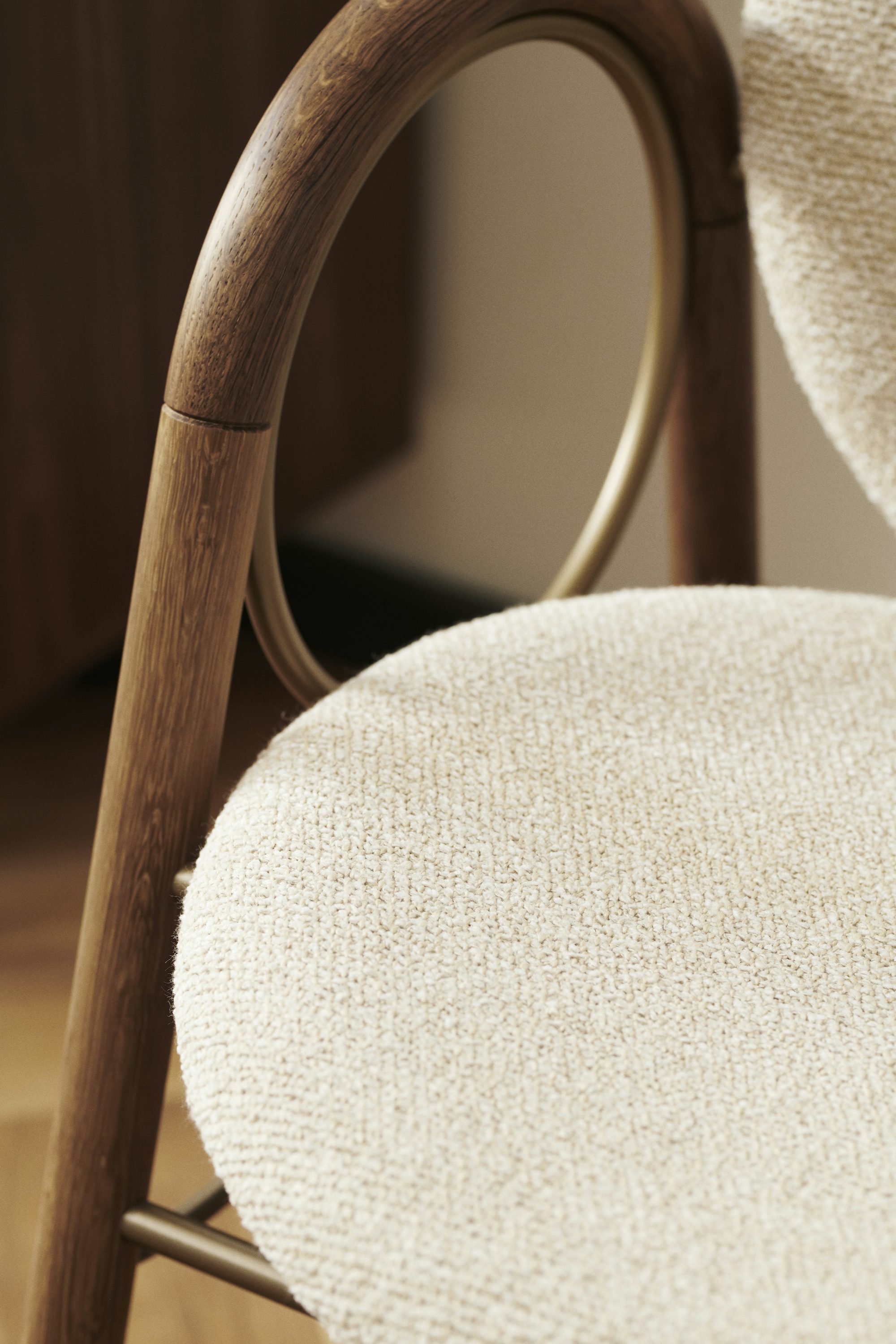 Inspiriert durch klassische Architektur und geometrische Formen, entwarf Nanna Ditzel 1983 den Arkade Chair. Hergestellt wird er von Brdr. Krüger und steht für skandinavisches Design und dänische Handwerkskunst. Die zwei markanten Bögen, die durch die gebogenen Holzbeine entstehen, geben dem Stuhl seine unverwechselbare Form und sind zugleich namensgebend. Als Erweiterung des ursprünglichen Designs, bringt Brdr. Krüger den Stuhl nun in neuen Materialkombinationen heraus. Dabei sorgt ein feiner Bouclé-Stoff sowie Details in Messing-Optik für eine warme Wirkung und ergänzen den ansonsten schlichten Entwurf.
