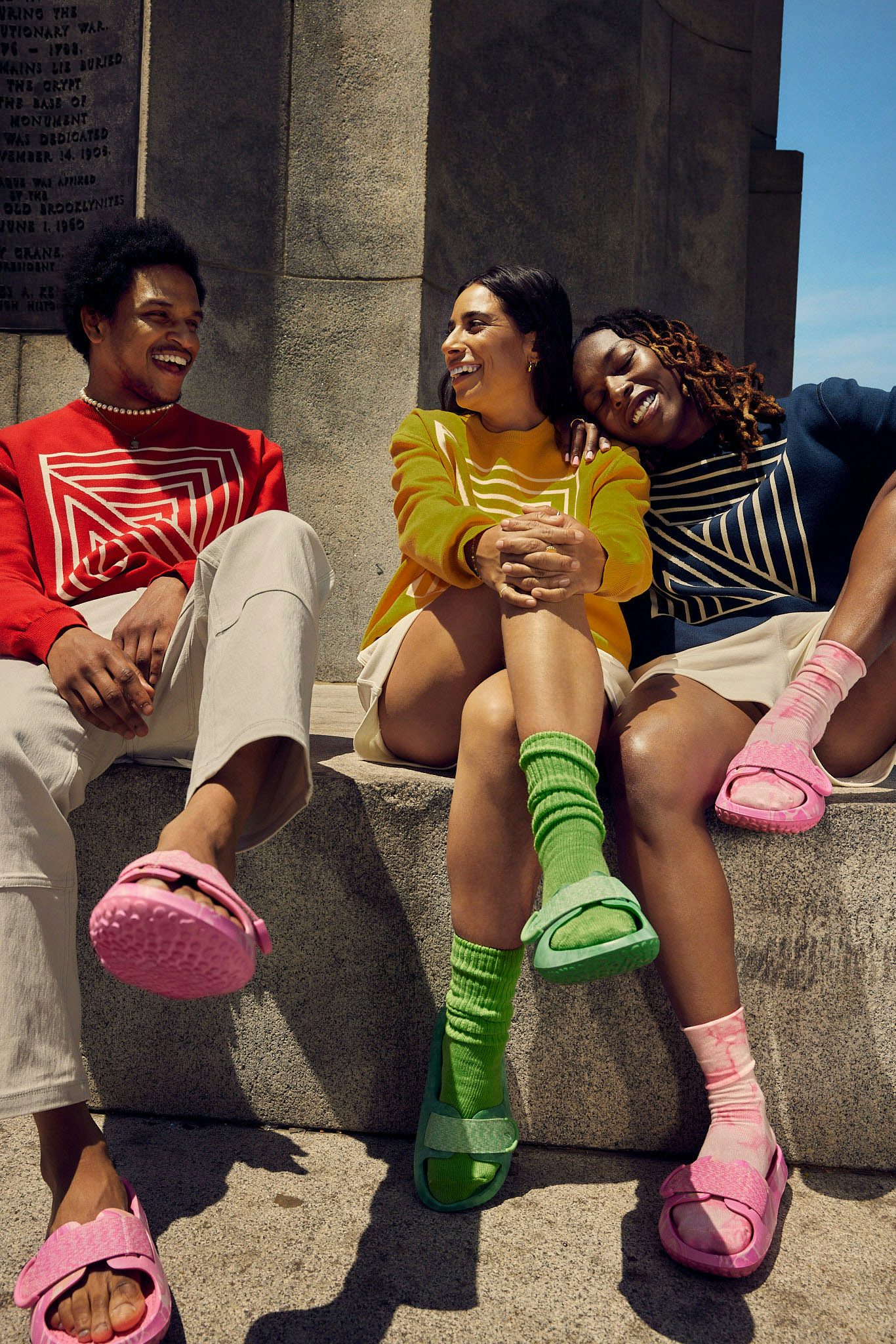 Zusammen mit Rosie Assoulin sind dabei zwei knallige chubby Sandals herausgekommen, der aus dem eigens hergestellten Sweet Foam von Allbirds, einem auf Zuckerrohr basierenden Schaumstoff basiert, was den Schuh zu einem klimaneutralen Modell macht.