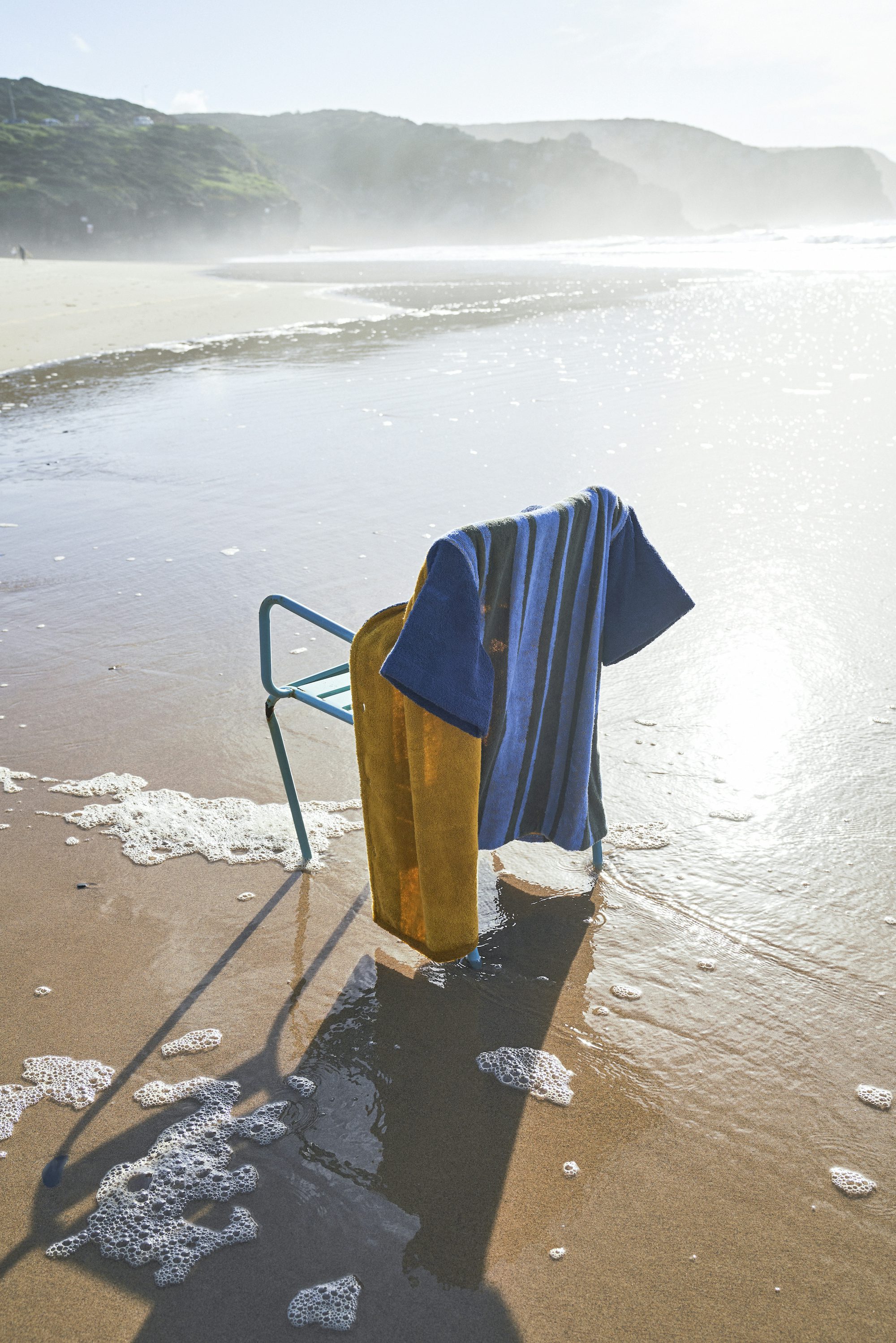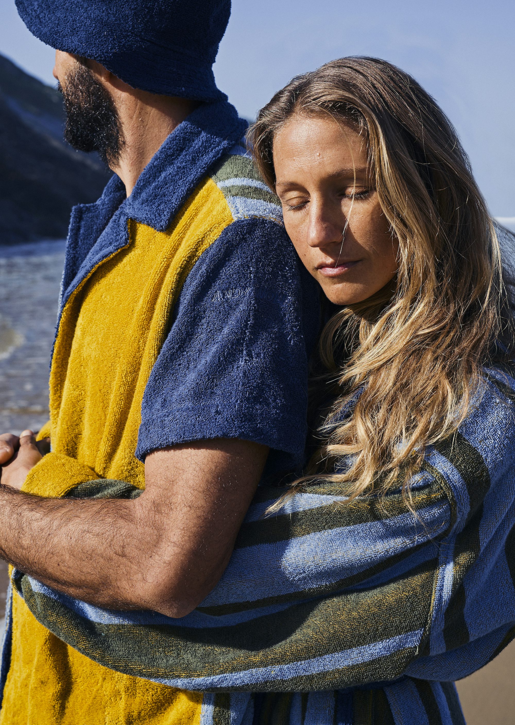 Da kommt die Kooperation von Andy Wolf und Vossen, einem österreichischen Textilunternehmen spezialisiert auf Handtücher, Bademäntel und Badeteppiche aka Frottierwaren, genau richtig. Zusammen haben sie eine achtteilige Beachkollektion aus Frottee mit zwei passenden Acetat-Brillen entworfen.