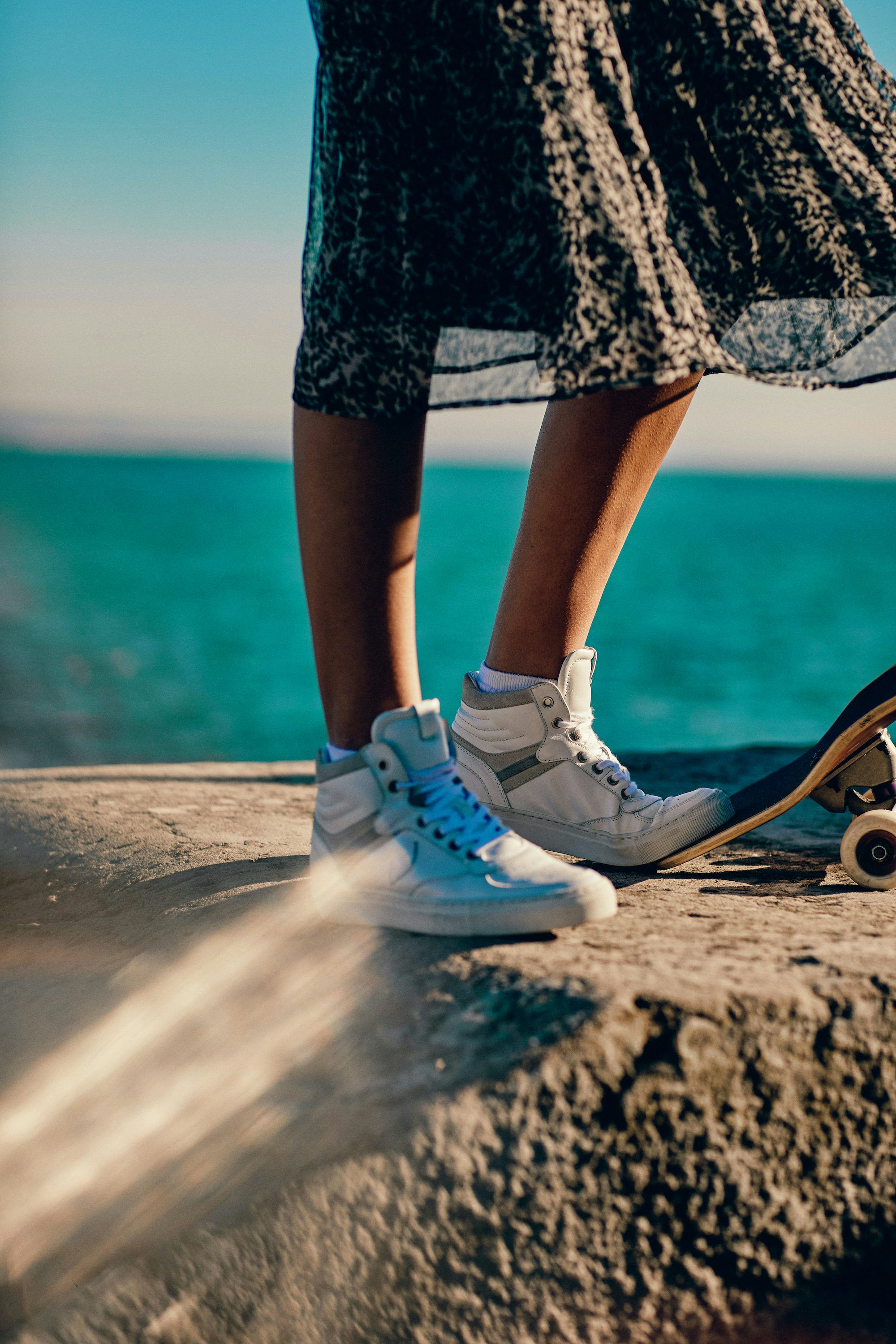 Die neuen nachhaltigen Crush Sneaker von Ba&sh lösen genau das in mir aus: Ich bin verliebt. Die knöchelhohen Modelle, die es in schlicht weiß, aber auch mit farbigen Akzenten gibt, machen mich vielleicht auch ohne Meer und Skateboard zum Surfer/Skater-Girl. Ob zu Kleidern, Röcken, Jeans oder Shorts, ich glaube, dieses Modell sieht einfach immer gut aus.