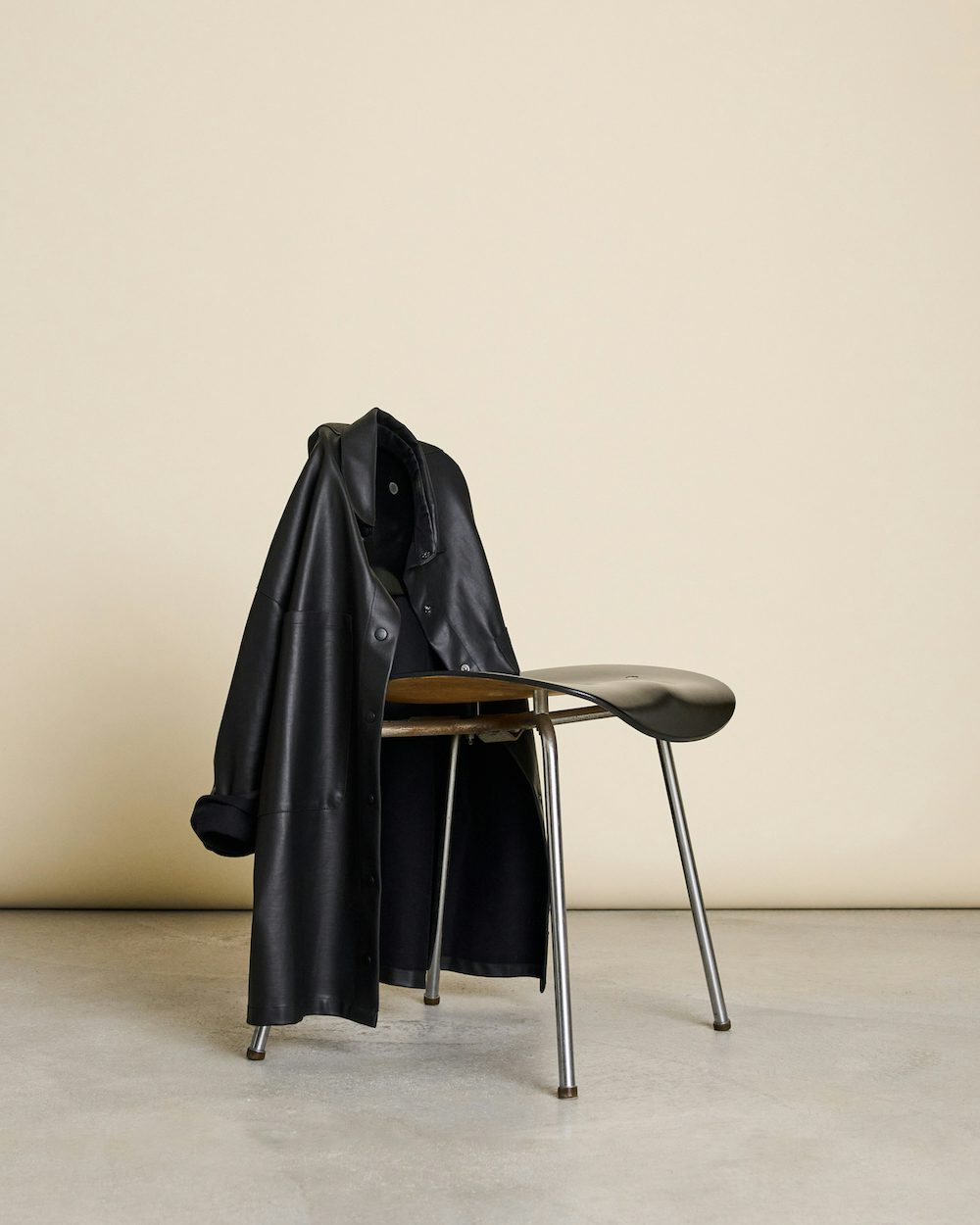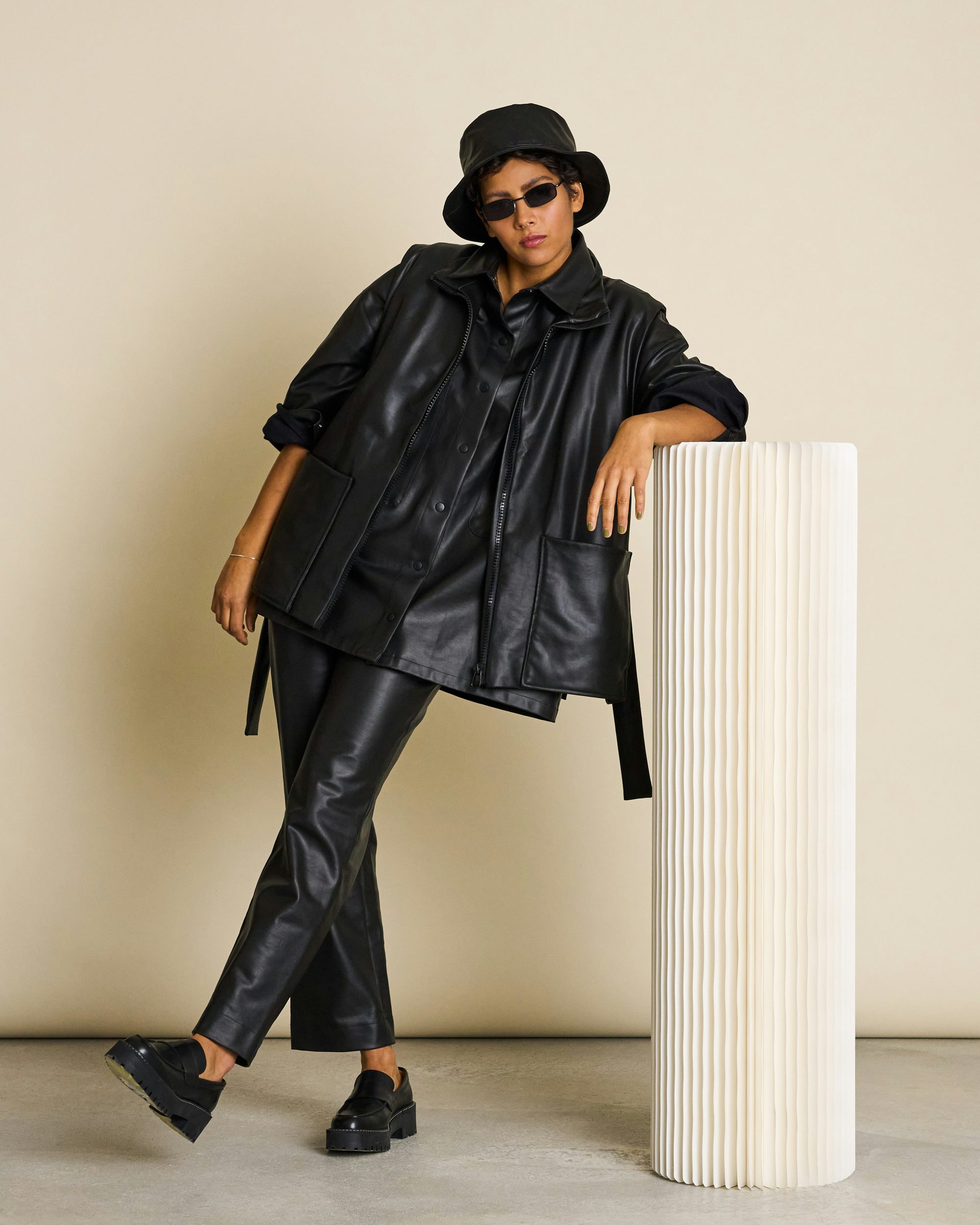 Doch das vegane Leder, das durch Polyurethan auf Wasserbasis 100 Prozent Biobaumwolle beschichtet wird, ist eine der nachhaltigsten Varianten auf dem Markt. Das Material stammt aus Portugal, genäht wird in Polen und es gibt ein Overshirt, eine Weste und eine Hose.