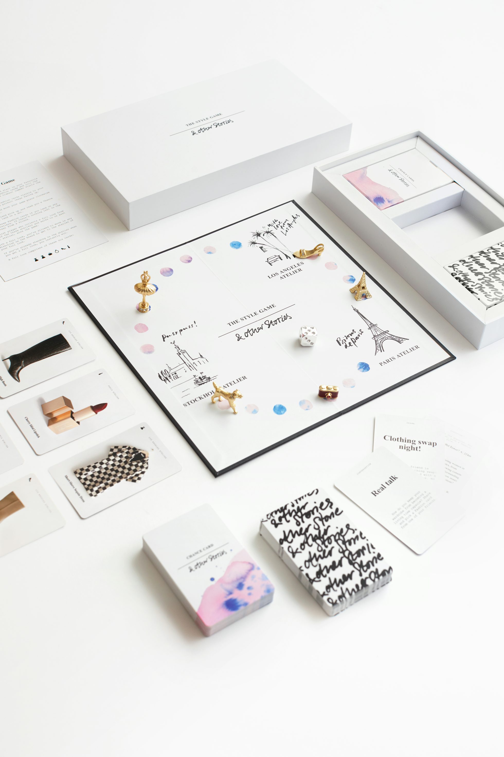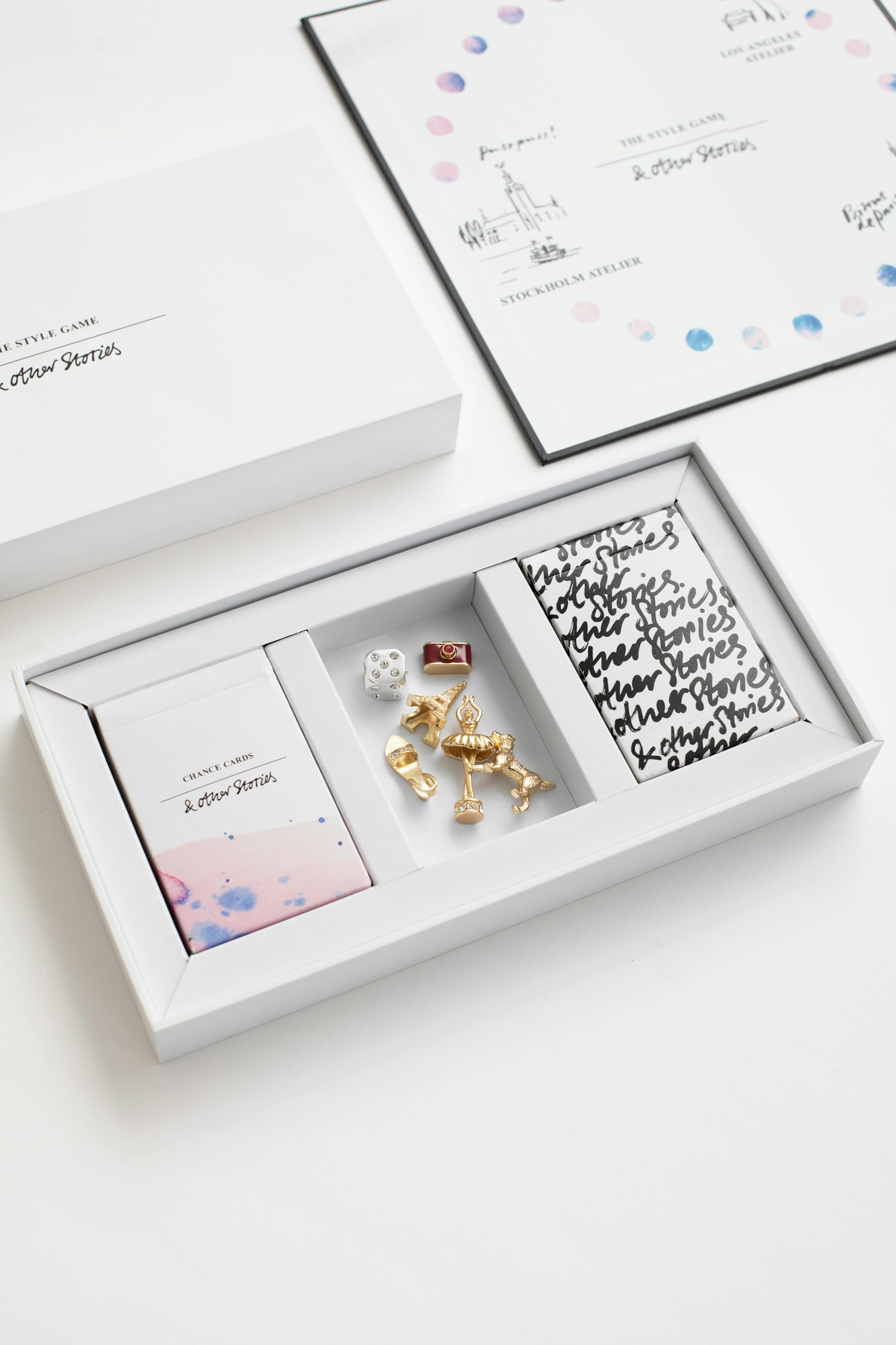 „The Style Game ist ein Multiplayer-Brettspiel zum Thema Mode, bei dem jede*r Spieler*in durch eine kleine Spielfigur aus goldenem Messing repräsentiert wird. Jede*r Spieler*in beginnt in seinem Lieblingsatelier – Stockholm, Los Angeles oder Paris – und würfelt, um sich auf dem Spielbrett zu bewegen und Modekarten aus den Ateliers zu sammeln. Die/der erste*r Spieler*in, die/der einen kompletten Look aus einem der drei Ateliers sammelt und in oder an dieser Stadt vorbeigeht, gewinnt das Spiel. Auf dem Weg dorthin treffen die Spieler auf Karten mit Quizfragen, echten Schätzen, Reisen, Gesprächsanregungen und ein bisschen Drama! Das Spiel enthält Fragen über Mode, Kultur und inspirierende Frauen.“