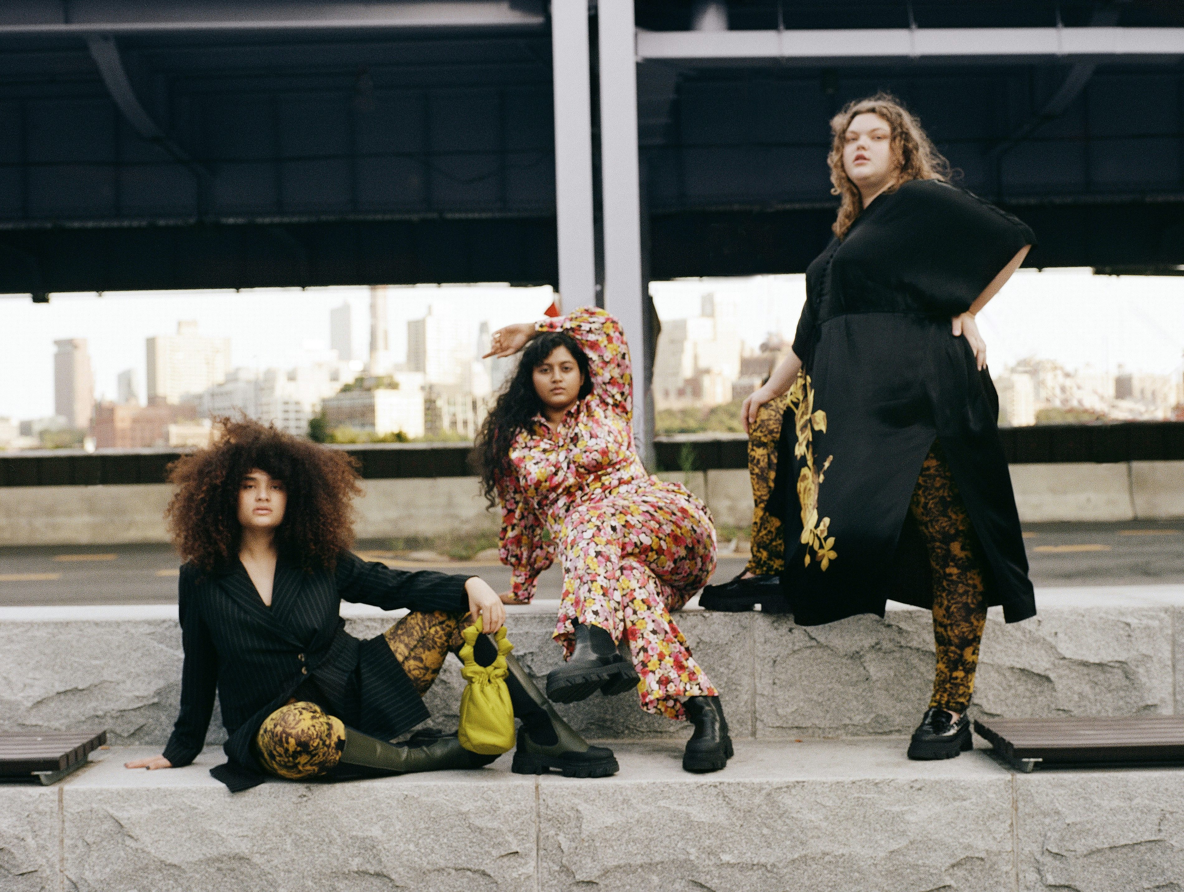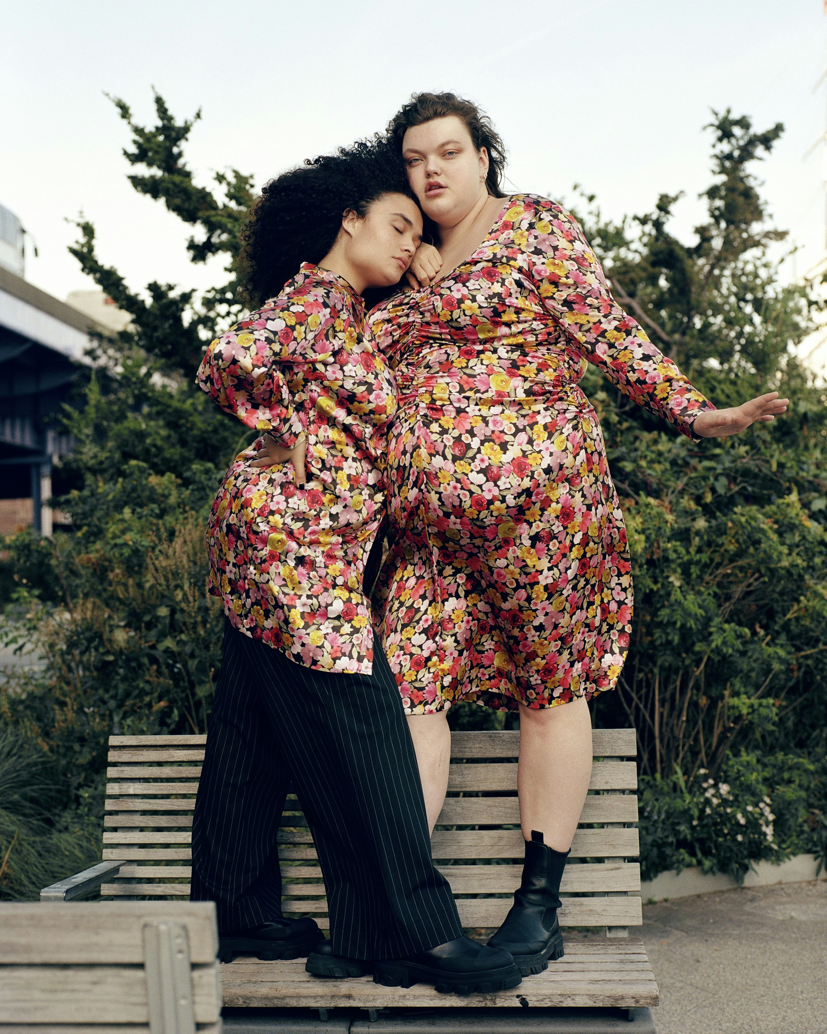 Doch bis dahin feiern wir die Kinderschritte und jedes Label, das die Not in Sachen Größenspektrum sichtbarer macht. So zum Beispiel auch Ganni, die mit ihrer Capsule Collection mit 11 Honoré eine kleine Kollektion namens Love Drop in den Größen 32 bis 52 anbieten. Dabei bleibt die Ganni-DNA mit den Blumenmustern, Power-Suits und Wickelkleidern zu 100 Prozent erhalten.