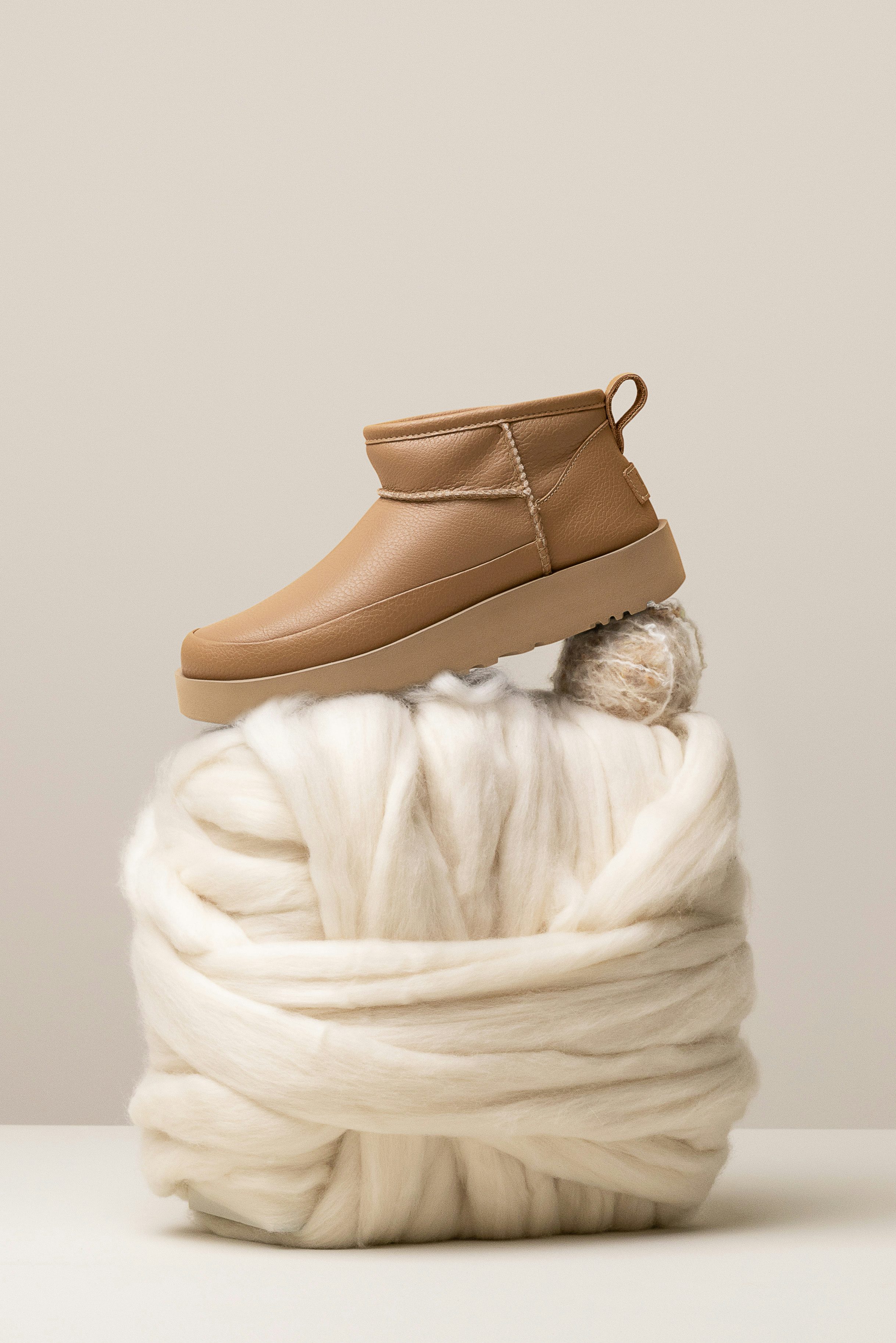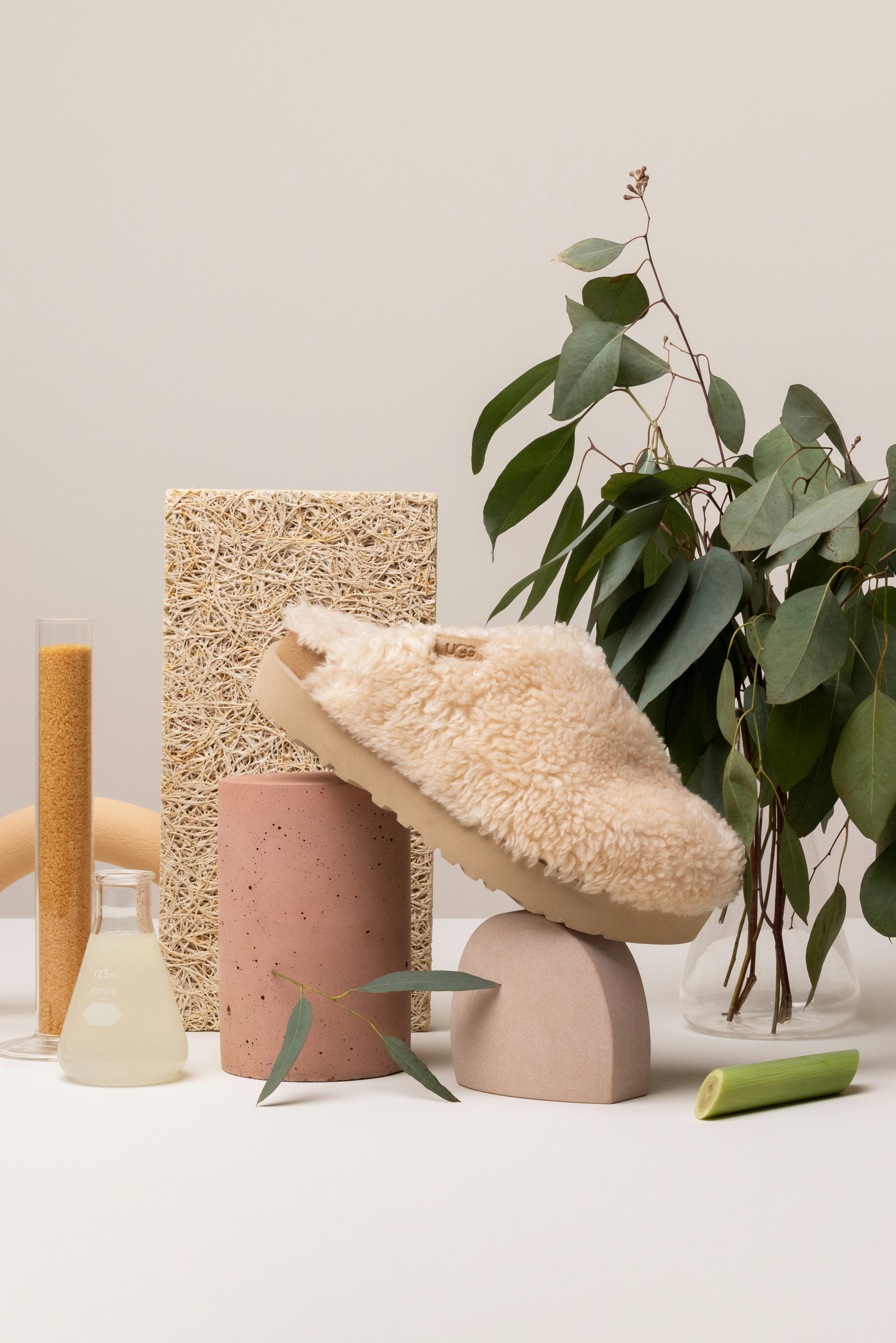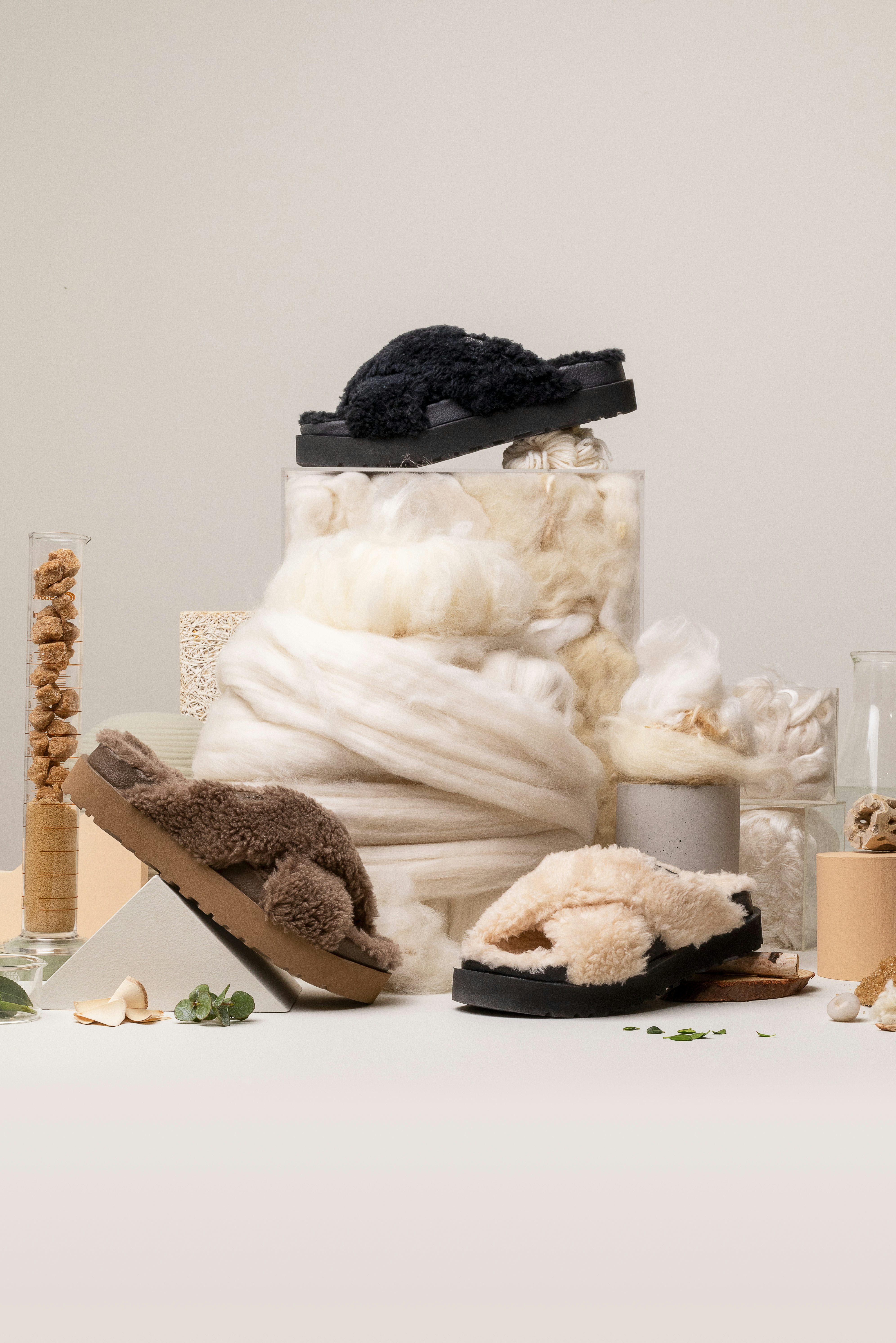 Für die Herbst-Winter Kollektion „Icon-Impact Collection“, hat Ugg zwei Innovationen entwickelt, die wiederaufbereitete Wollabfälle in neue Materialien verwandeln: erneuerbares Zuckerrohr sowie recyceltes PET, womit über 350.000 genutzte Plastikflaschen wiederverwertet werden – das sind rund zwei bis drei Flaschen pro Paar Schuhe!