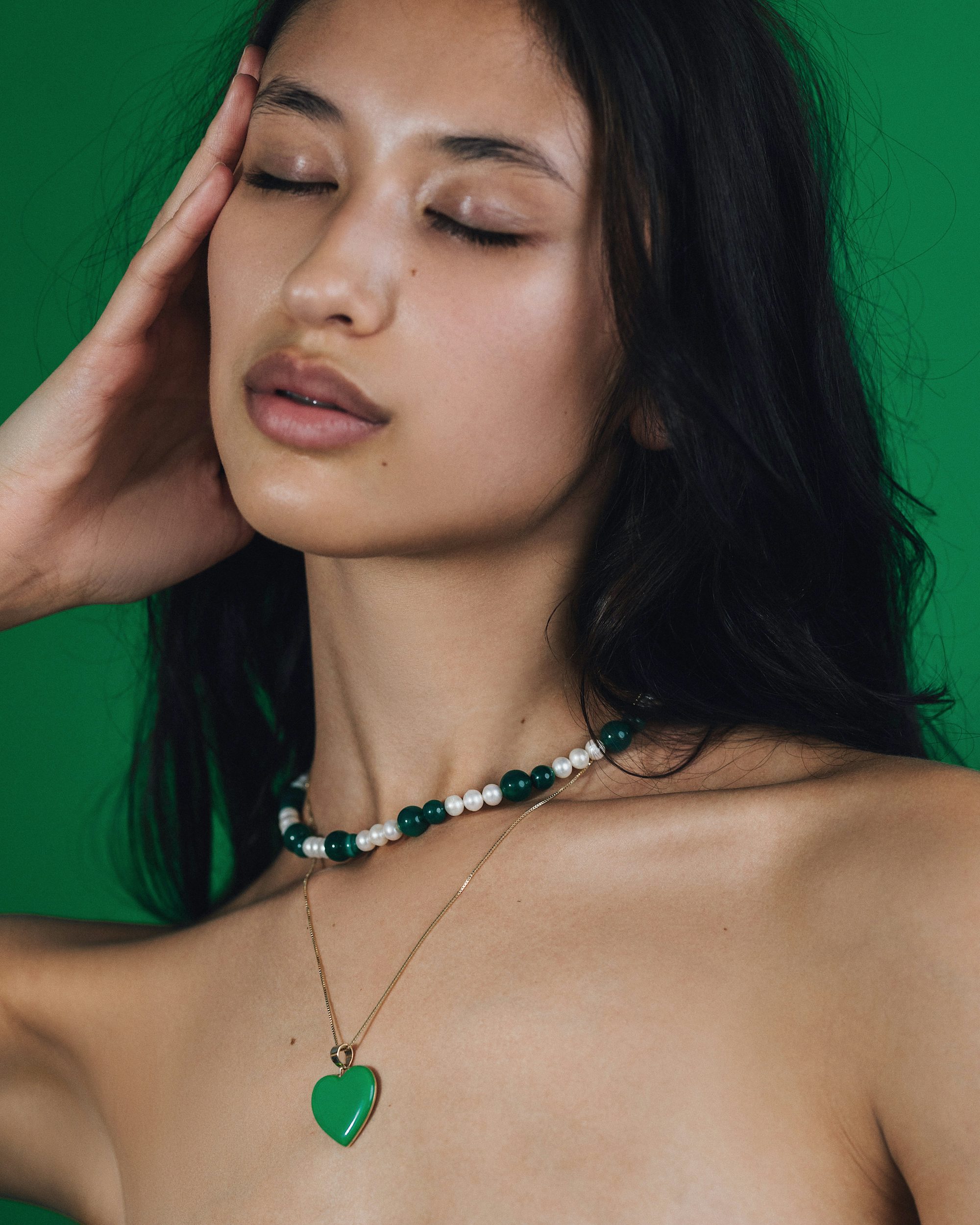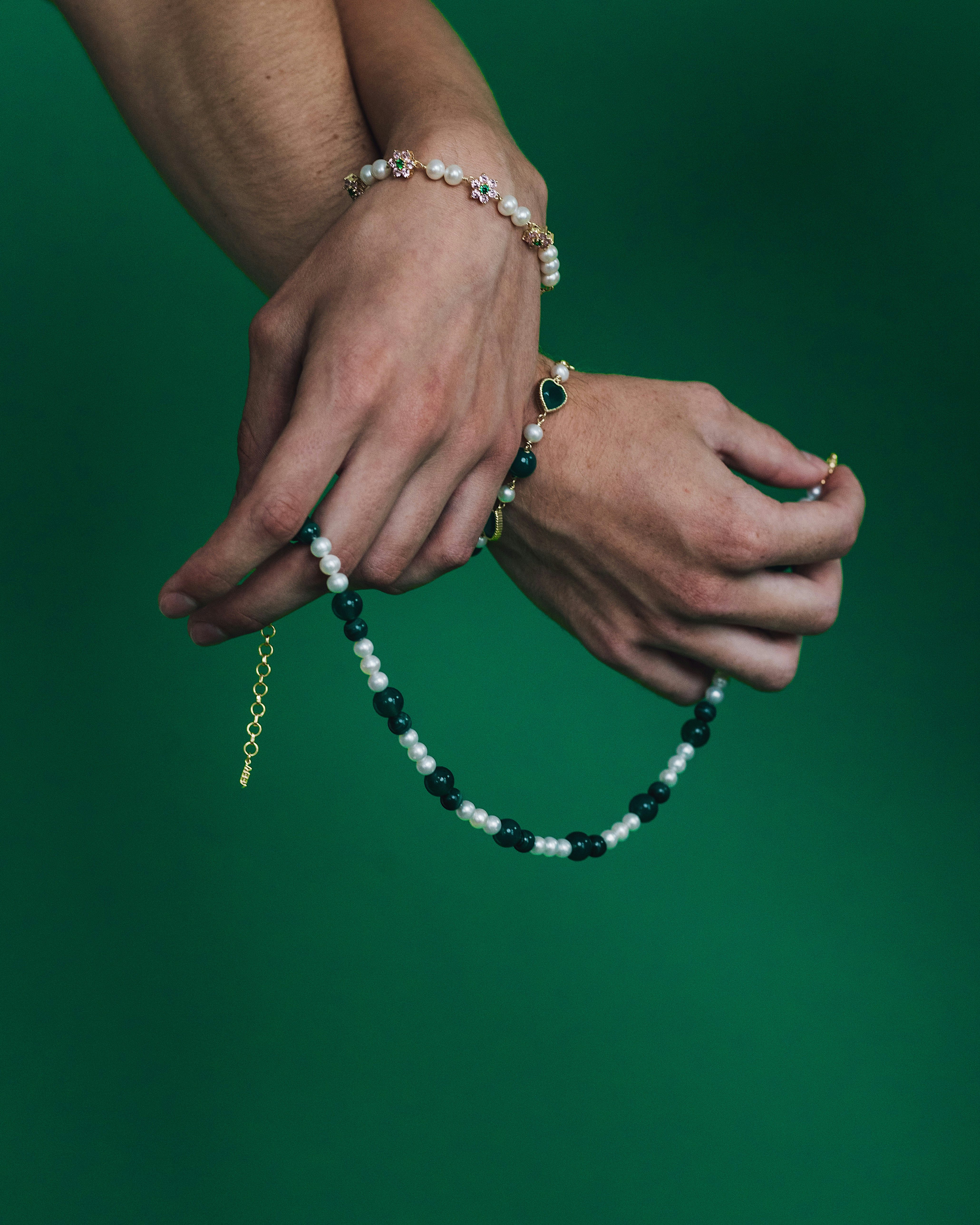 Julia mischt für die neue Kollektion Perlen mit grünen Edelsteinen, Emaille mit Gold und kreiert damit eine neue, frische Optik, die frei von Schubalden ist. Die siebenteilige Kollektion ist ab sofort erhältlich und stark limitiert. Also lieber schnell sein!