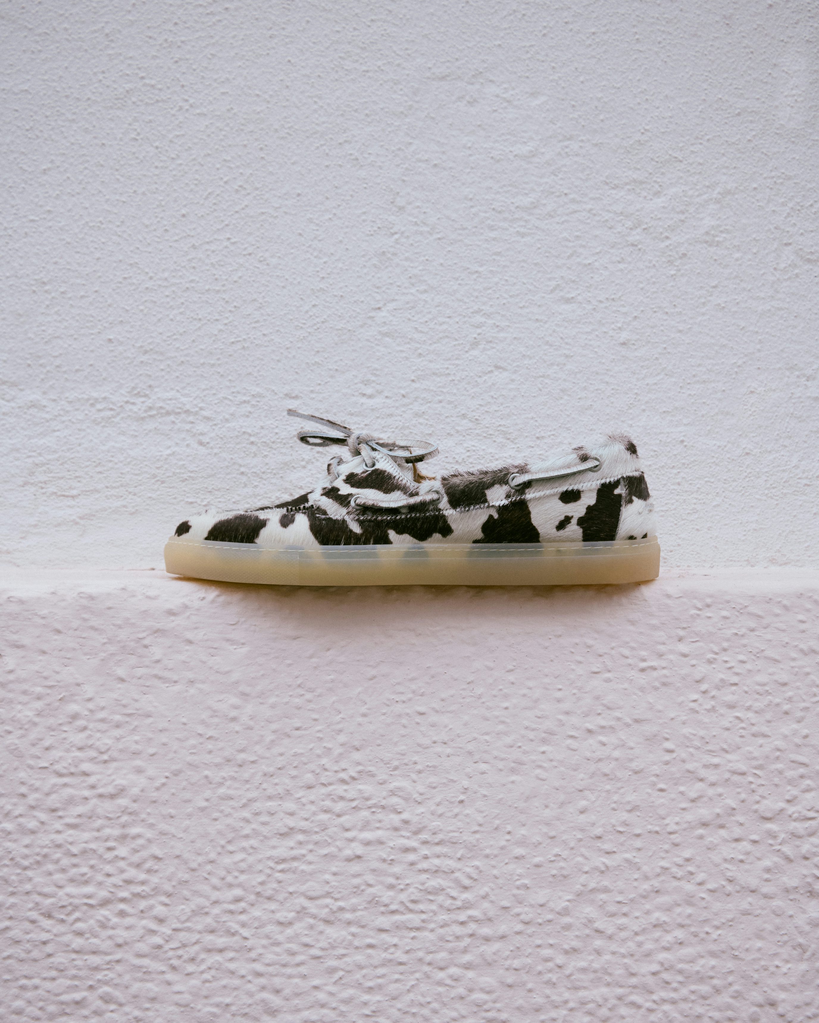 Minimalistisch im Schnitt, wild im Look – die Schuhe kommen in Felloptik, mit Leo- oder Kuhmuster, und sehen aus, als hätte man sie direkt aus einem Moodboard zwischen Kopenhagener Streetstyle und 70s-Arizona gepickt. Mein persönliches Highlight: die zwei Bootsschuh-Modelle in Leo und Cow Print – lässig, cool, und genau der richtige Stilbruch zu Leinenhose, Jeans oder Spitzenshorts.