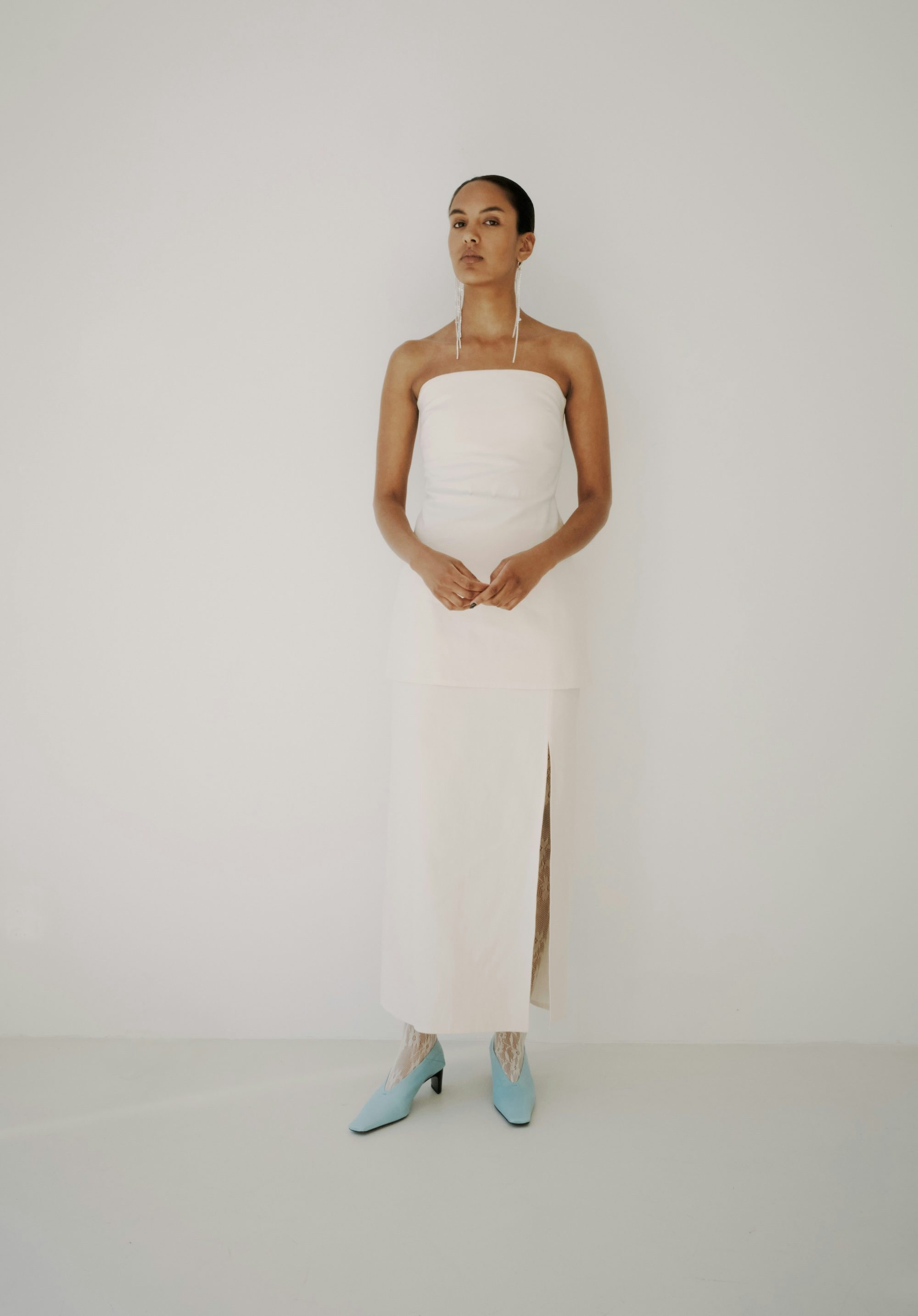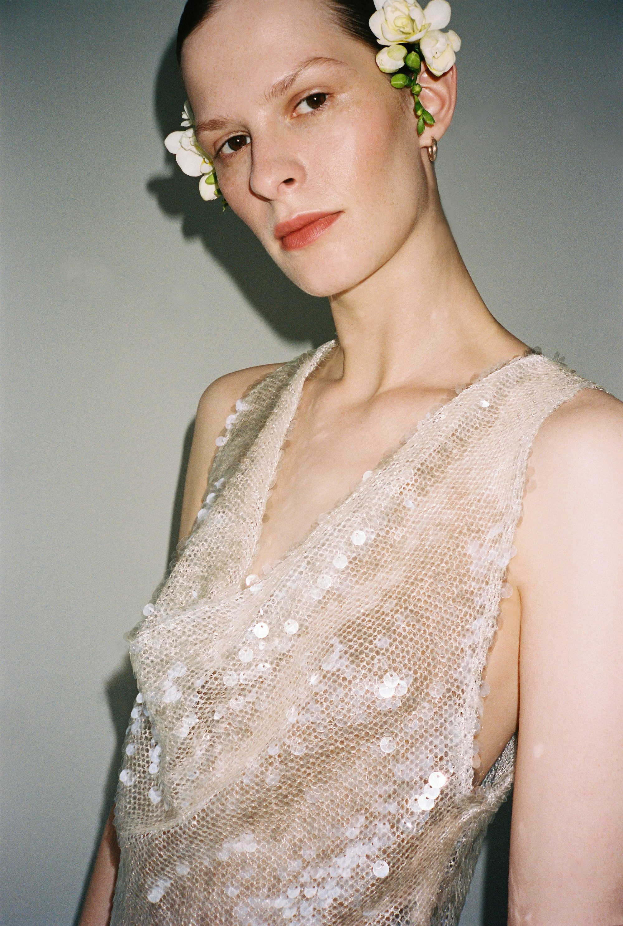 Im Mittelpunkt der Kollektion: Kontraste, die knistern. Zarte Crêpes treffen auf cooles Vinyl, Seidensatin flirtet mit schwerer Wolle, transparente Pailletten funkeln wie Wasser neben tiefem Samt. Die Schnitte? Carolyn Bessette-Kennedy mit Y2K-Twist – Wasserfall-Silhouetten, betonte Taillen und ein Hauch 90s-Minimalismus.