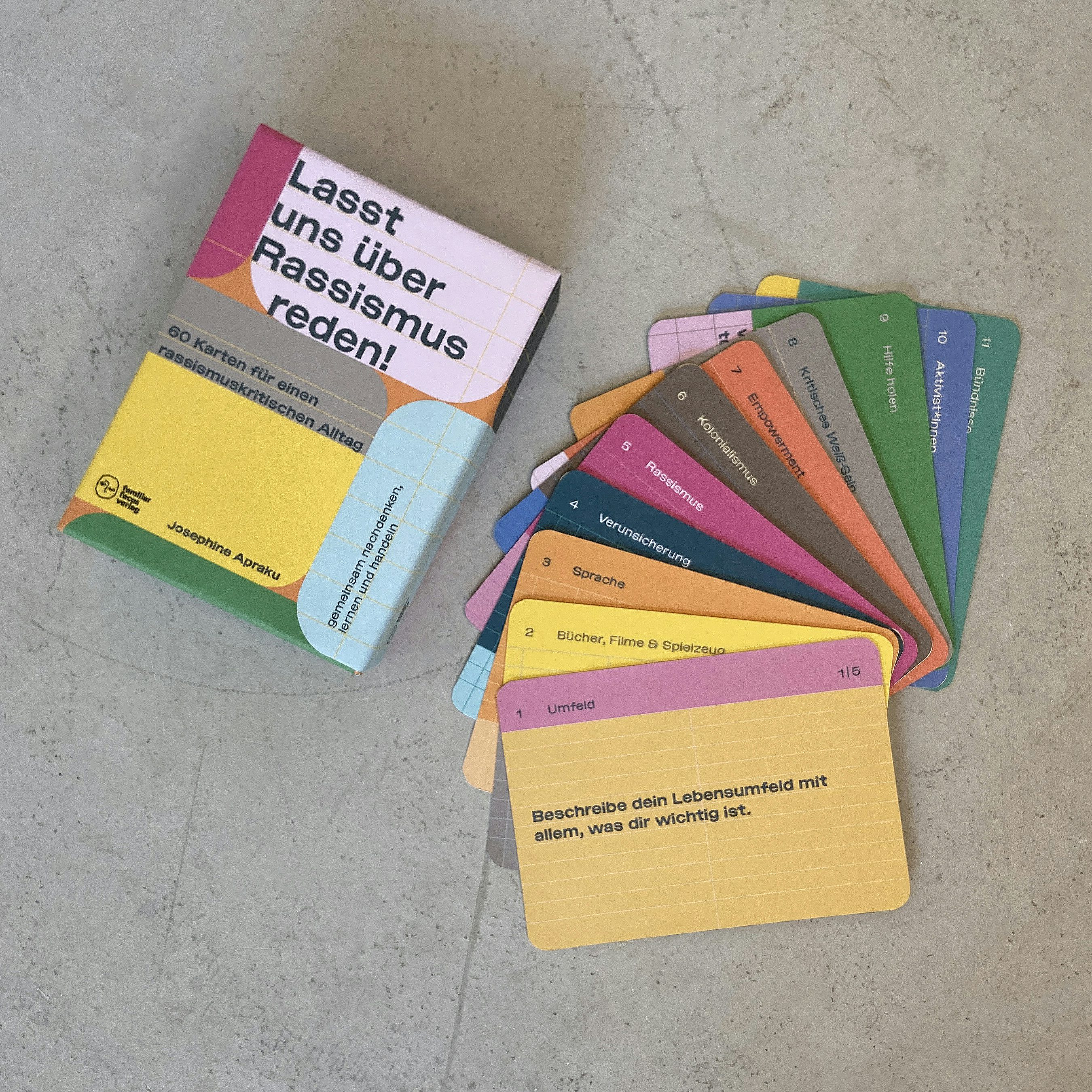 Das Kartenset richtet sich an alle zwischen 10 und 99 Jahren und besteht aus 60 Karten, die Frage zu den Themen Rassismus, Kolonialismus und Empowerment aufzeigen. Es gibt Aufgaben, die zum Nachdenken und Kreativwerden anregen sollen, verlegt wird das ganze von Familiar Faces!