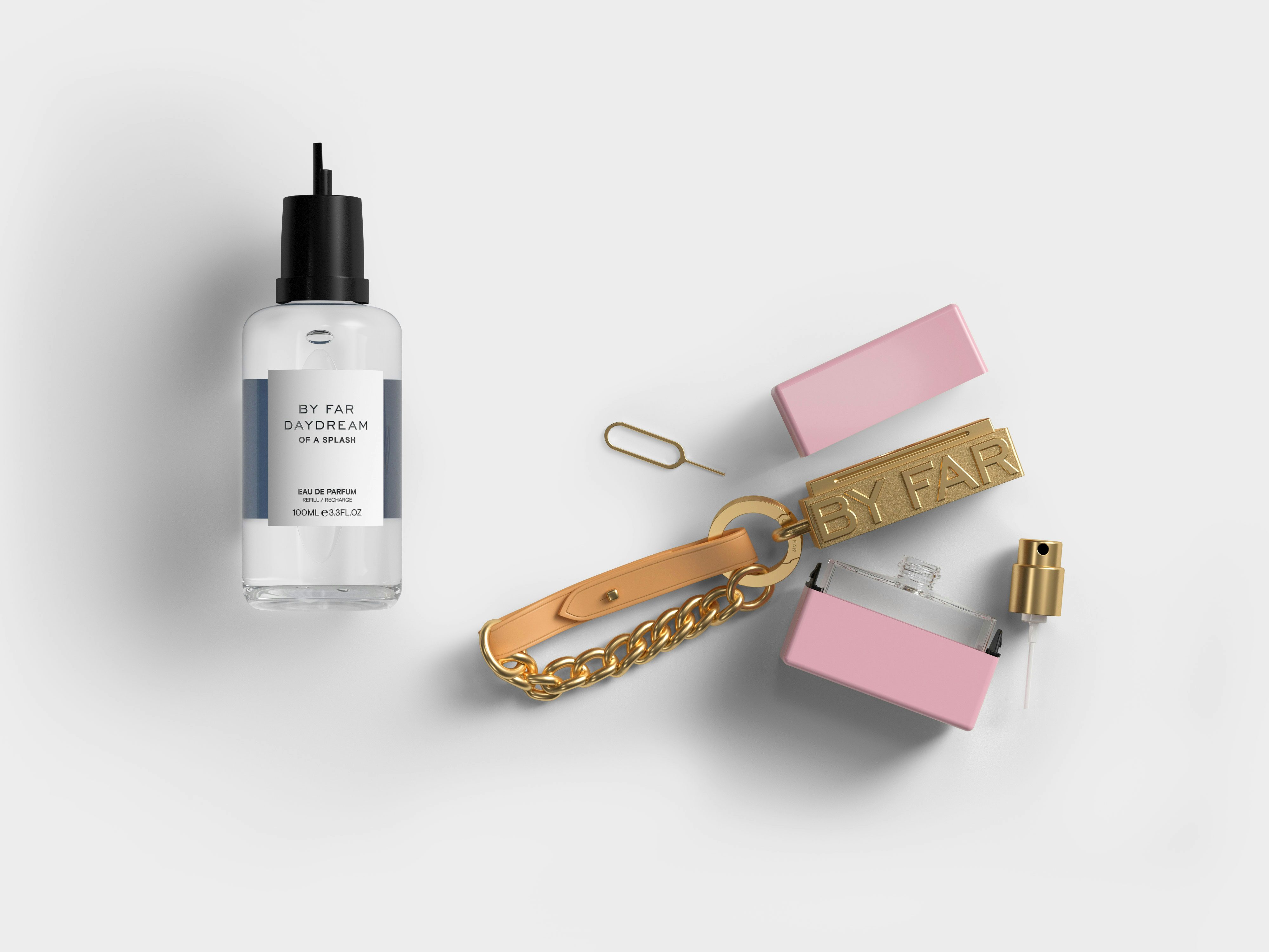 Mit By Far Daydreams kommt jetzt der nächste Erfolgsschlager des Brands auf den Markt: eine siebenteilige, miteinander kombinierbare Serie aus Parfums. Jeder Duft wird in einem recycelbaren 100-ml-Glasflakon geliefert, der, wenn er umgedreht und geschwenkt wird, eine 20-ml-Reiseflasche auffüllt, die gleichzeitig als tragbarer Anhänger dient, der in sechs bunten Farben, mit goldenen oder silbernen Details und einem Karabinerhaken oder einem Lederband erhältlich ist, das an der Tasche, der Jeans oder überall sonst befestigt werden kann.