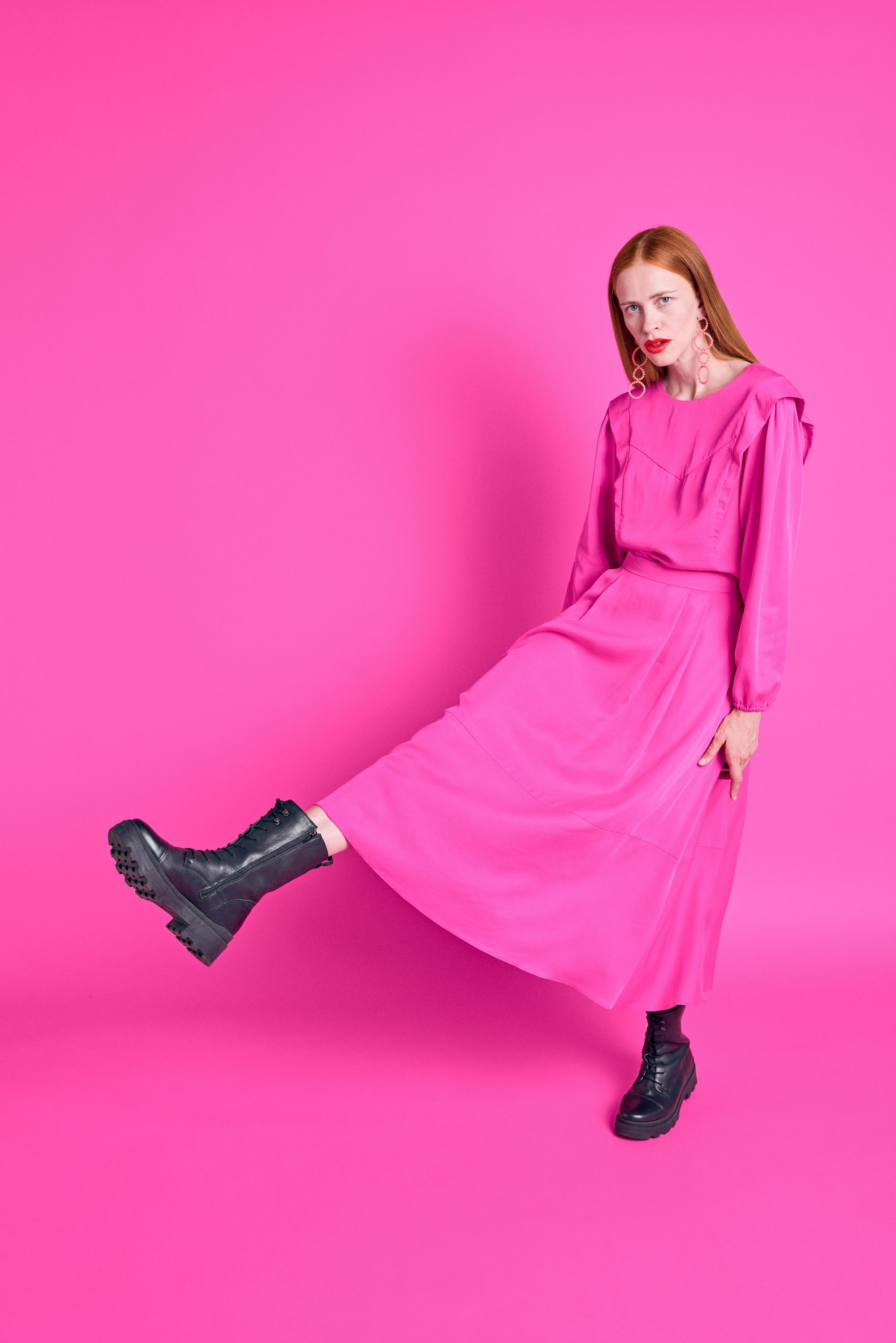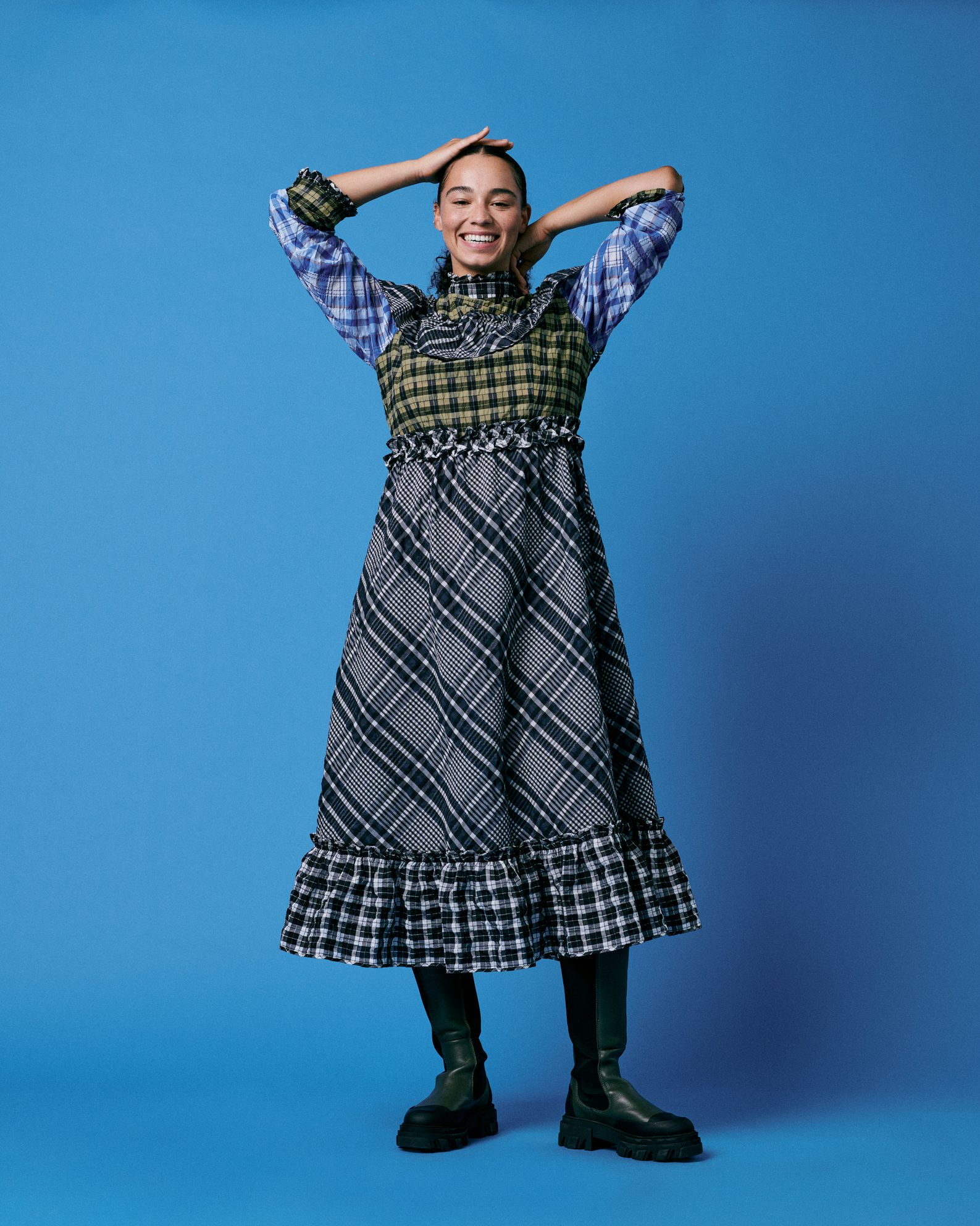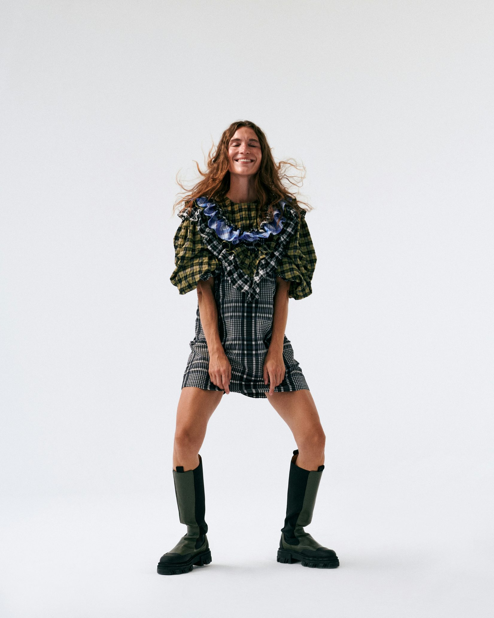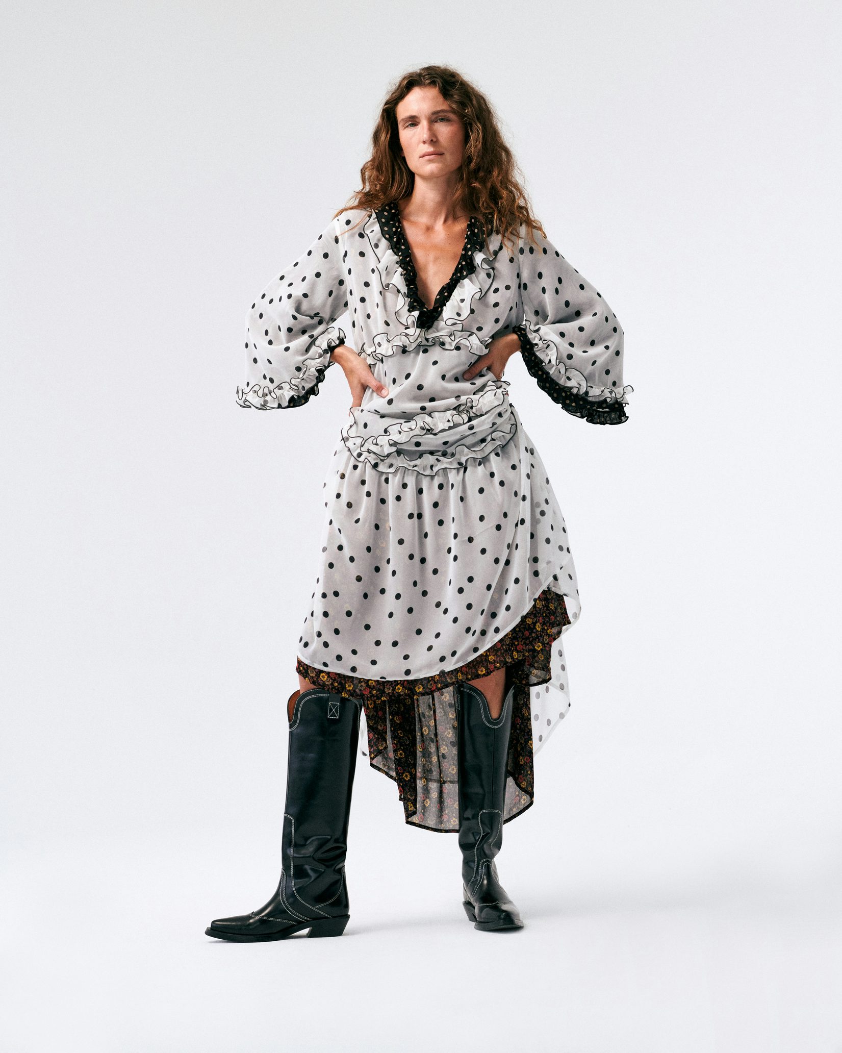 „Mit den Drucken und Stoffen der vergangenen Saison zu arbeiten ist eine besondere Herausforderung und ich liebe es. Für diese Kollektion habe ich in unseren Archiven gestöbert und charakteristische Silhouetten mit kontrastierenden Prints und unterschiedlichen Stoffen neu interpretiert. Die Kollektion fühlt sich vertraut an, auf eine gute Art und Weise – als ob man einen alten Freund trifft. Es ist Ganni durch und durch.“ – Ditte Reffstrup, die Kreativdirektorin von Ganni.