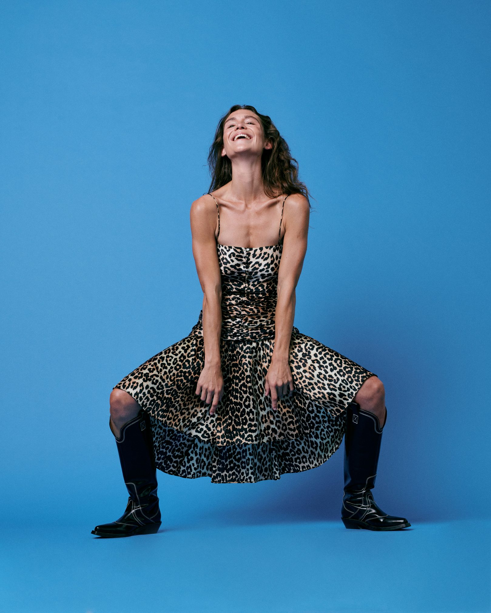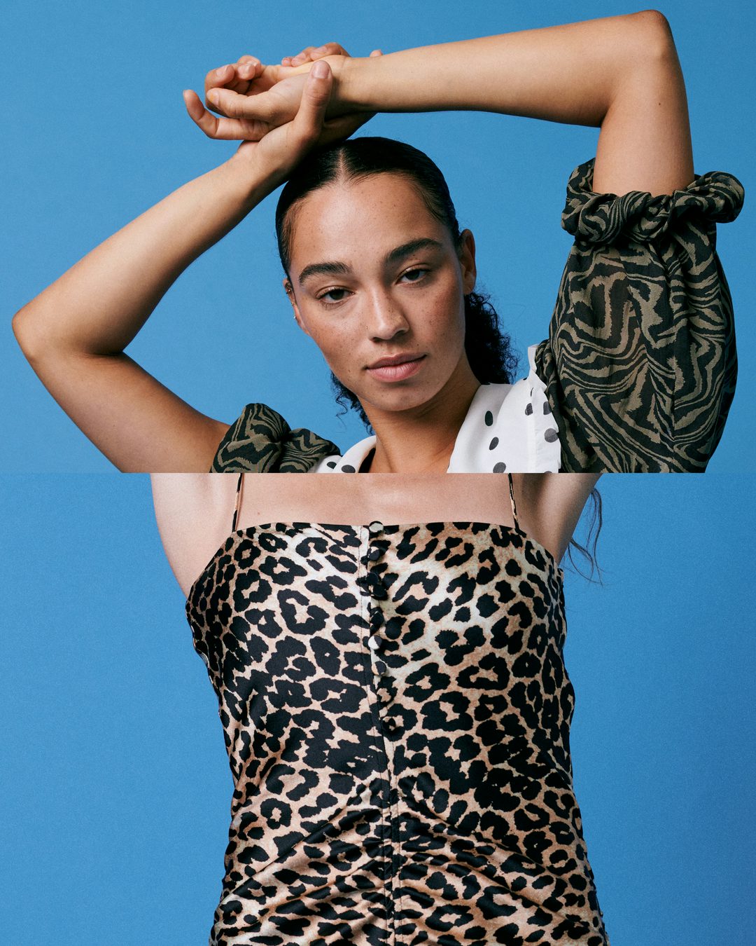 Die Nachricht, dass Ganni aus aufgearbeiteten und wiederverwerteten Stoffen der vergangenen Saisons nun neue Mode macht, nämlich unter dem Motto Re-Cut, hat mich also umso mehr gefreut. Dabei sind zwei Signature Prints, nämlich Leo und Karo, zum Einsatz gekommen und kommen in den schönsten Patchworkdesigns daher.