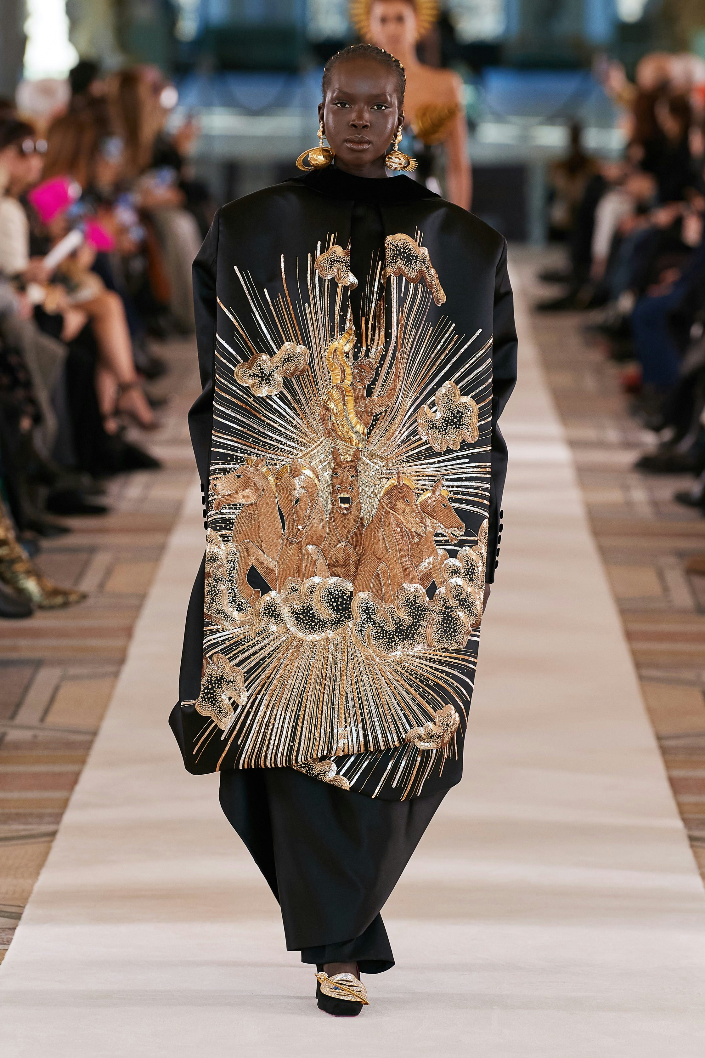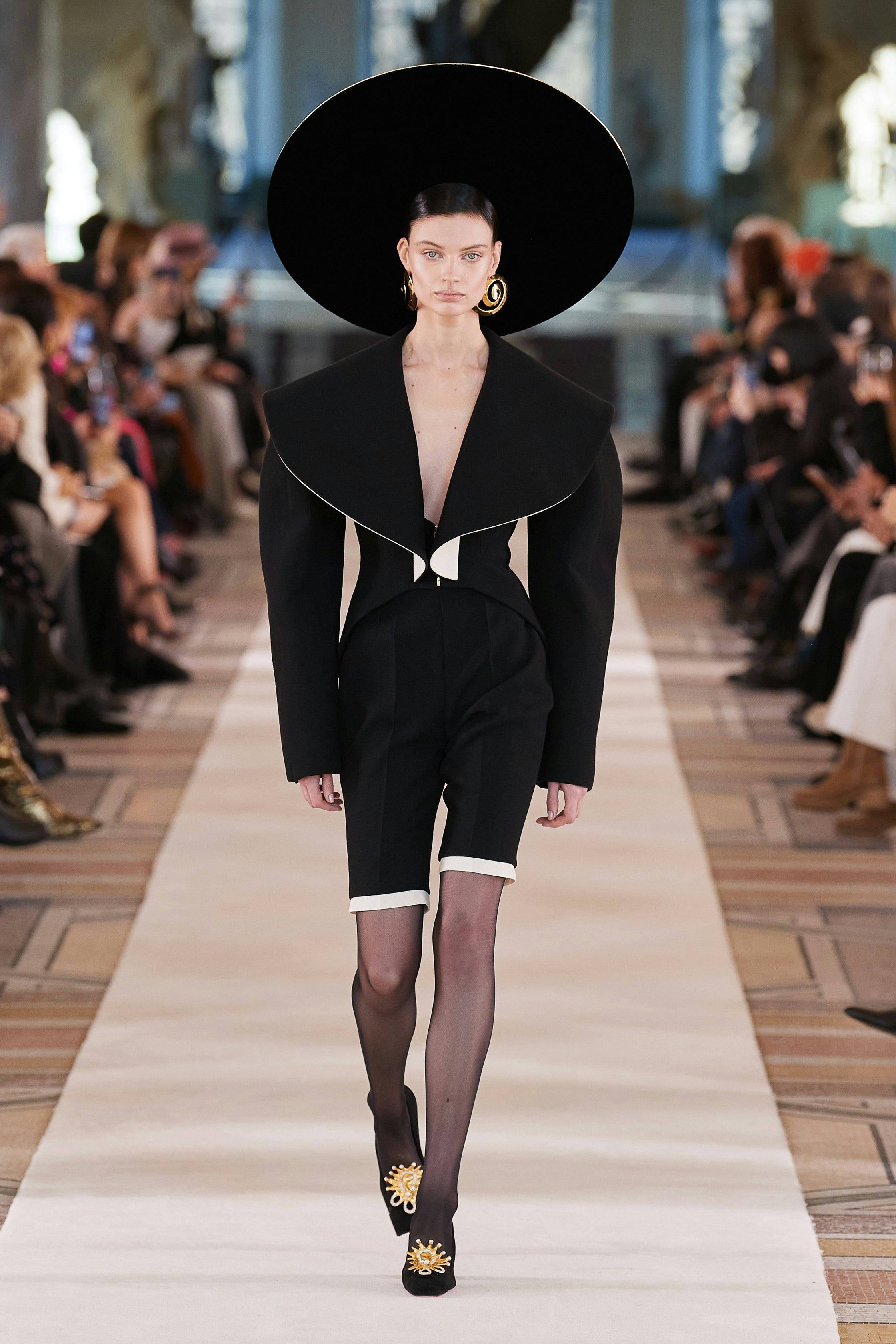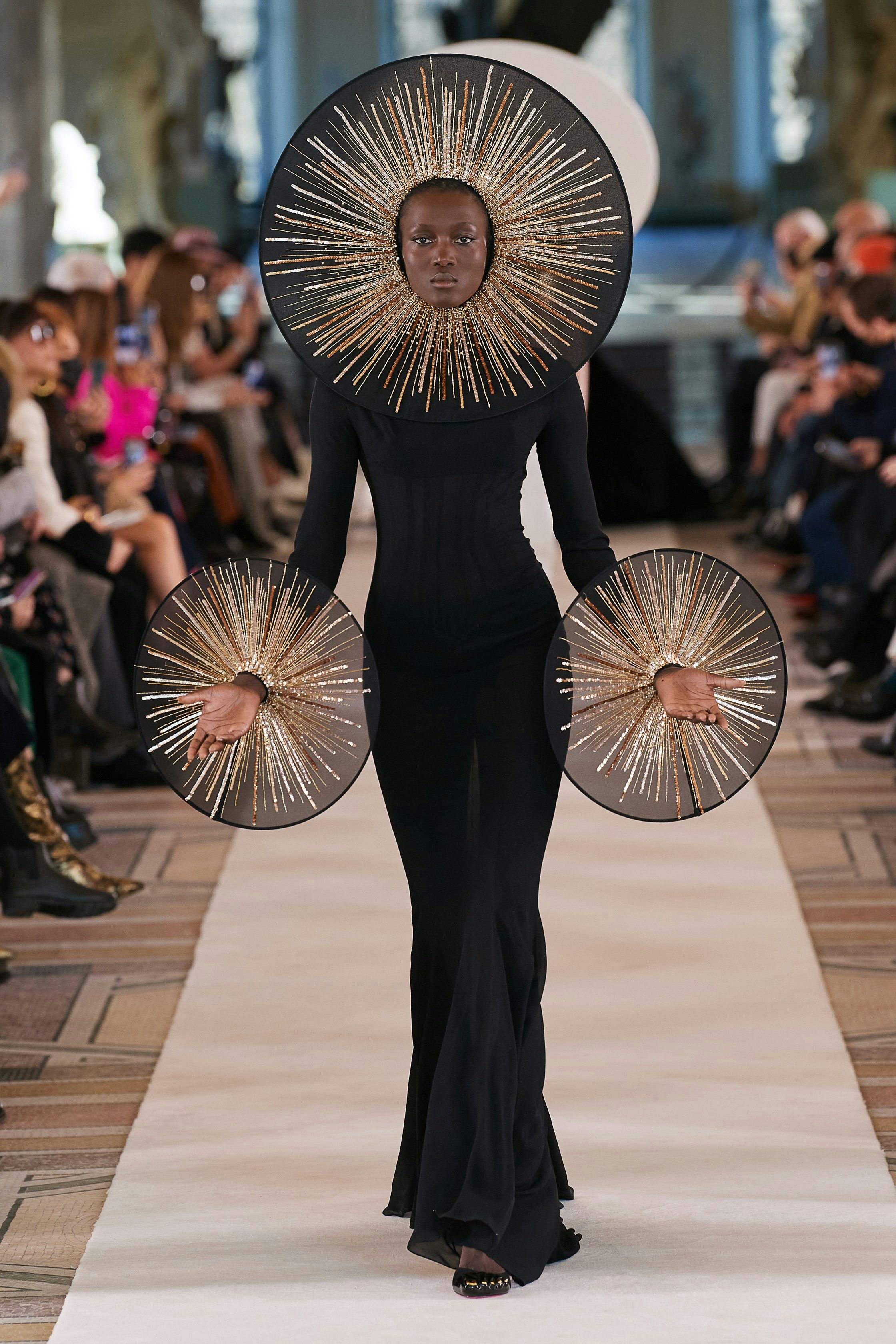 Den Anfang machte Schiaparelli mit Designer Daniel Roseberry. Er flüchtete sich angesichts der Pandemie ins Kino: „Dune“, „Prometheus“, „Interstellar“ waren nur einige der Filme, die er sich ansah, wie er der Vogue erzählte. Eskapismus, dank Corona ist dieses Thema noch mehr omnipräsent, siehe auch das Metaverse. In die ferne Galaxie konnte man auch bei der Couture-Modenschau des Traditionshauses abtauchen, vergoldete Bustiers, Messingringe, Tentakeln – Science-Fiction-Elemente gab es en masse. Doch was bleibt ohne diese zauberhaften Details? Fantastische Schnitte, luxuriöse Materialien, die Farbe Schwarz. Und das Wissen, dass Grandezza nicht immer etwas mit Volumen, Farben und Glitzer zu tun hat, sondern sich besonders in der richtigen Akzentuierung des Körpers findet. Manfred Thierry Mugler hätte das bestimmt gefallen ...