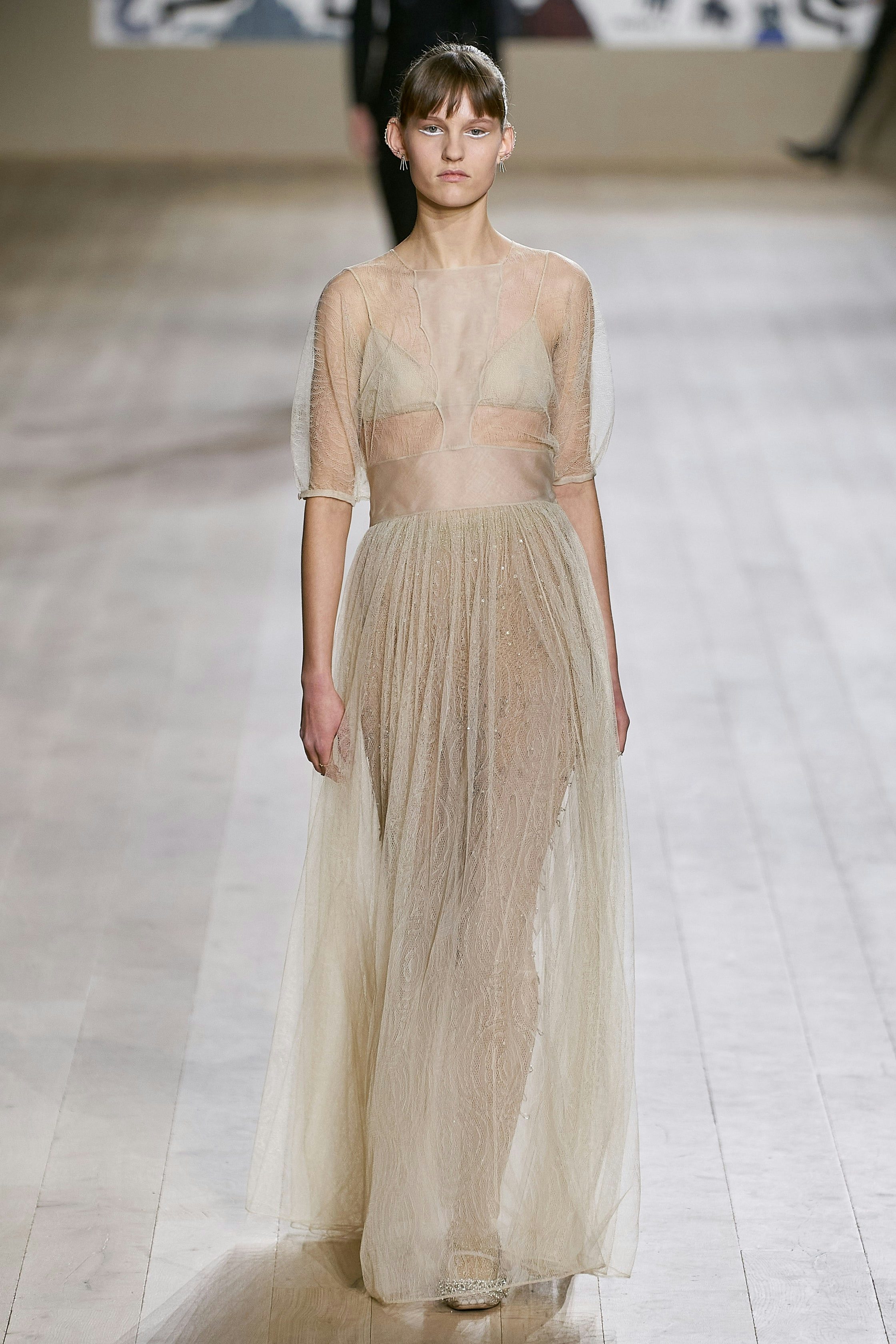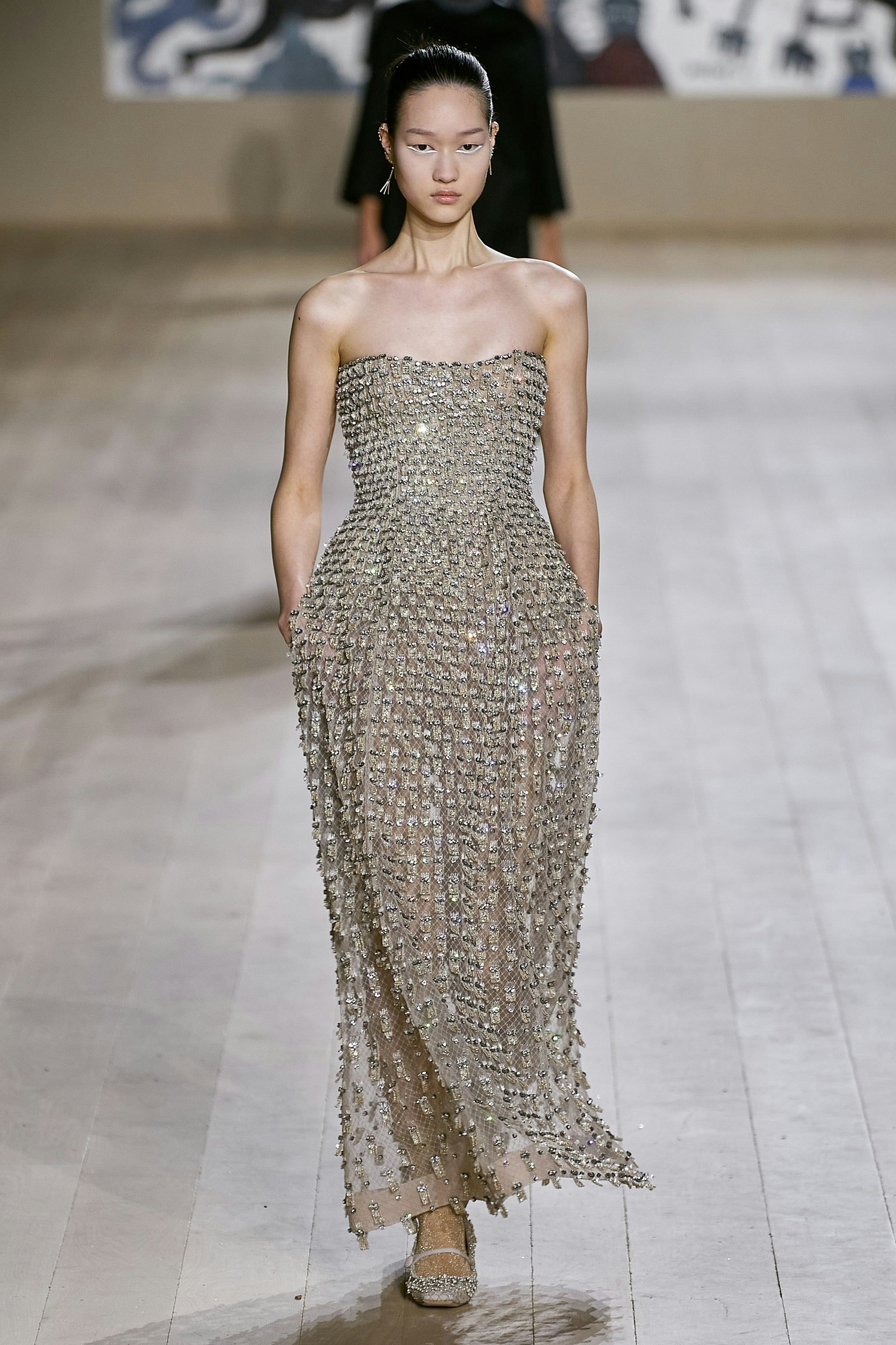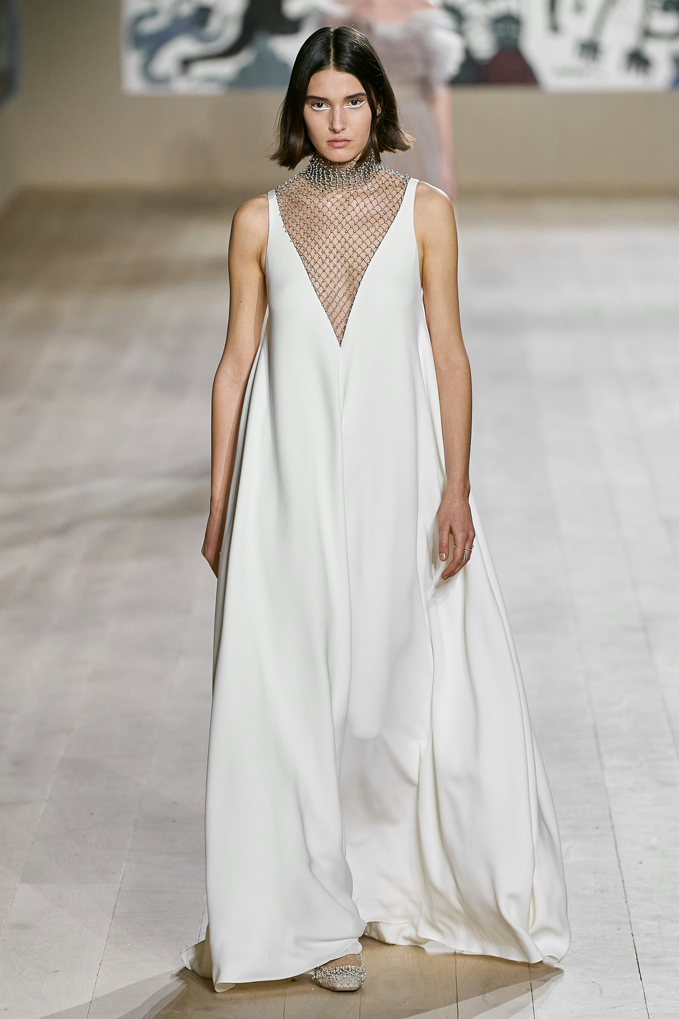 Sie setzte dieses Handwerk nicht nur als Verzierung ein (in der Location hingen ebenfalls bestickte Wandteppiche), sondern auch als konstruierendes Element, ganze Kleidungsstücke wurden durch Stickereien zusammengefügt. Auch bei Chiuri war die Pandemie ein Auslöser für die neue Ruhe, die ihre Mode ausstrahlt. Und diese Bodenhaftung steht der Haute Couture sehr gut.