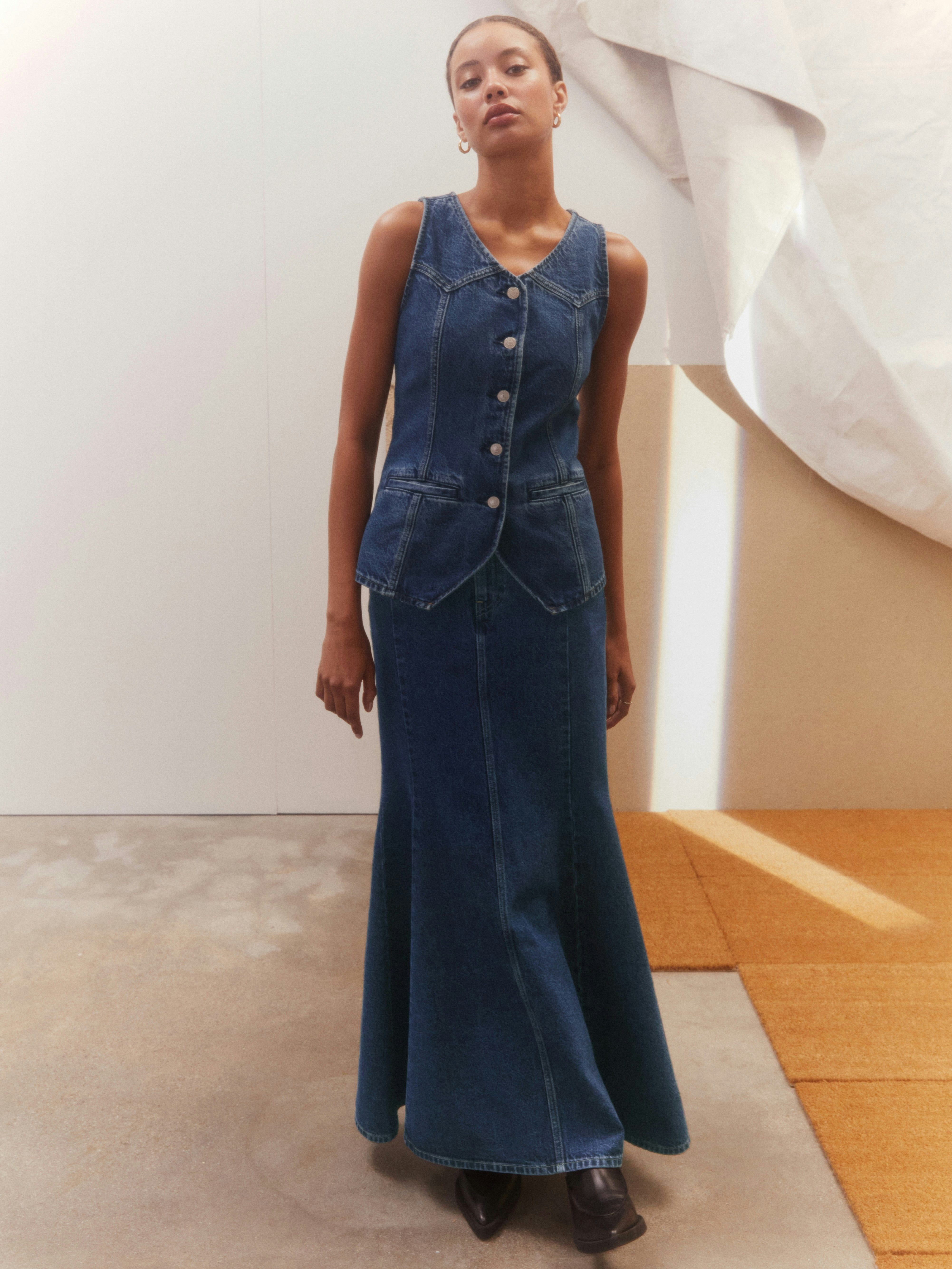 Generell launchen das restliche Jahr über soooo gute Pieces: unter anderem Latzhosen mit passendem Shacket aus braunem Cord, ein Anzug aus Jeansjacke und Rock oder Hose in dunkelblauen Pinstripes, ein Denim-Trenchcoat oder eben auch zahlreiche Westen!