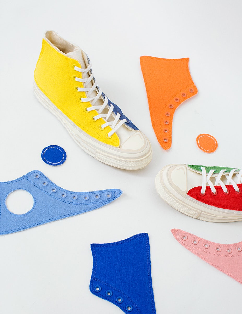 Wer träumt nicht von einem Schuh, der sich auf wundersame Weise einfach zu jedem Outfit kombinieren lässt? Richtig, wir alle! Gewünscht, getan, der in Los Angeles wohnende Künstler Josh Vides macht es für Converse möglich. Denn mit jedem Paar erhält man zwei austauschbare Oberflächen in verschiedenen Farben, die dank Klettverschluss in Nullkommanichts am Schuh ausgetauscht werden können. Passend dazu gibts natürlich auch farbige Converse Patches, ihr könnt also kombinieren, wie ihr lustig seid. Zu bunt? Gibt es nicht!
