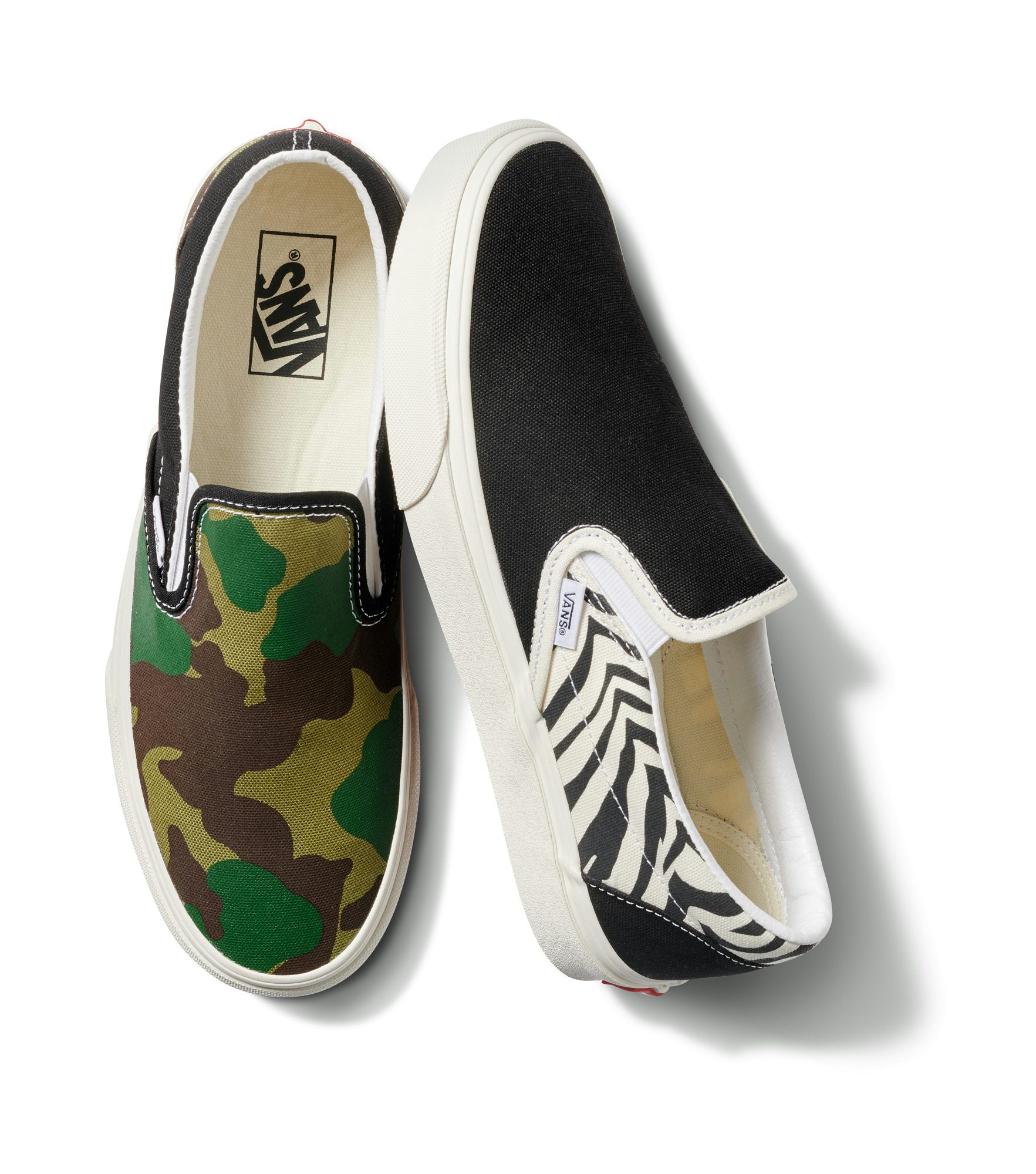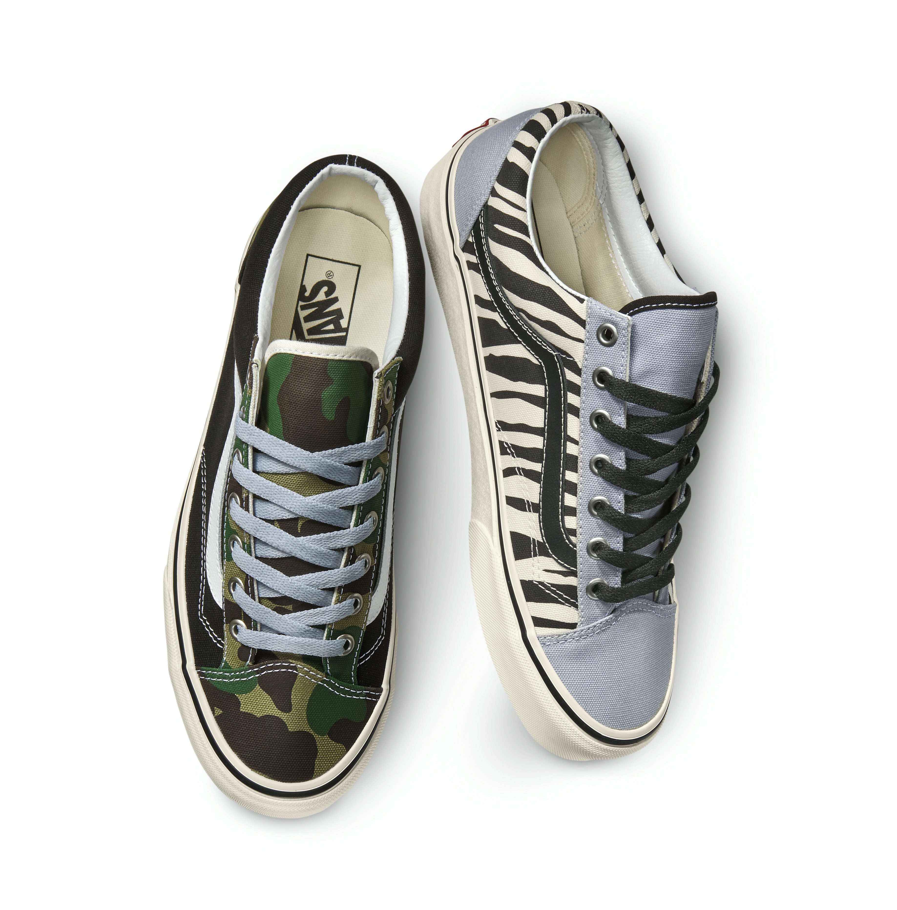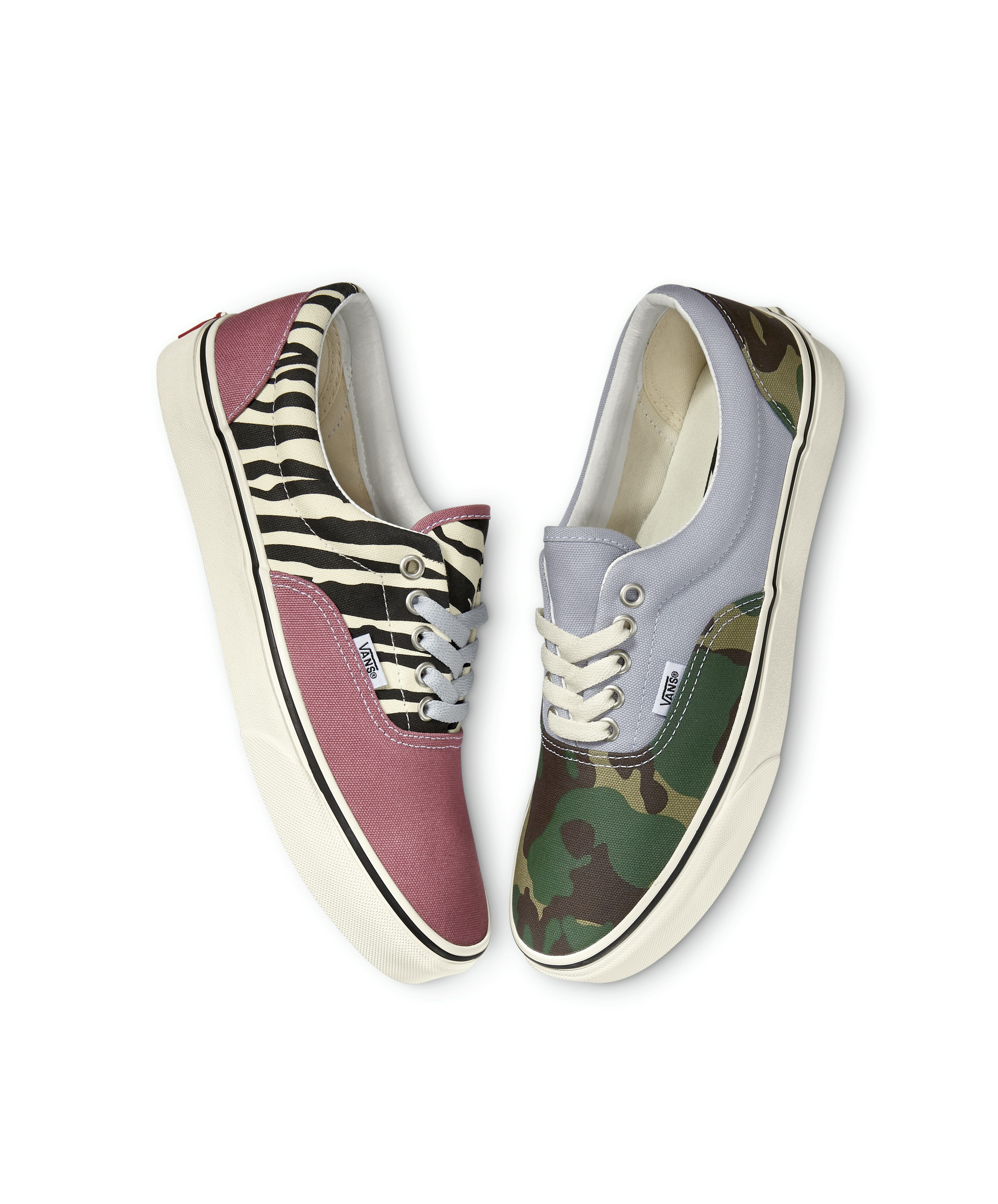 Und cool fühle ich mich auch heute noch, wenn ich mit meinen Vans das Haus verlasse. Da kleben einfach eine Menge Erinnerungen und Image an der ikonischen Waffelsohle, was soll ich machen. Mit dem Mismatch Era erinnert Vans nun an die Ursprünge der familiengeführten Vans Stores, in denen die Skater sich die Kombination ihrer liebsten Vans-Modelle selbst zusammenstellen konnten. Der linke Schuh ist in blauem Canvas und Camouflage-Muster gehalten, der rechte mit rosafarbenem Canvas und stylischem Zebra-Print. Außerdem sind auch die legendären Slip-ons und Style 36 im Mismatch-Design erhältlich.