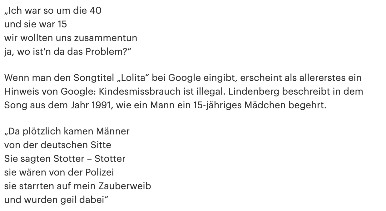 Udo Lindenberg wird gerade gefeiert. Wieso? Weil sein neuer Film „Lindenberg! Mach dein Ding“ in den Kinos anläuft. Doch eigentlich ist das kein Grund, den Musiker zu feiern, sondern noch einmal einen kritischen Blick auf seine Songtexte zu werfen, die teilweise mehr als fragwürdig sind. Denn in dem Song „Lolita“ werden unter anderem sexuelle Fantasien mit einer 15-Jährigen, also Minderjährigen, beschrieben. Eine Straftat. Unethisch. Ekelhaft. Schließlich ist der Sänger zu dieser Zeit selbst 40 Jahre alt. Psycholog*innen halten die Songtexte für bedenklich, regen sie doch zu Straftaten und sexuellem Missbrauch an und normalisieren das gefährliche Verhalten älterer Männer, die junge Frauen begehren. Doch mit solchen Songtexten macht nicht nur Udo Lindenberg gerade von sich reden, nein, auch die Rolling Stones, Iggy Pop und Ringo Starr haben über Sex mit Minderjährigen Lieder geschrieben.
