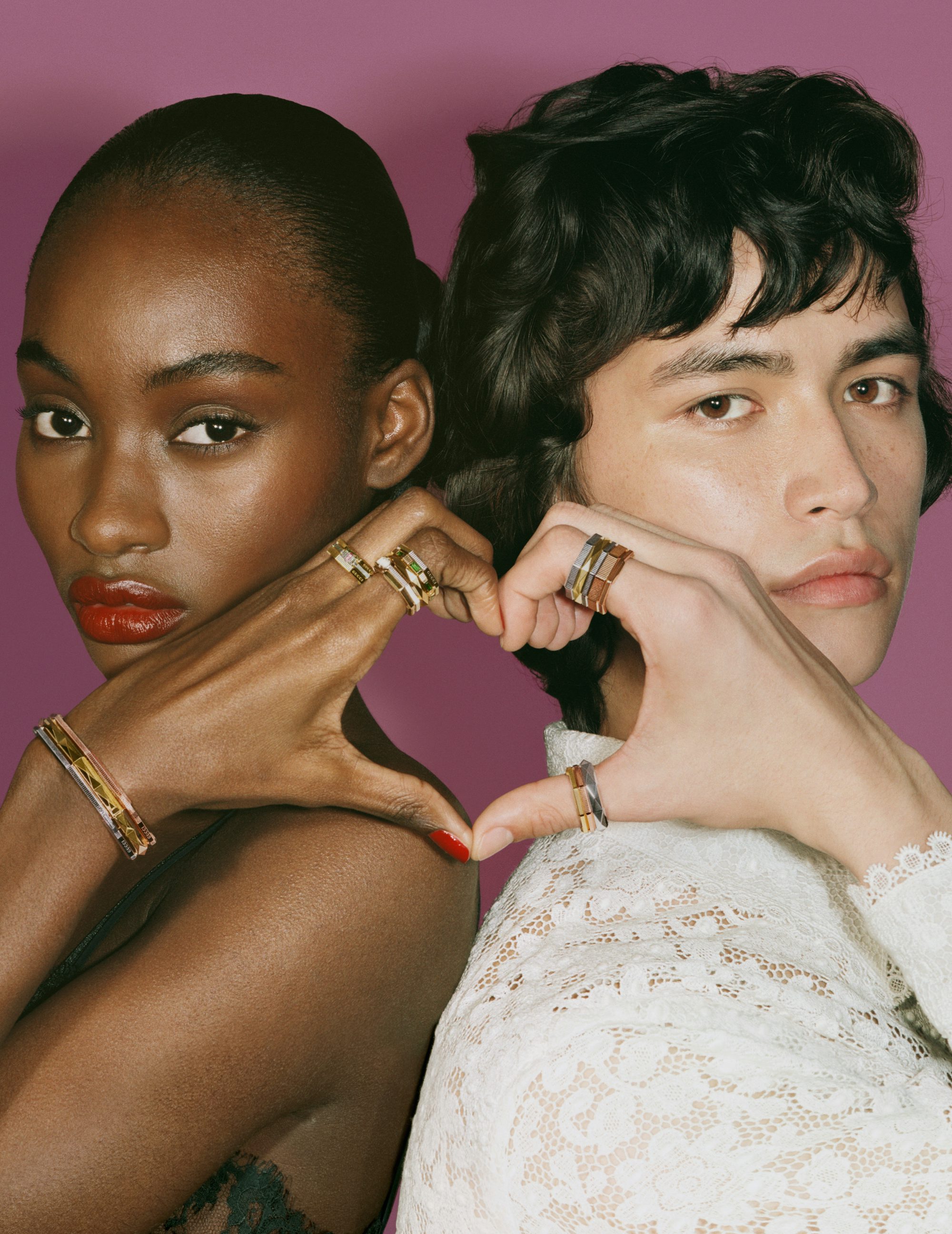 Es gibt sie in allen drei Goldfarben, Weißgold, Gelbgold und Roségold und umfasst Ringe, Armbänder, Halsketten und Ohrringe, mit oder ohne Diamanten oder Edelsteine wie Turmaline oder Rubine.