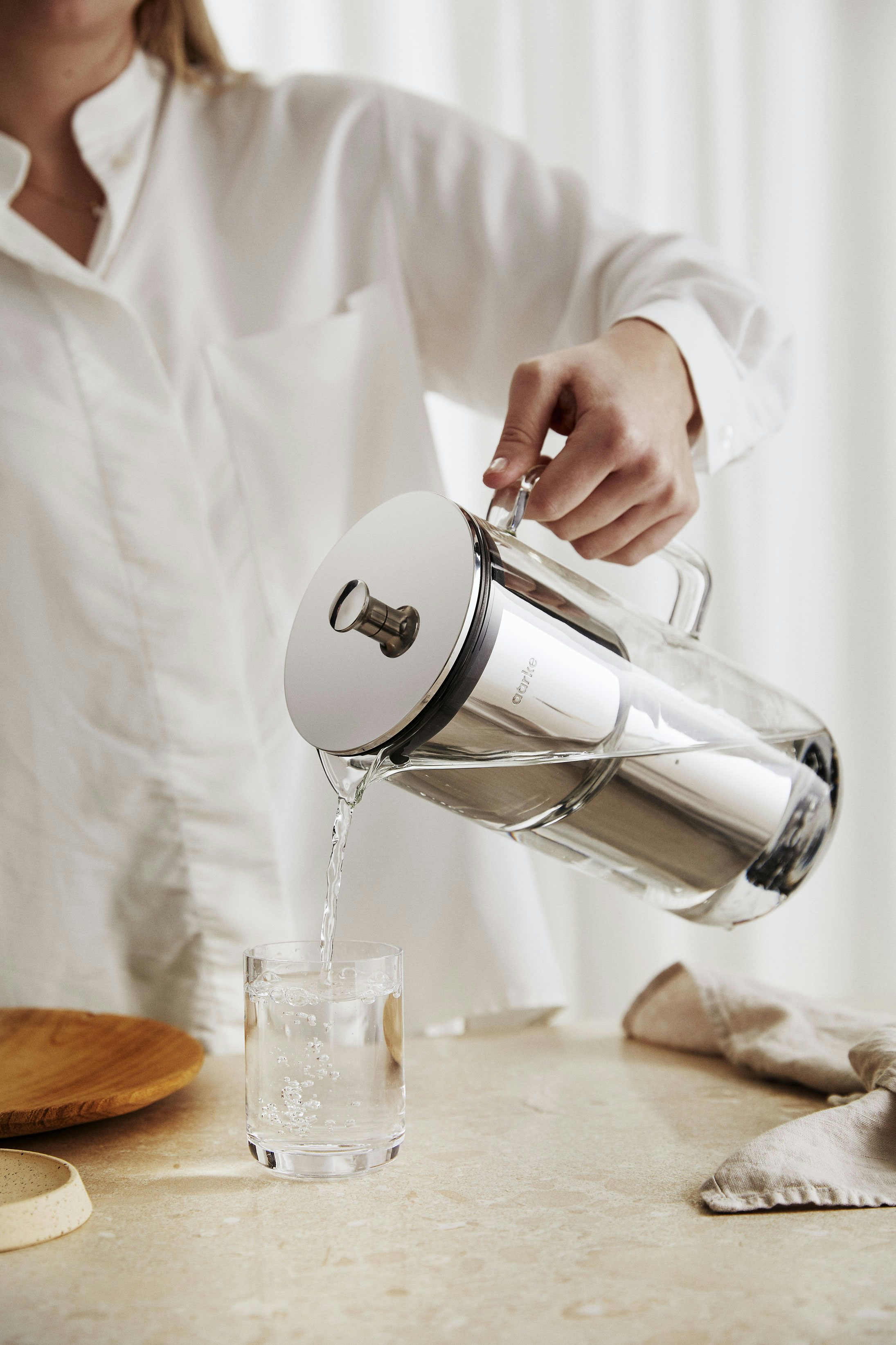 Herkömmliche Trinkwasserfilter vereinen die Filterkartusche und das Filtergranulat in einem Plastikbehälter, den man alle vier Wochen entsorgen muss. Das Modell von Aarke funktioniert anders. Er besteht aus zwei separaten Komponenten: Das ReFilter System™ aus Edelstahl, das man über Jahre hinweg verwenden, in der Spülmaschine reinigen und auskochen kann – und das Filtergranulat in individuellen Nachfüllbeuteln.