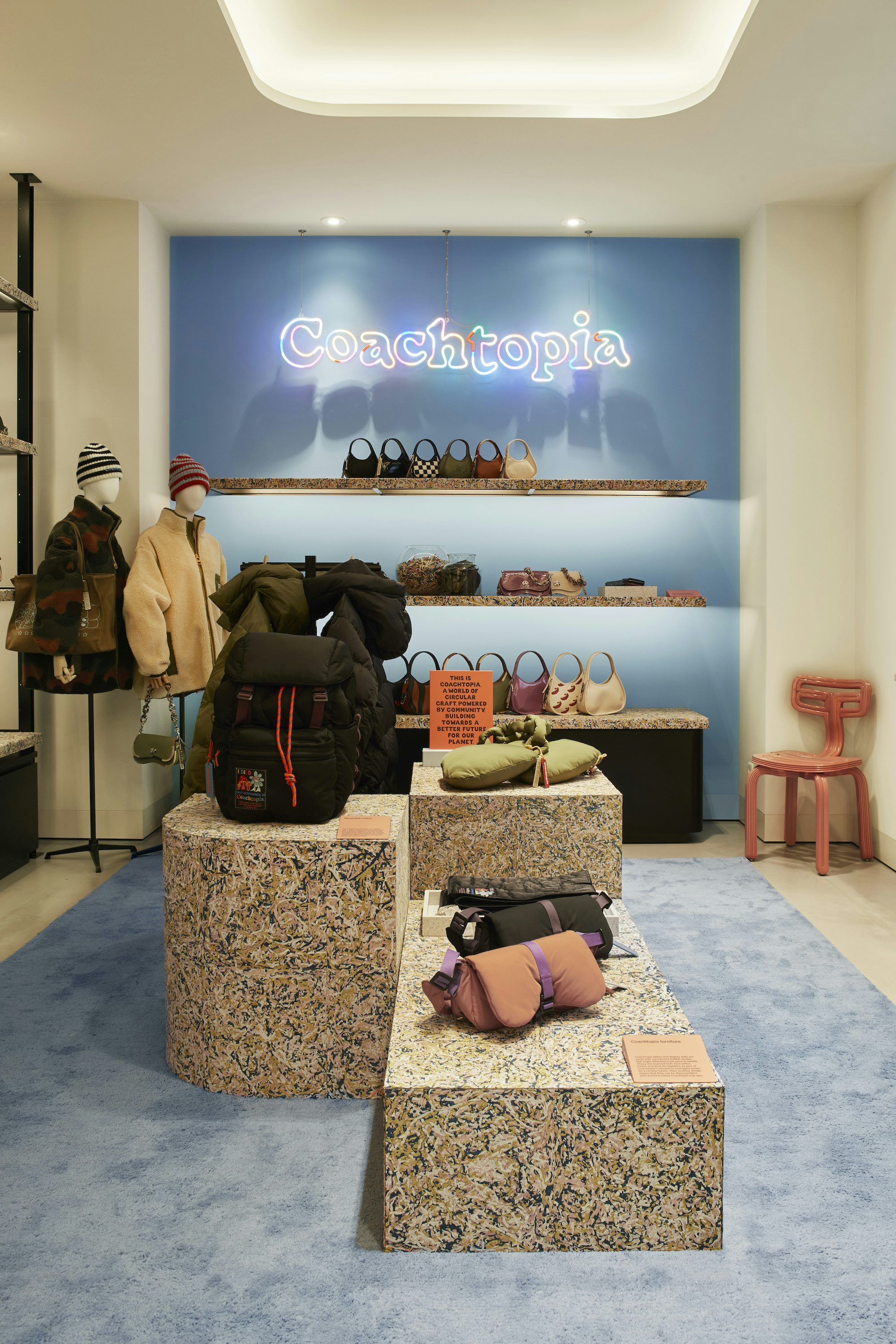 Dort findet ihr sowohl die klassischen Coach-Designs als auch die junge Untermarke Coachtopia. Das darin enhaltene Nachhaltigkeitskonzept der Marke sieht man übrigens auch am Store Design: Möbel wurden aus Upcrushed Leder hergestellt (Zusammenpresse von Lederfragmenten von Coach), Industrieabfälle formen weitere Designelemente.