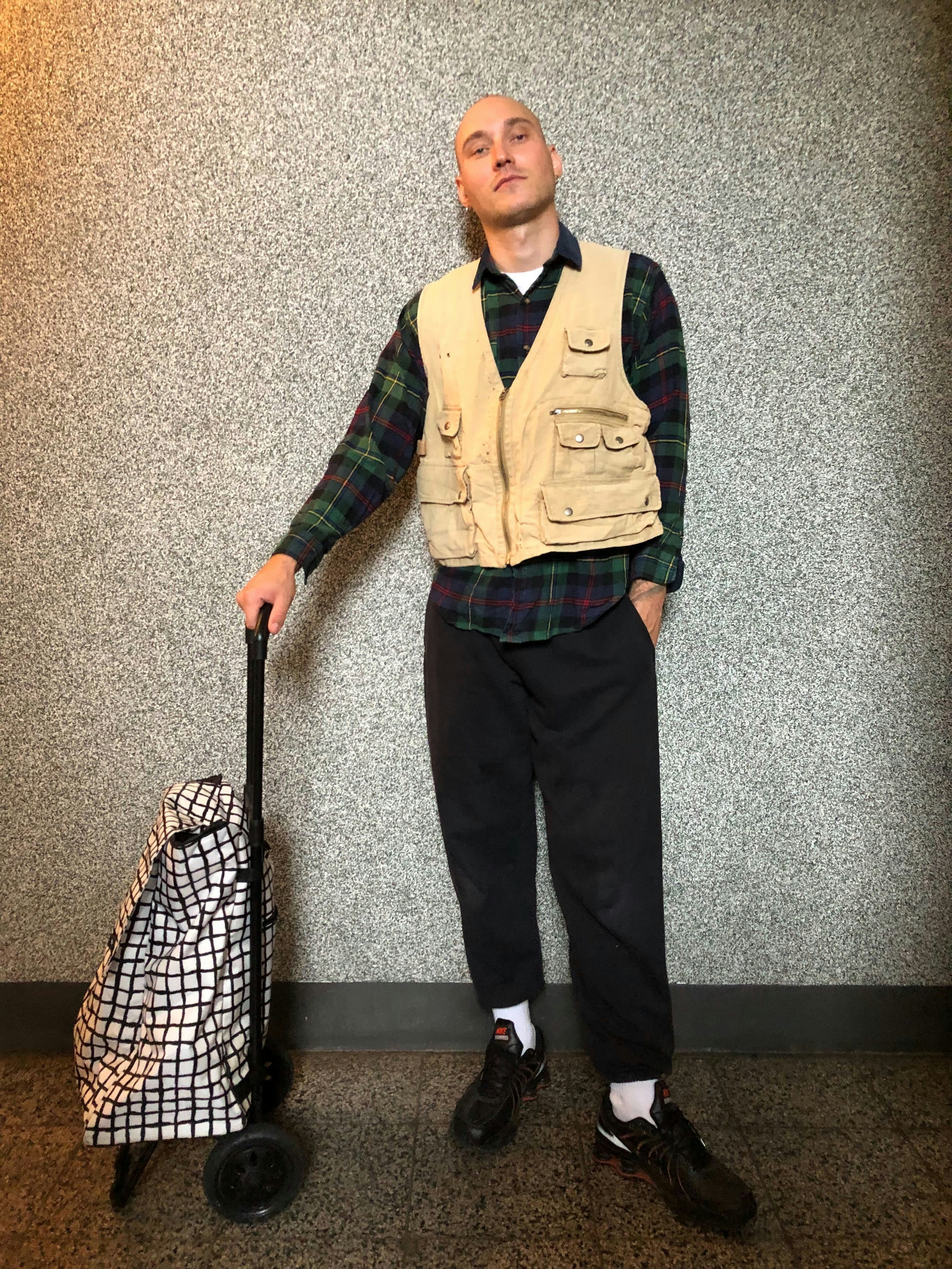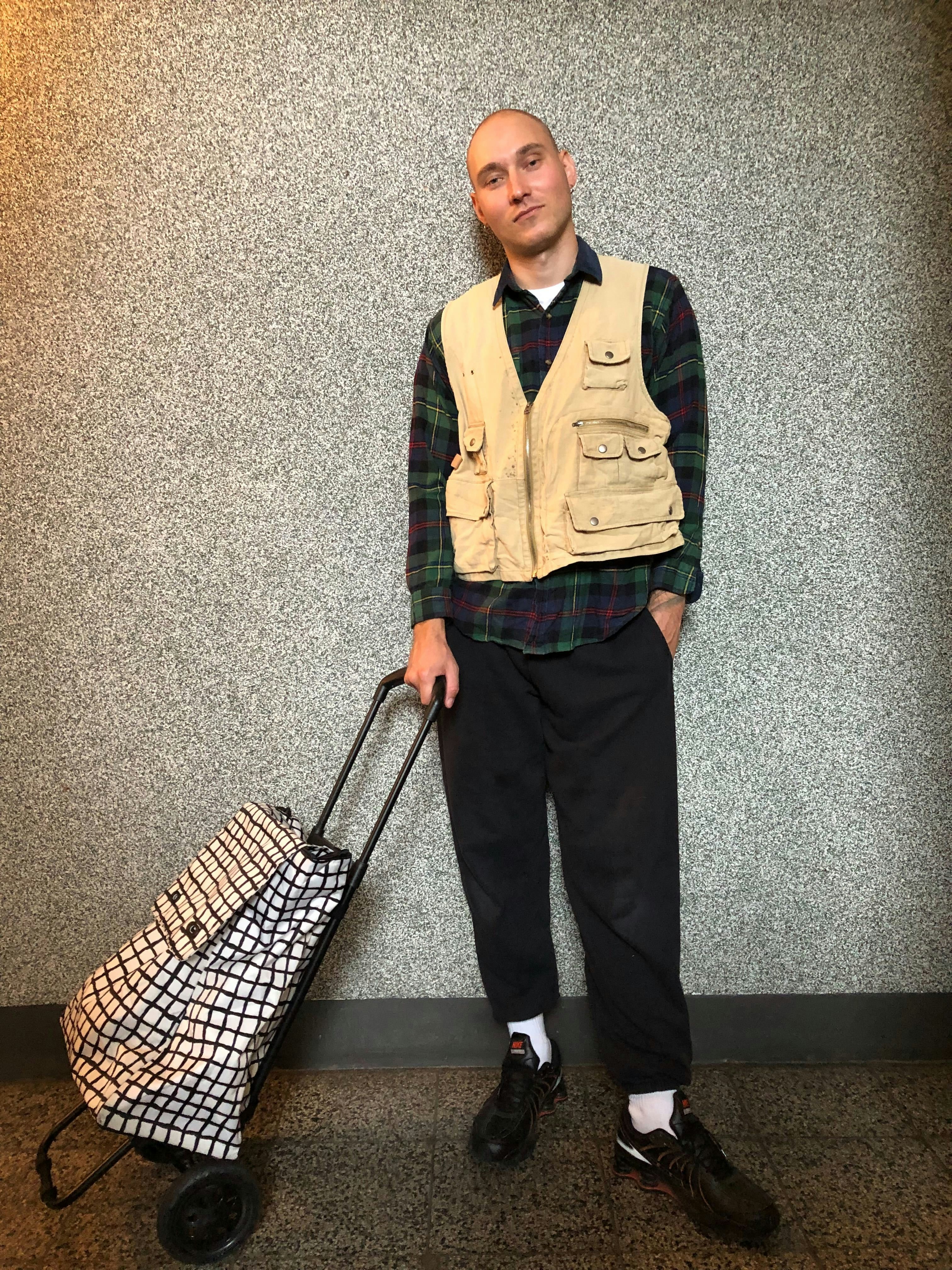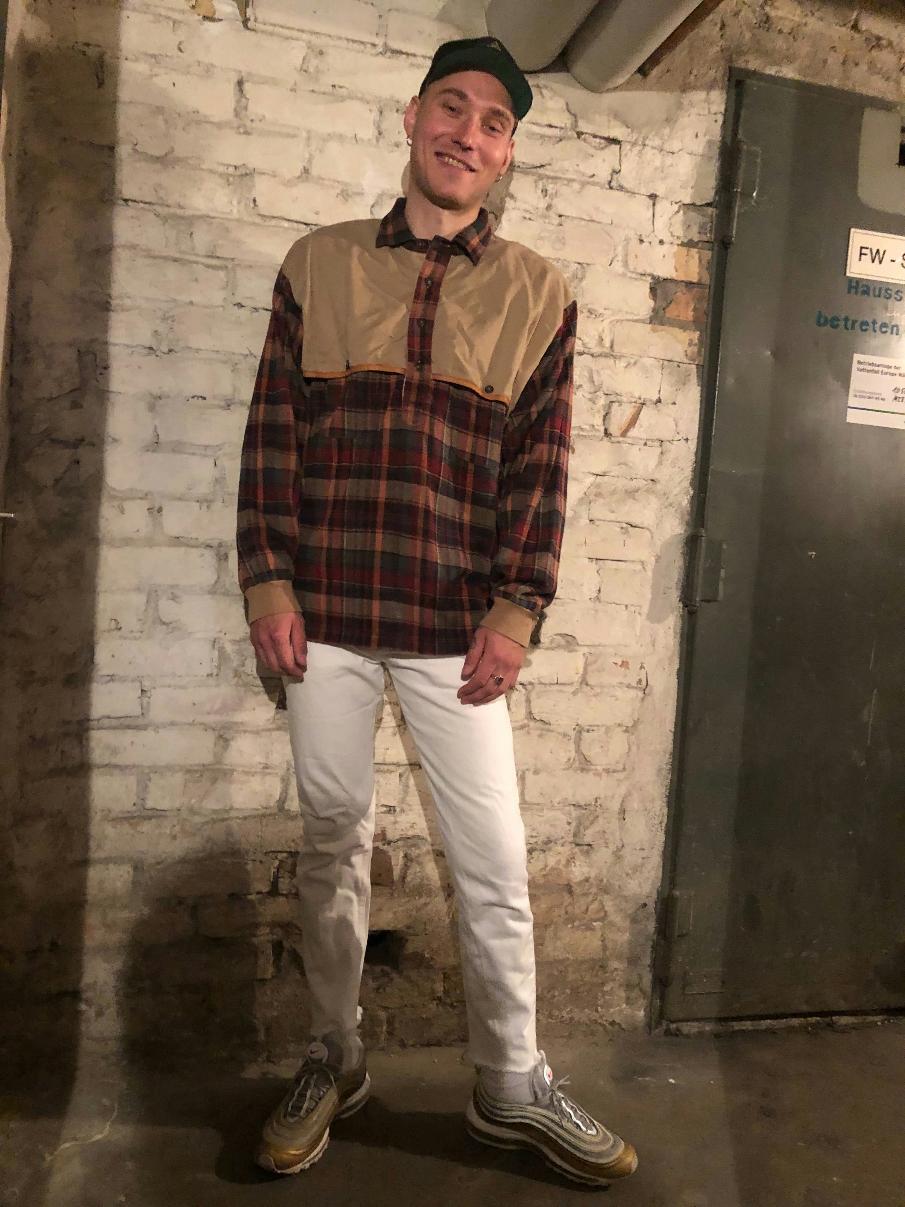Credits: Hemd: Polo Ralph Lauren (ähnlich hier), Weste: Polo Ralph Lauren (ähnlich hier), Jogginghose: Fruit of the Loom, Schuhe: Nike (ähnlich hier)