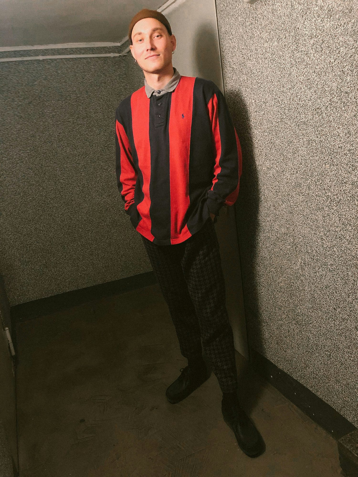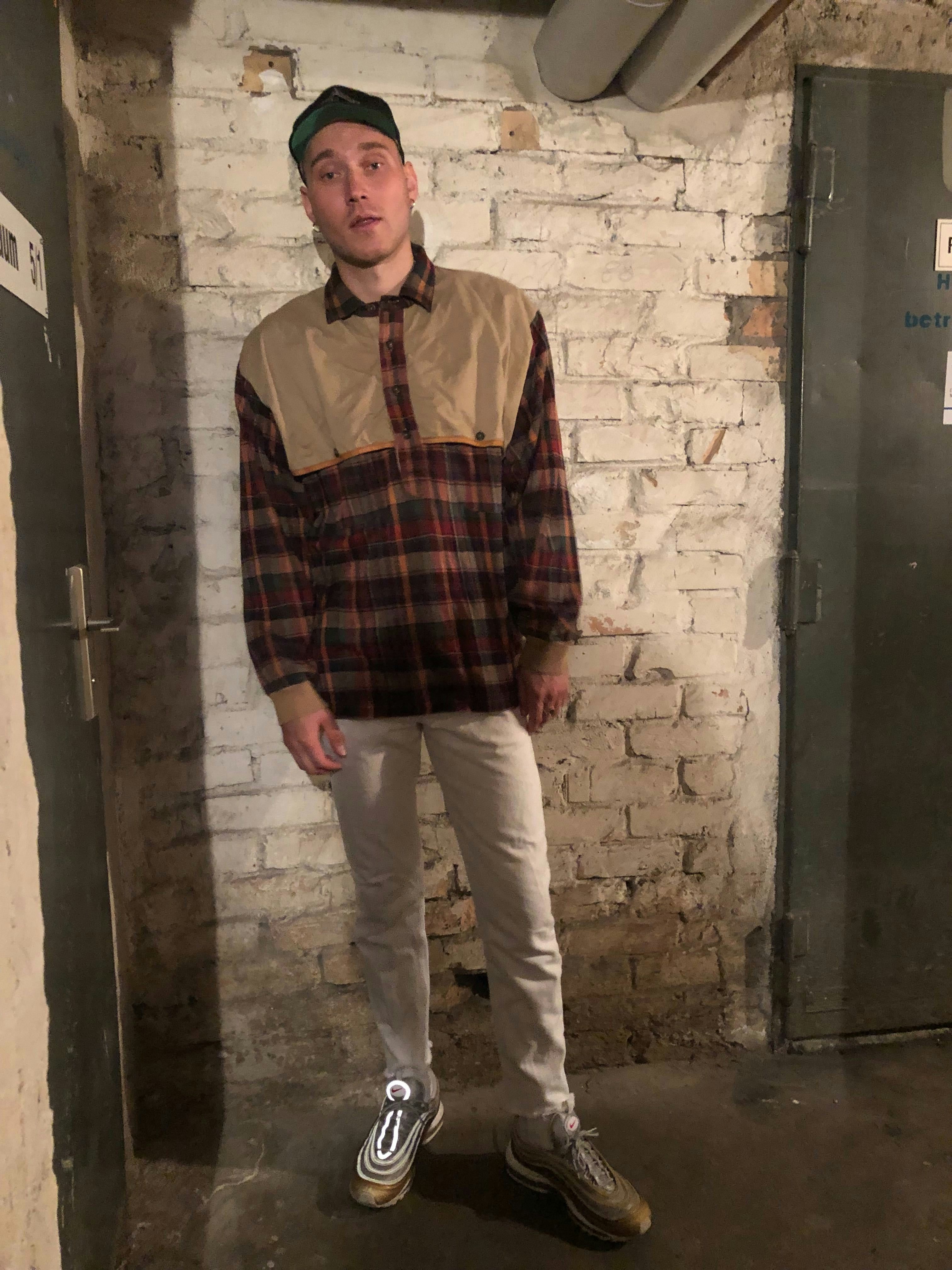 Niels sagt: Ich habe einen ausgebildeten Ralph-Lauren-Fetisch. Die Kombi mit dem Hahnentrittmuster der Hose hat etwas von Proleten-Schick. Abgerundet von Clarks Wallabee in komplett schwarz.