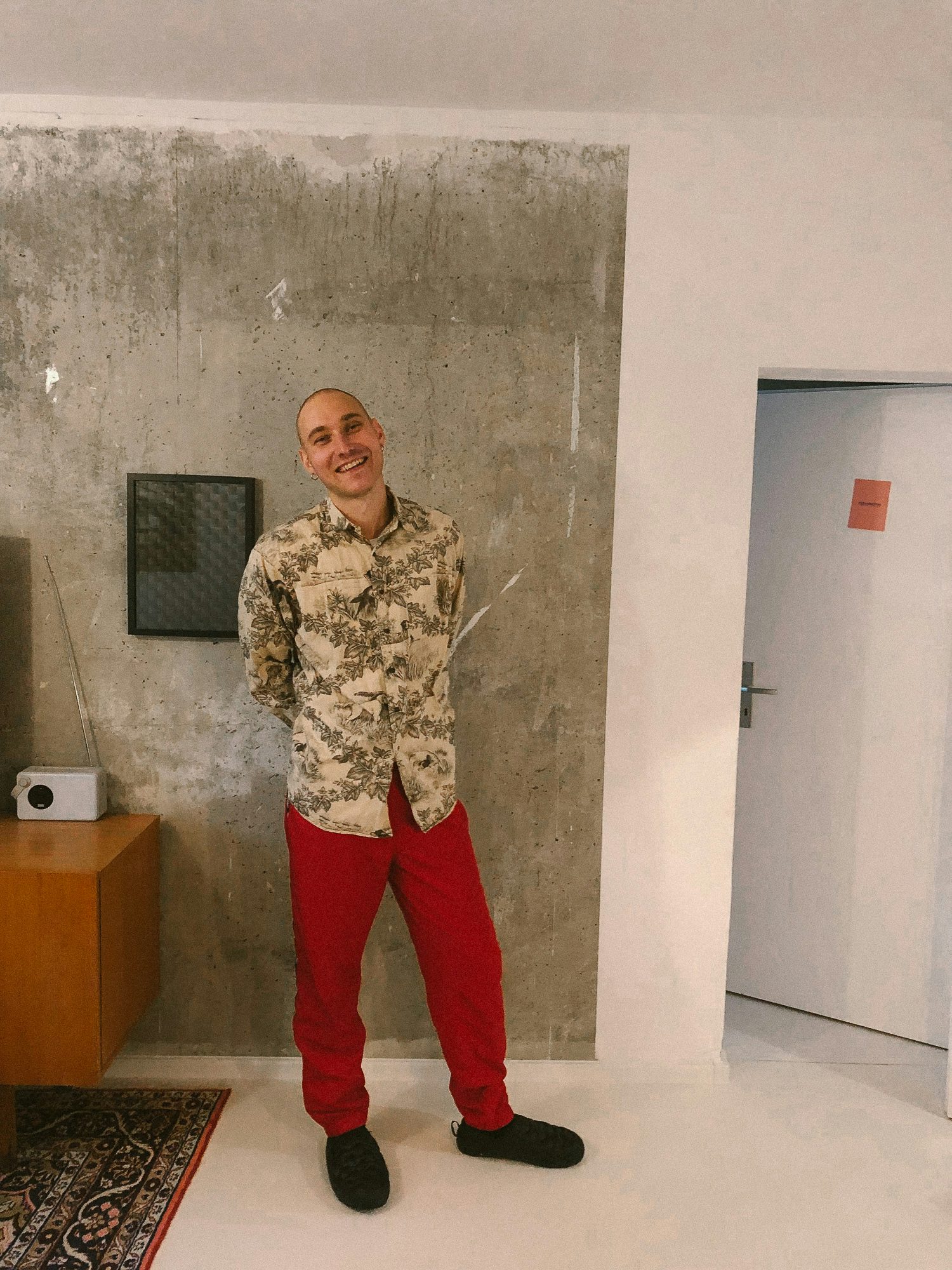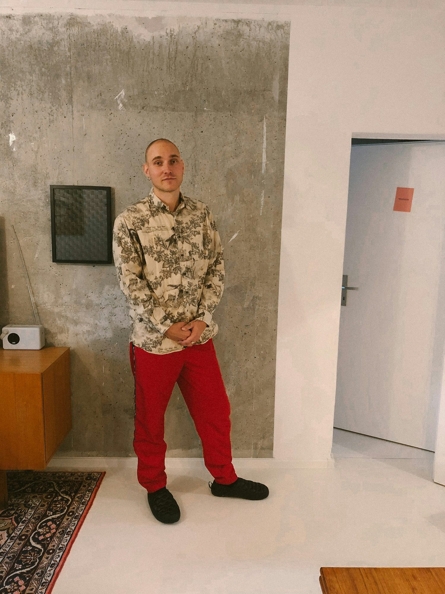 Niels' Freundin sagt: Jagdhunde auf einem Hemd? Die Hose sieht aus wie von einem Pariser Vorstadtkriminellen. Und die Schuhe? Sind die vom Mars?
