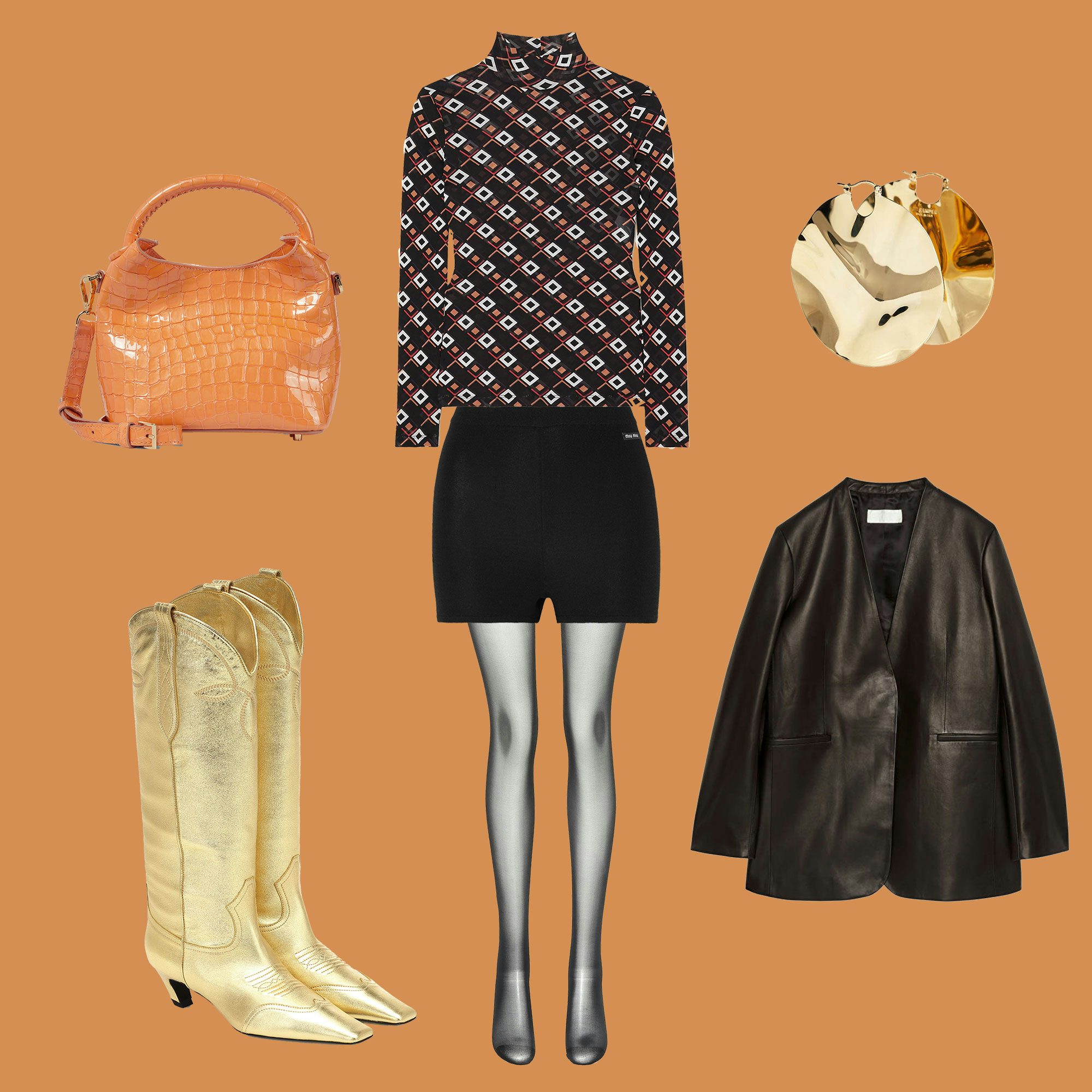 Pullover - Diane von Furstenberg // Shorts - Miu Miu // Strumpfhose - Wolford // Jacke - Arket // Ohrringe - Jil Sander // Boots - Khaite // Tasche - Elleme
