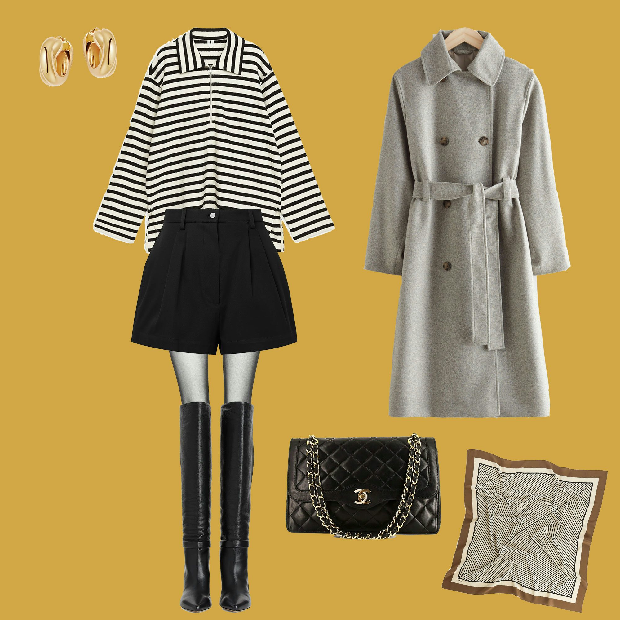 Pullover - Arket // Shorts - Alaia // Trenchcoat - & Other Stories // Boots - Arket // Tasche - Chanel // Tuch - Arket // Ohrringe - Missoma // Strumpfhose - Wolford