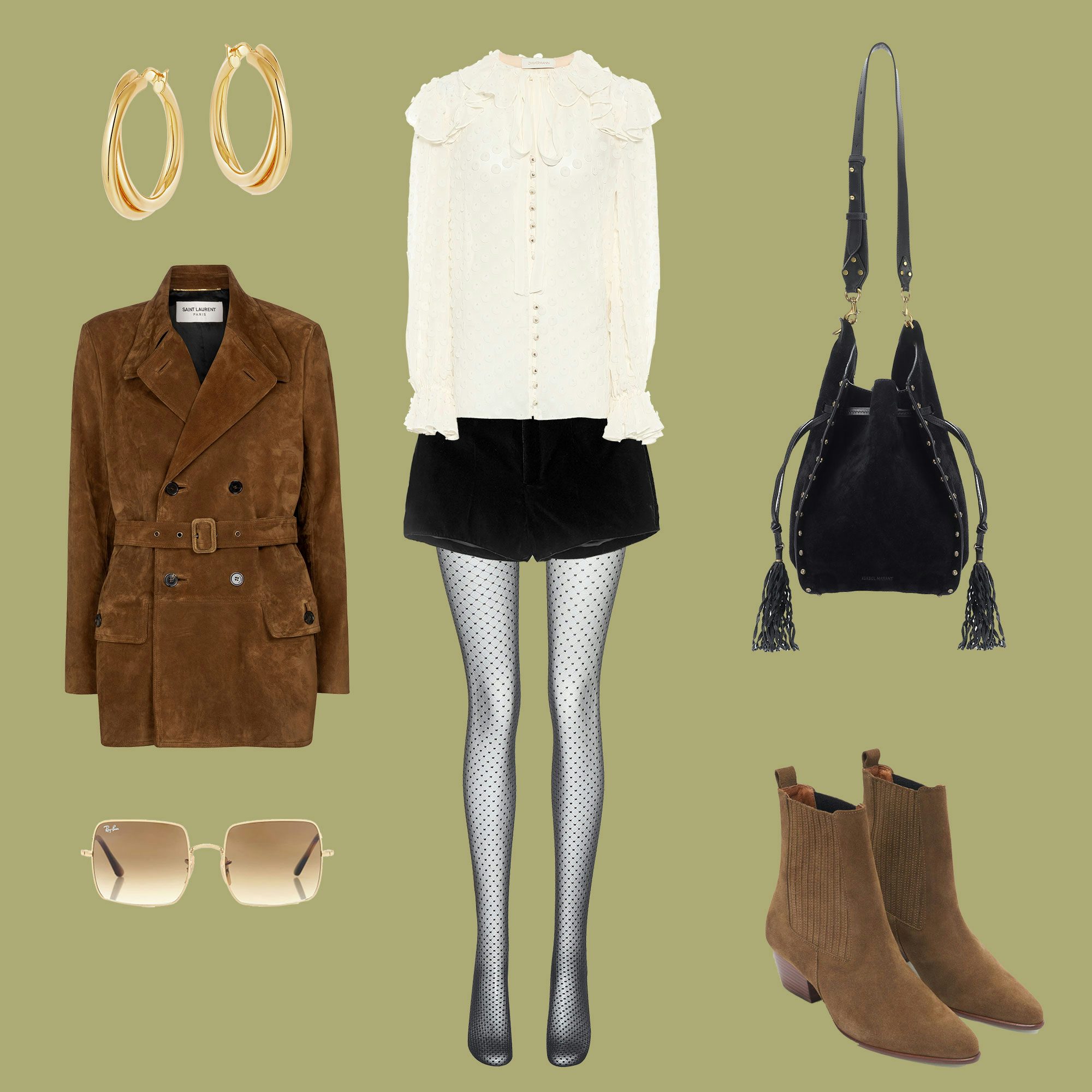 Jacke - Saint Laurent // Bluse - Zimmermann // Shorts - Saint Laurent // Strumpfhose - Wolford // Tasche - Isabel Marant // Ohrringe - Lucy Williams x Missoma // Sonnenbrille - Ray Ban // Schuhe - Sandro Paris