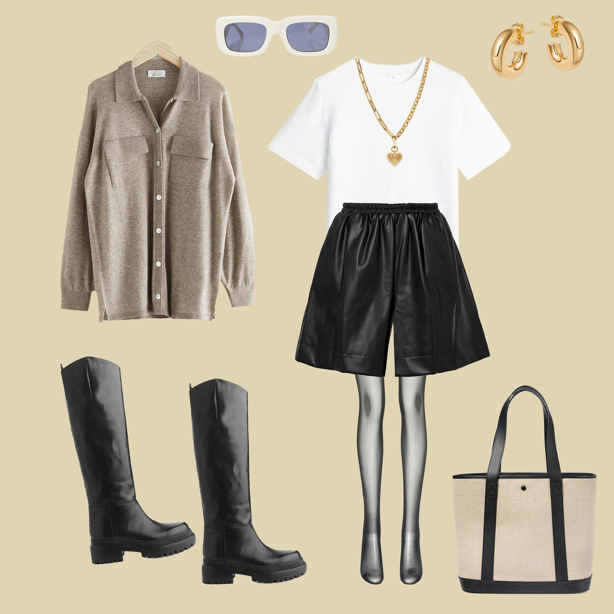 Shacket - & Other Stories // T-Shirt - Arket // Shorts - Staud // Boots - Arket // Creolen - Missoma // Strumpfhose - Wolford // Tasche - A.P.C. // Sonnenbrille - The Attico x Linda Farrow // Kette - Missoma