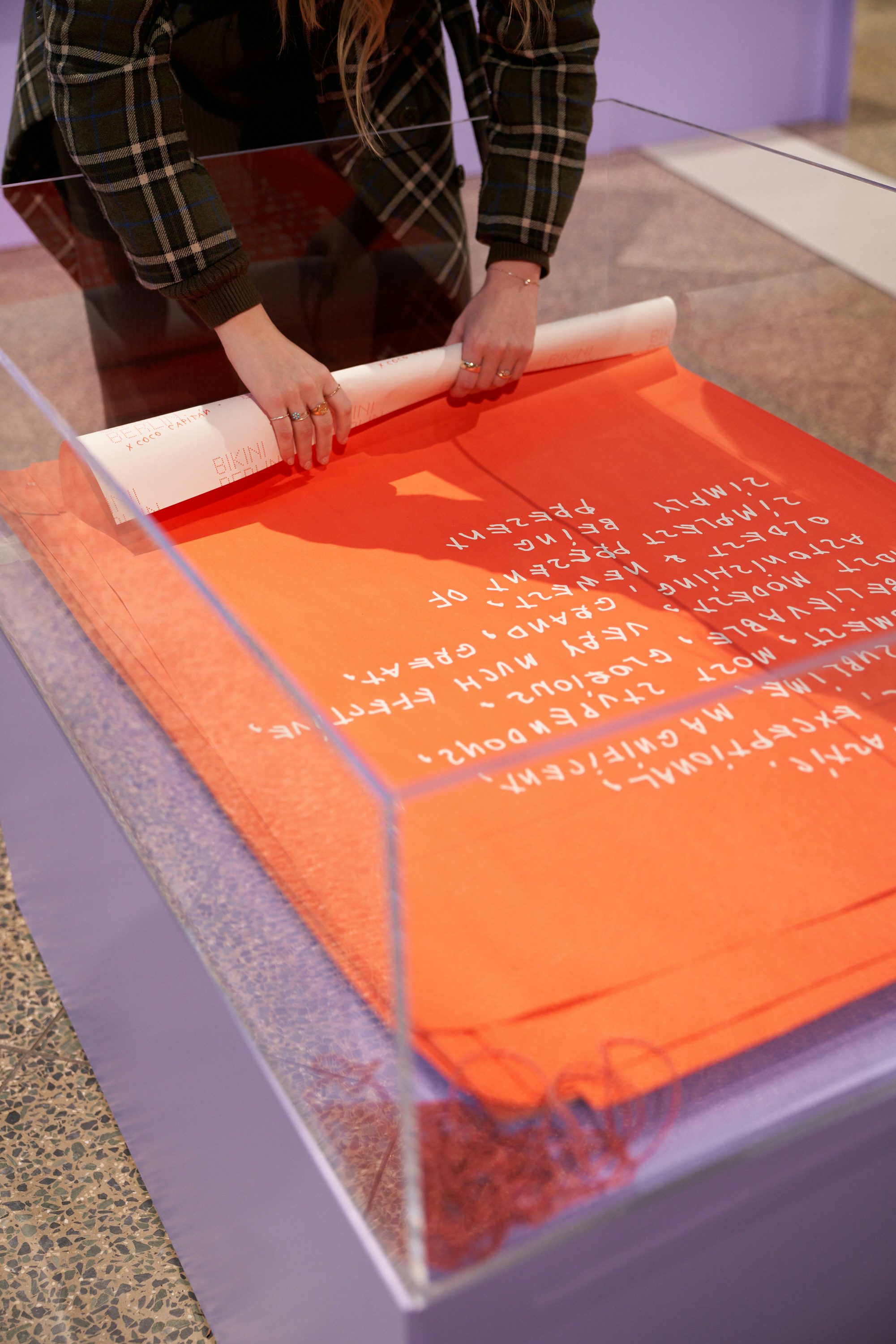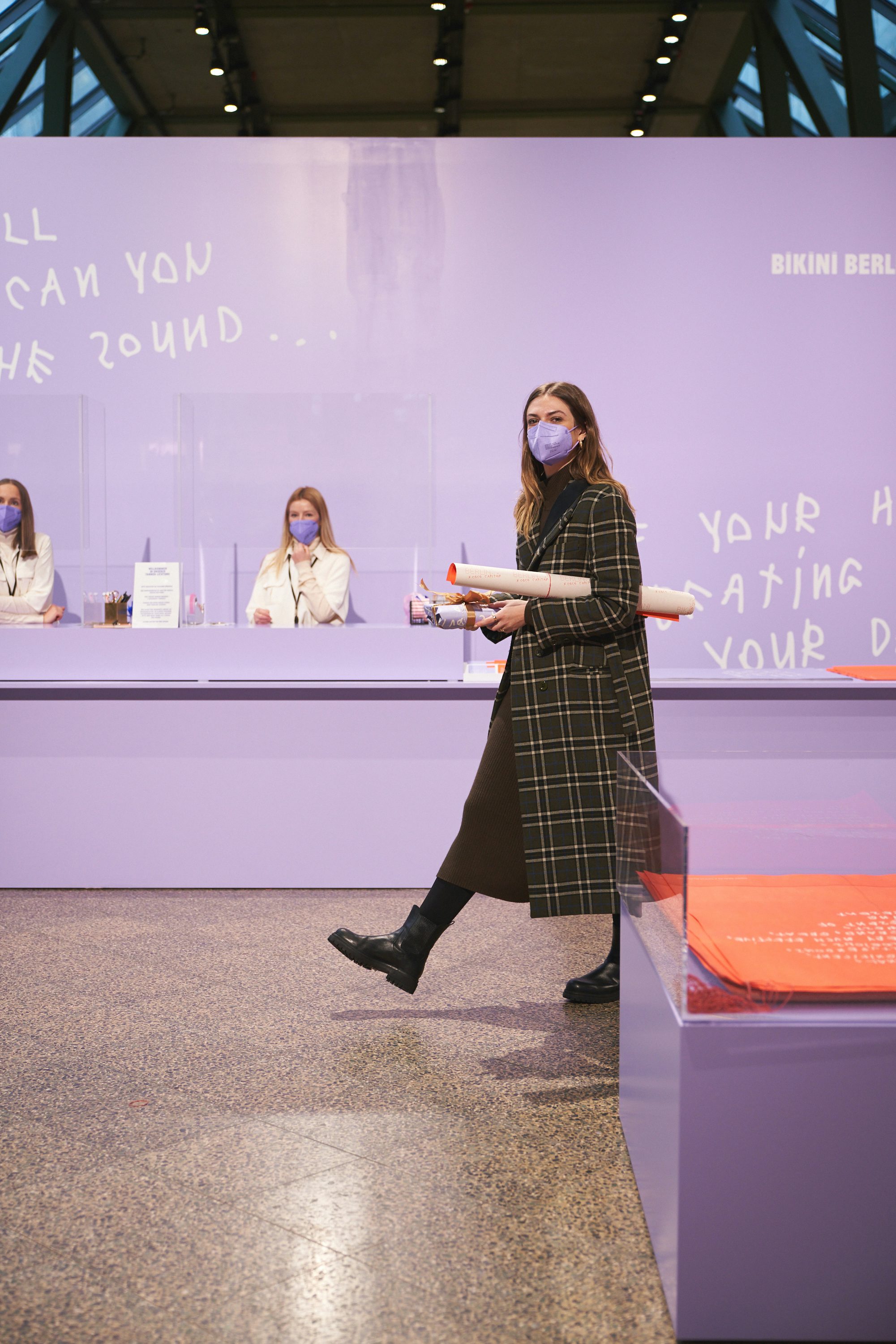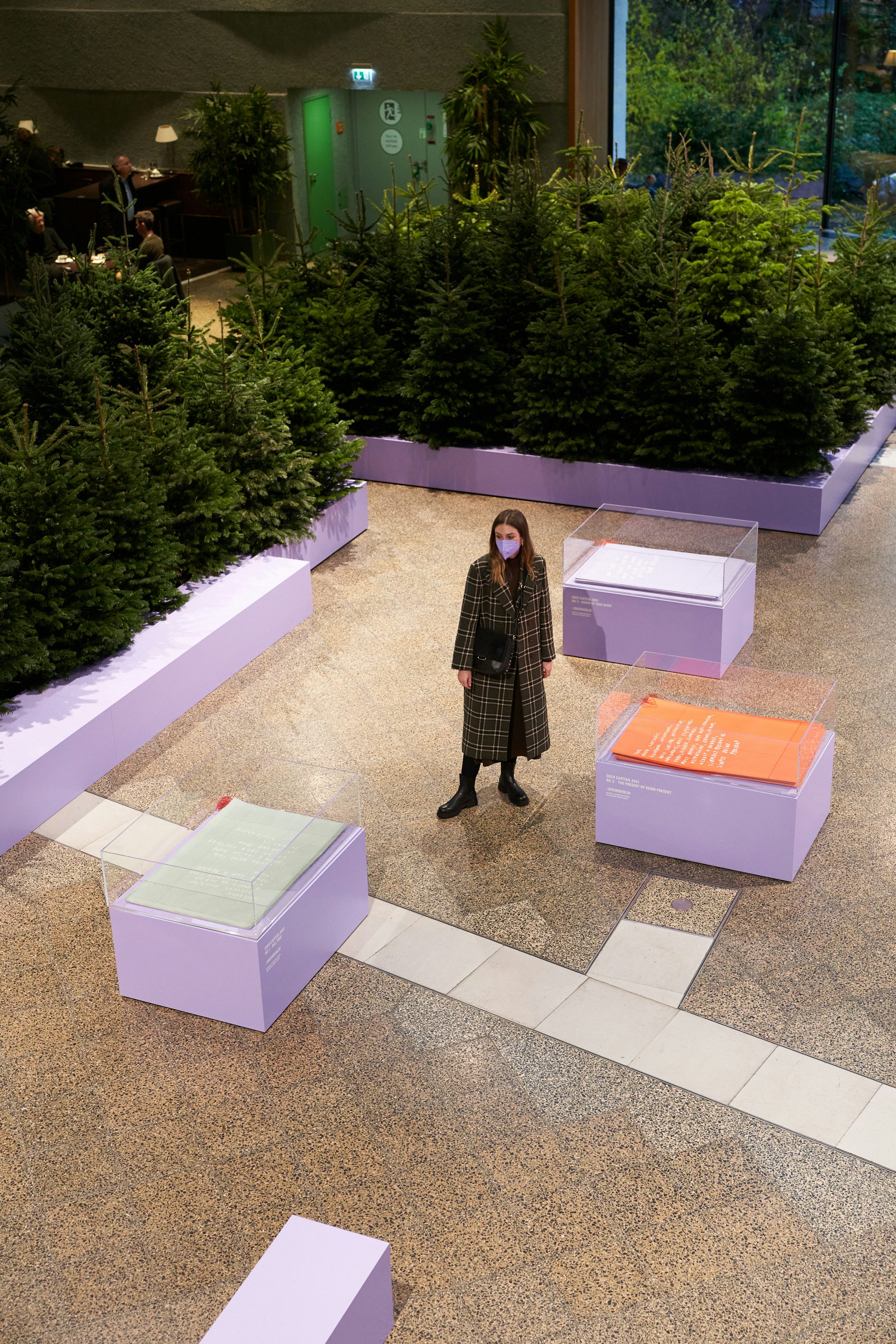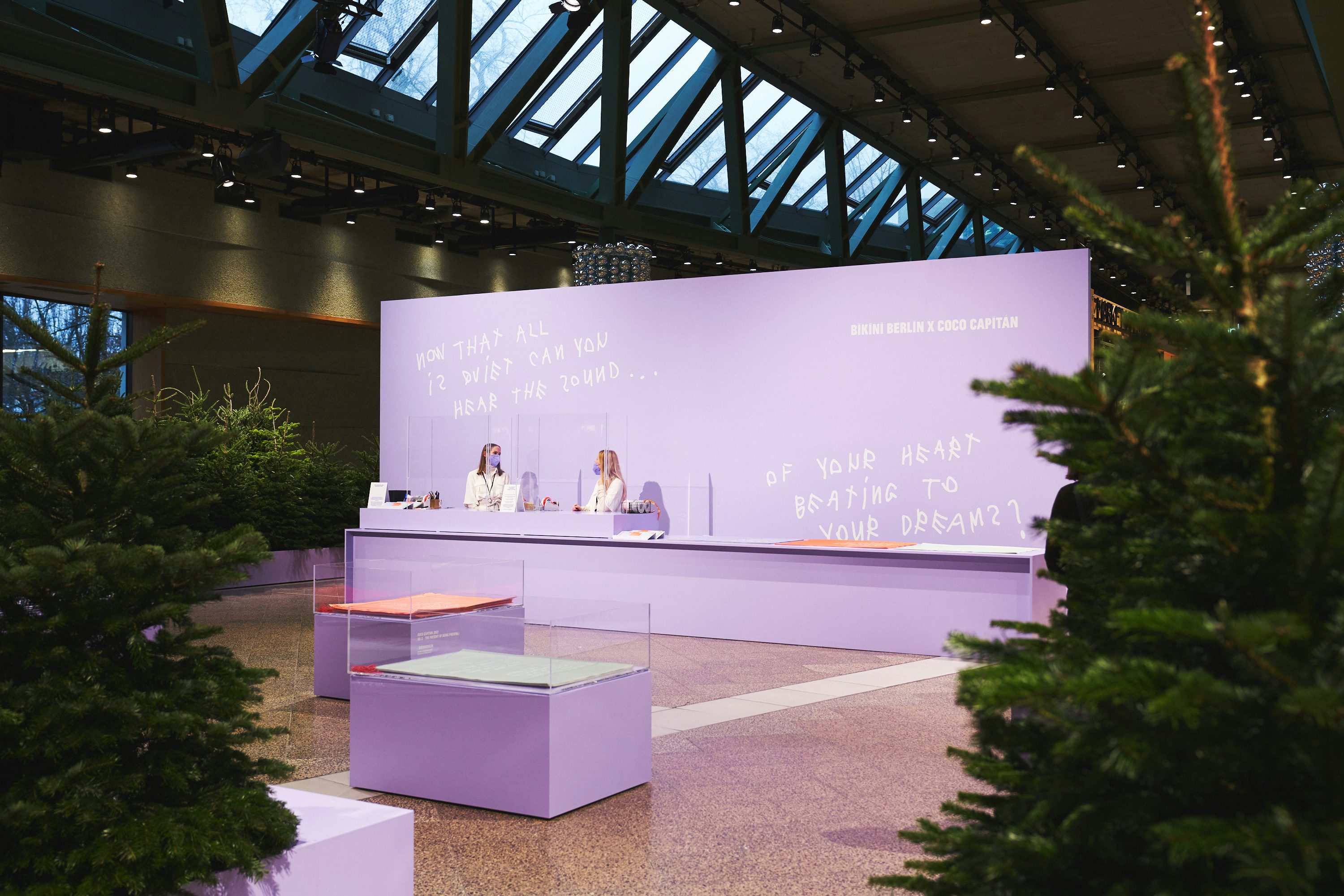 Gestaltet wurde die Installation in Zusammenarbeit mit der spanischen Künstlerin Coco Capitán, sie erinnert an eine Waldlichtung. Denn auf hunderte grüne (gemietete!) Tannen treffen lange Sitzbänke und eine Einpackstation in der Pantone-Farbe 2023: Violett. Darauf geschrieben sind Zitate der Künstlerin, die unsere Gesellschaft, unsere Normen und unser Verständnis von Gemeinsamkeit auf spielerische Art und Weise infrage stellen. Diese Gedanken können sich Kund*innen auch mit nach Hause nehmen, indem sie die nachhaltigen, bedruckten Geschenkbögen einrollen oder sich ihre im BIKINI BERLIN gekauften Produkte an der Einpackstation gleich verpacken lassen.
