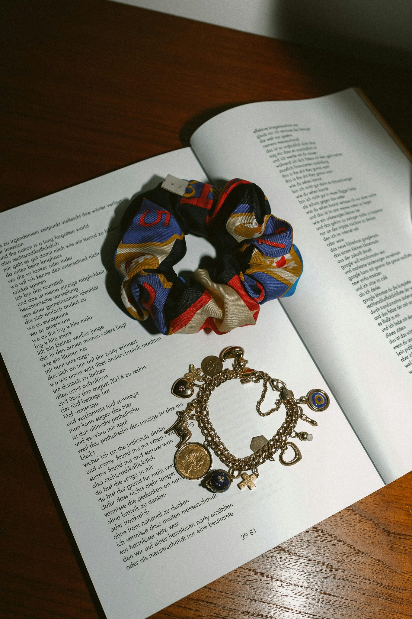 Scrunchies und Bettelarmband. Dieses Foto hätte auch von meiner Mutter aus ihrer Jugend sein können. Ist es aber nur zur Hälfte, denn das Bettelarmband ist wirklich ein Erbstück von ihr, was ich letzte Woche feierlich überreicht bekam, das Scrunchie hingegen ist neu und von James Castle in Zusammenarbeit mit Clare Langhammer aus alten Vintage-Stoffen gefertigt. Ich habe mich in die knalligen Farben eines ehemaligen Chanel-Seidentuchs sofort verliebt und trage seitdem endlich mal wieder Zopf und Dutt.