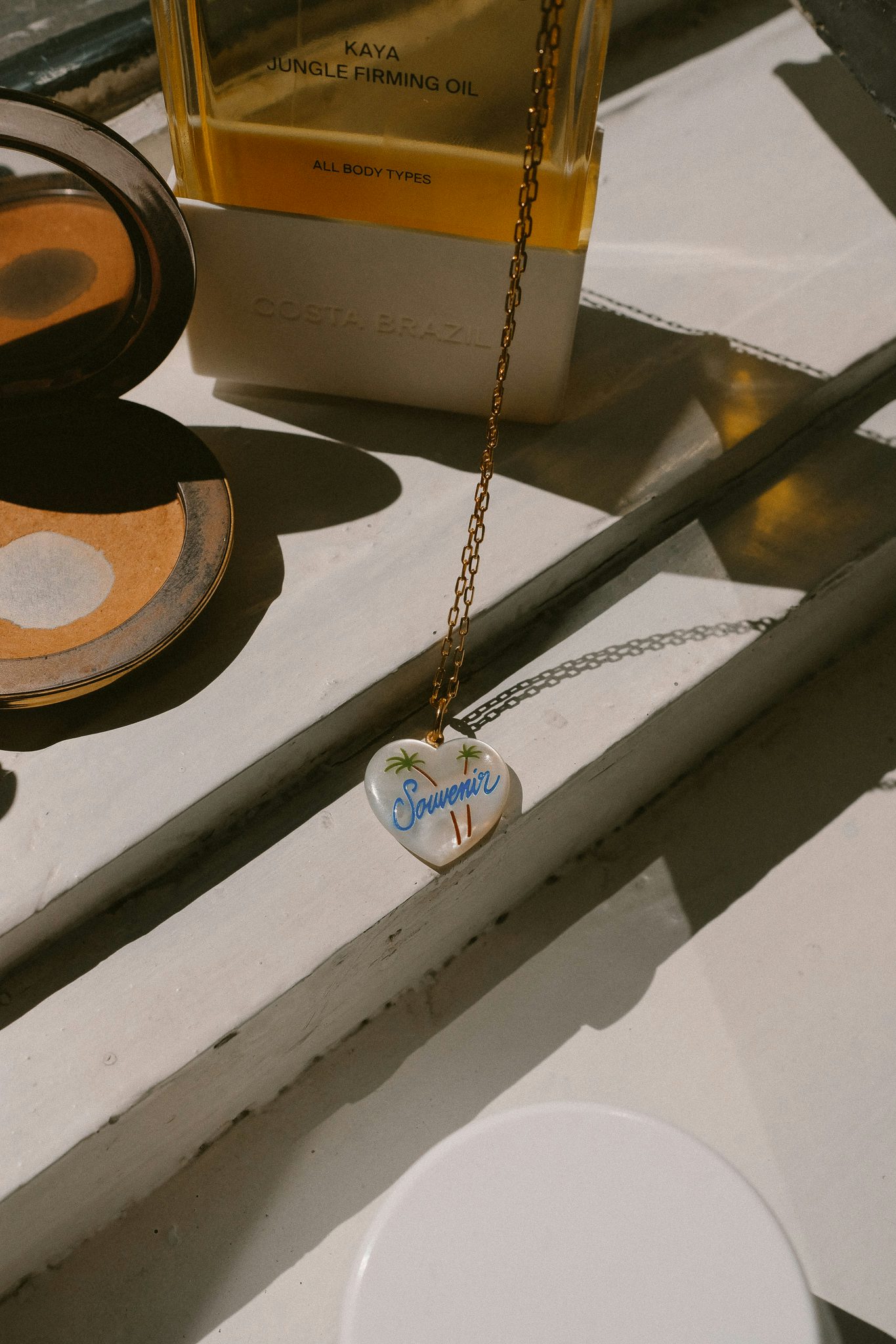 Ein neues Schmuckstück, ohne das ich ebenfalls nicht mehr leben kann? Die Souvenir-Kette aus der neuen Kollektion von Jane Kønig. Ich trage sie jeden Tag und das kleine Herz aus Perlmutt mit zwei Palmen und dem Schriftzug erinnert mich daran, dass wir bald wieder reisen können. Freiheitsgefühl an der Kette? Das ist so gar nicht obsolet, sondern wunderschön!