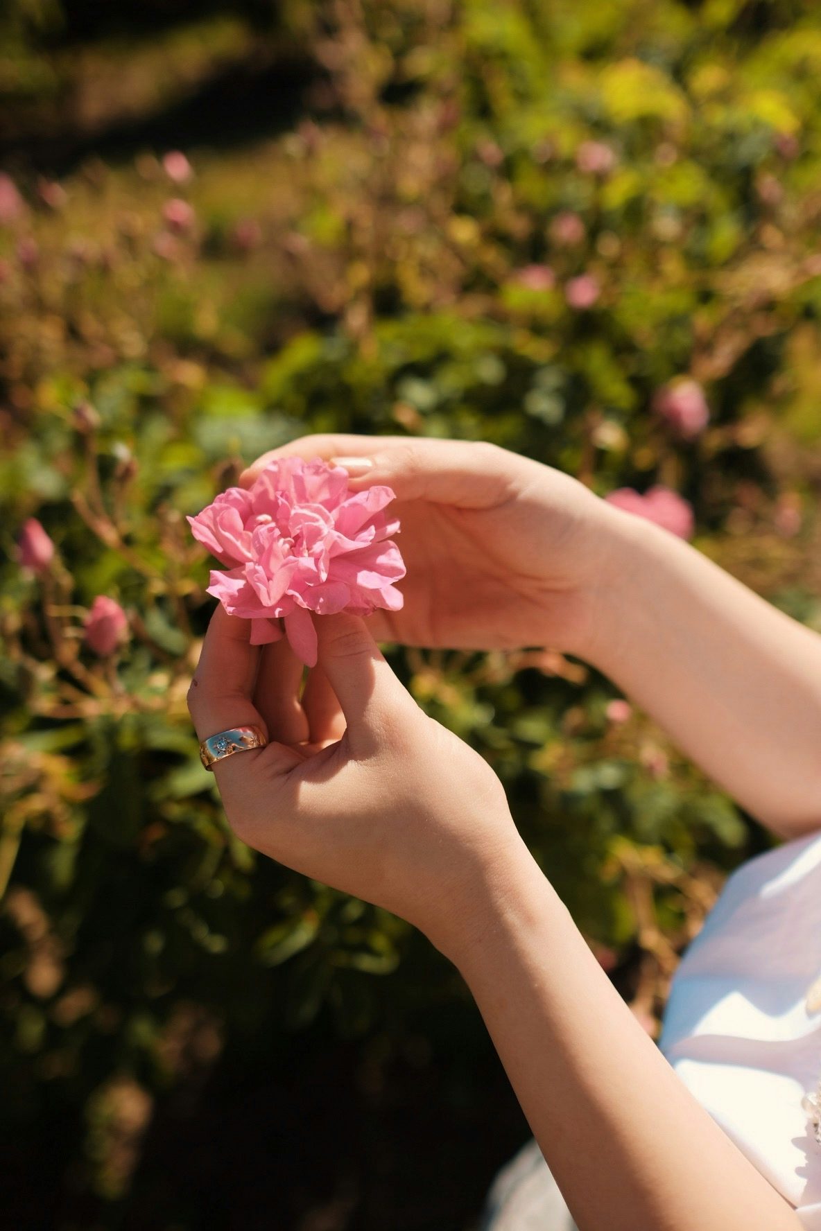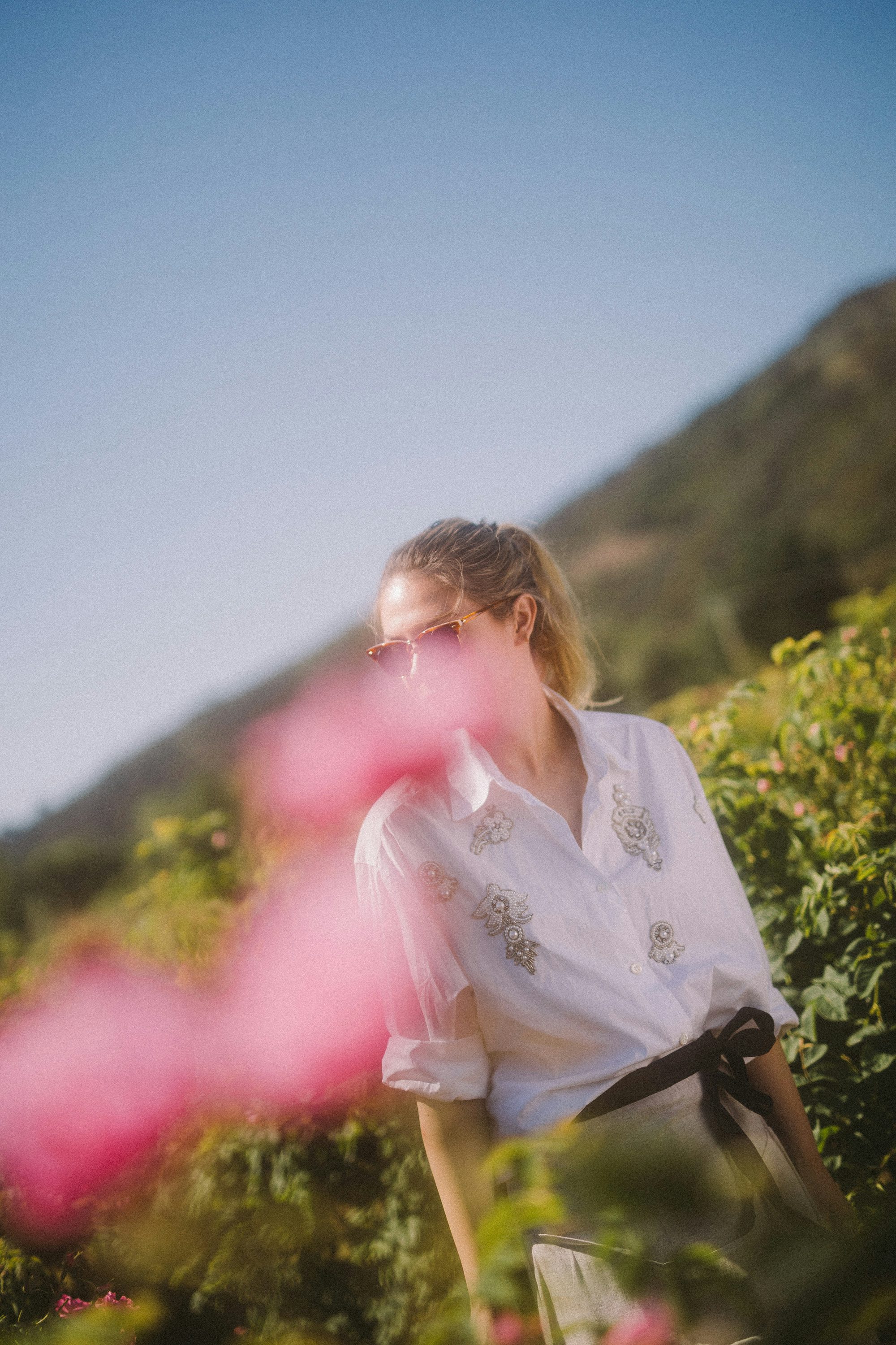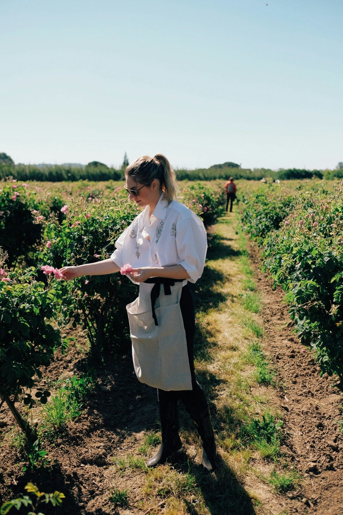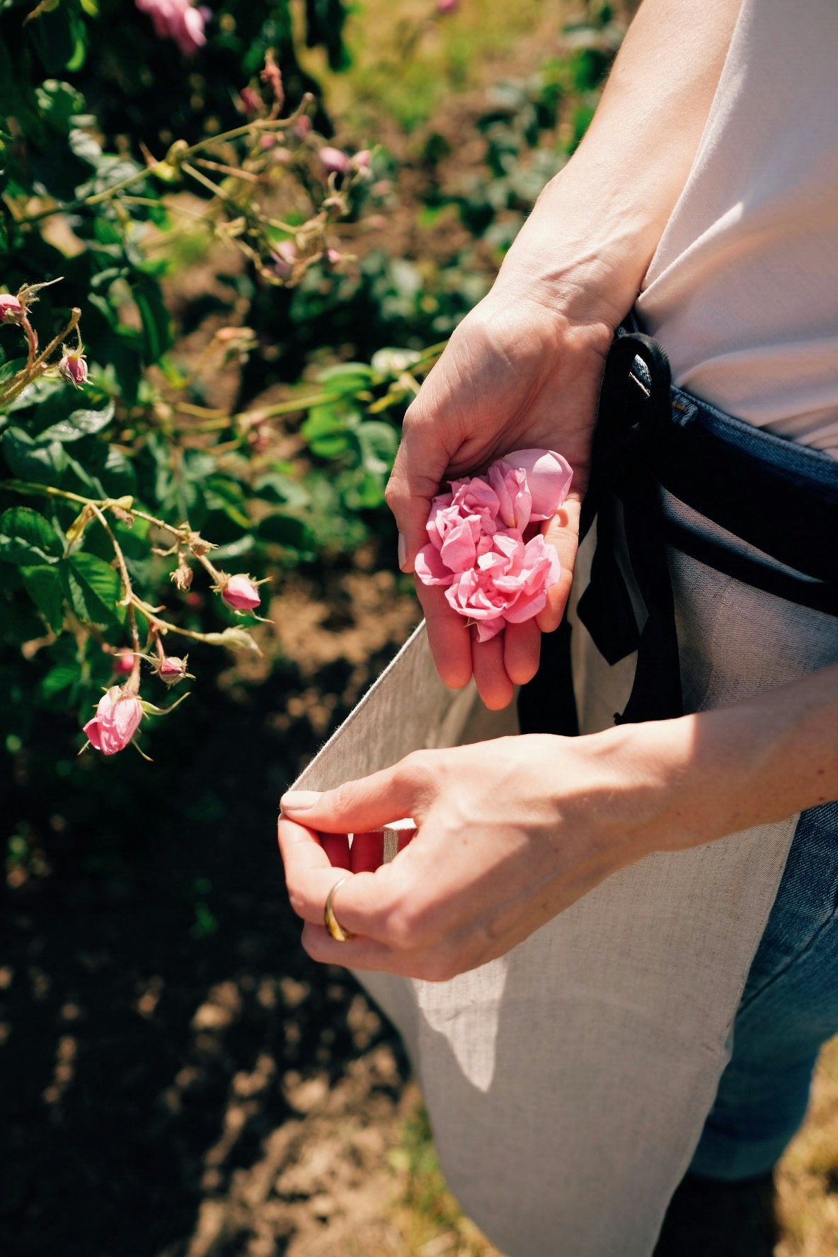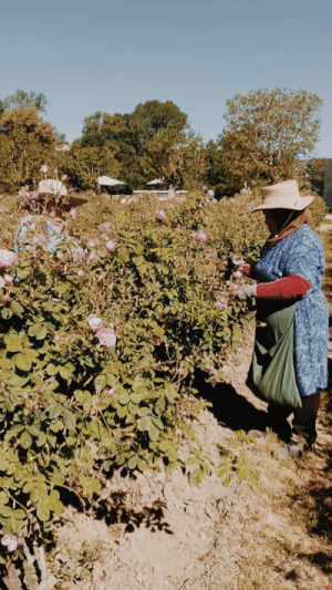 So beginnt er, der Wettlauf gegen die Zeit im Mai. Jeden Morgen, sobald die Sonne hoch über den Feldern steht und sich die Blüten im Anblick der Wärme geöffnet haben, gehen die Pflücker*innen durch die Felder und ziehen behutsam die Rosen von den Sträuchern. Die richtige Ausstattung, die es dazu braucht? Gummistiefel, Lederhandschuhe, die vor den Stichen der Bienen schützen und eine Schürze aus Leinen, die die Blüten nicht beschädigt. Kleine Matheaufgabe: Ein Kilogramm Rosen besteht aus 350 Blüten und pro Stunde erntet ein*e Pflücker*in fünf Kilogramm Blumen. Na, wie viele Blüten hat sie dann in ihren*seinen Händen gehabt? Richtig, bei einem Arbeitstag von acht Stunden sind das 14.000 Blüten.
